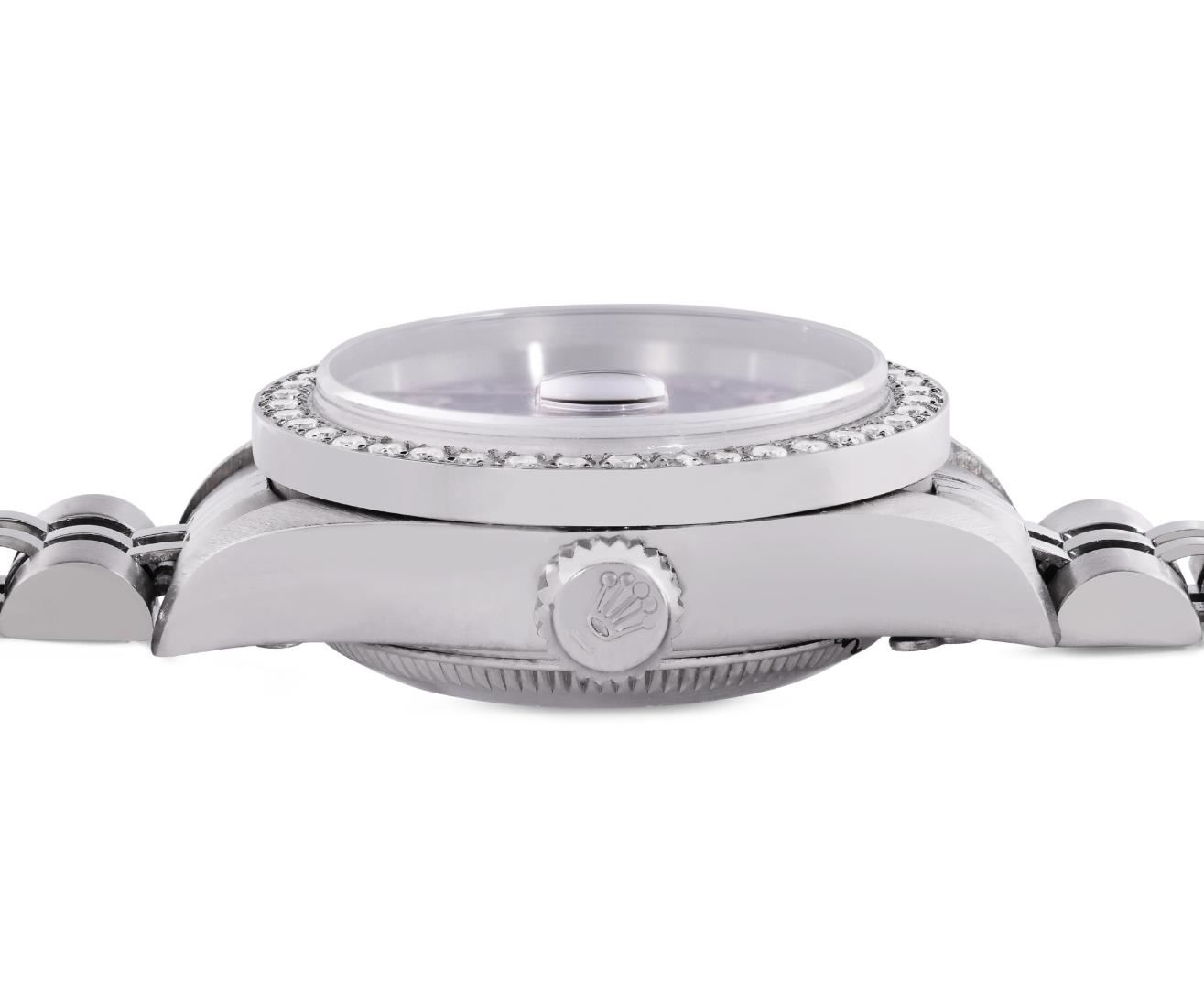 One Rolex Ladies Pre Owned Quickset Stainless Steel Date Wristwatch Polished Bright with Satin Finish, Serviced & Electronically Tested, Stainless Steel Case: 26mm, Stainless Steel Crown, Custom Bezel: New Stainless Steel Beadset Diamond Bezel, Diamond Count: 40 Diamonds On Bezel. Custom Crystal: New Sapphire With Magnified Date Window. Custom Hands: New Non Luminescent Hands. Rolex Movement: 2235 Automatic Winding Movement. Rolex Dial: Factory Blue With Roman Hour Markers, Square Track. Date Window: 3 O'Clock Position Date Display, Model: Quickset Date. Condition: G-6 Extra Fine. Rolex Bracelet: Stainless Steel Jubilee Band. Bright Polish And Satin Finish. 6.0 Inch Length, Adjustable. Standard Clasp, With Rolex Logo. This Watch Has Been Serviced And Time Tested. It Is In Excellent Condition, Free Of All Scratches And Dents.
