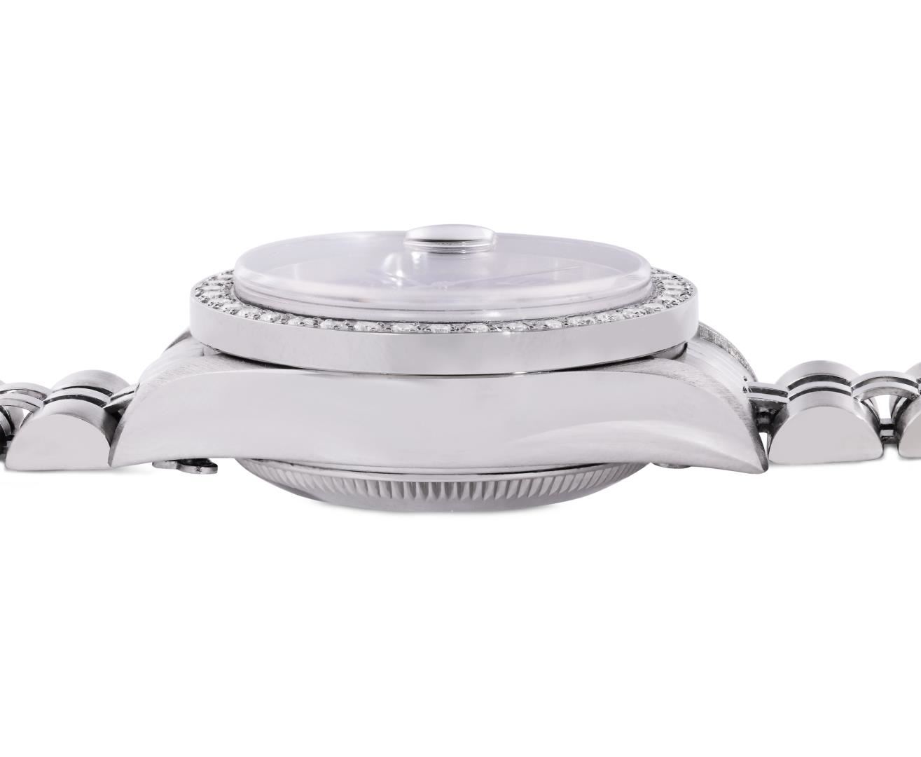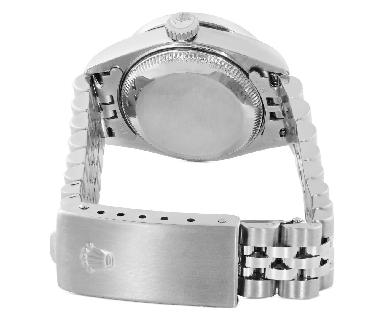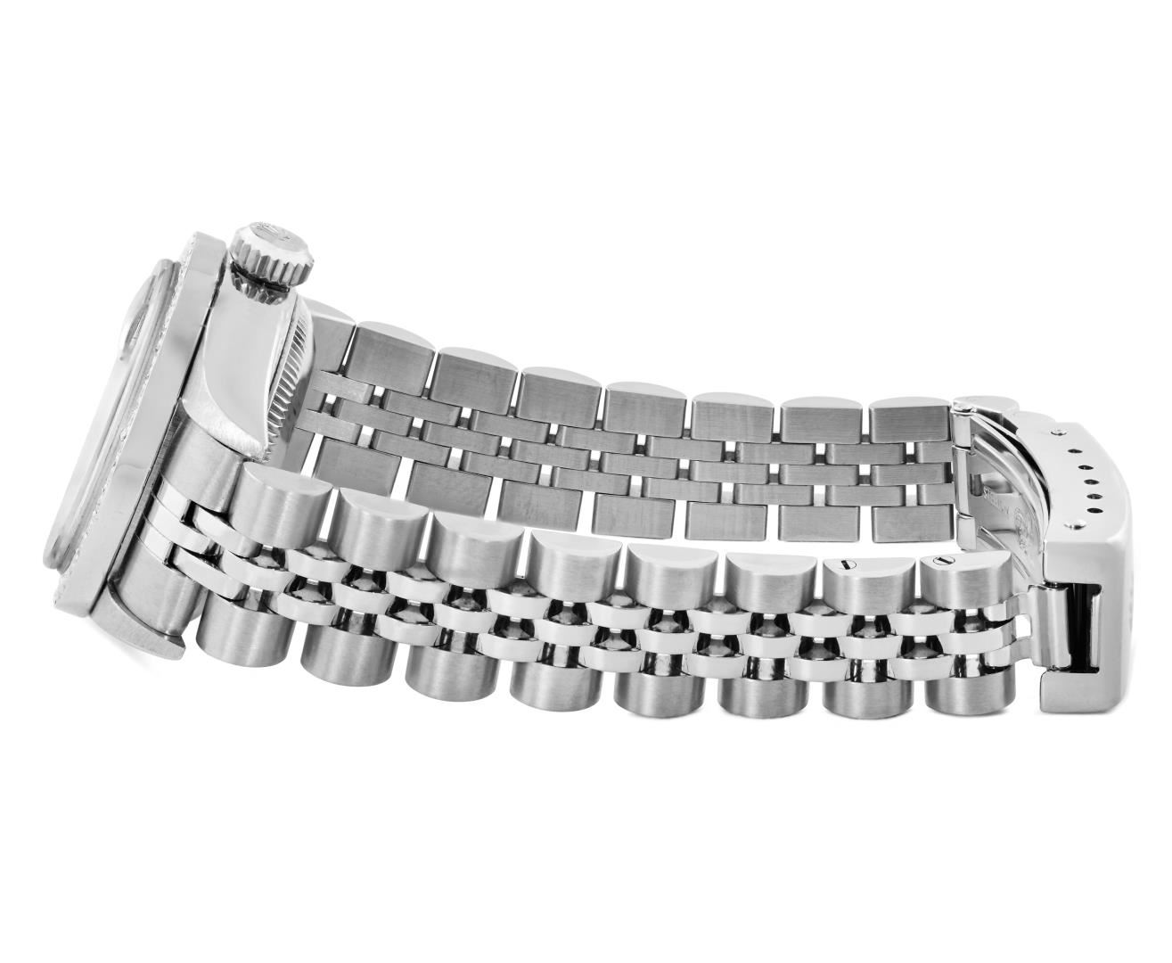One Rolex Ladies Pre Owned Quickset Stainless Steel Date Wristwatch Polished Bright with Satin Finish, Serviced & Electronically Tested, Stainless Steel Case: 26mm, Stainless Steel Crown, Custom Bezel: New Stainless Steel Beadset Diamond Bezel, Diamond Count: 40 Diamonds On Bezel. Custom Crystal: New Sapphire With Magnified Date Window. Custom Hands: New Non Luminescent Hands. Rolex Movement: 2235 Automatic Winding Movement. Rolex Dial: Factory Blue With Roman Hour Markers, Square Track. Date Window: 3 O'Clock Position Date Display, Model: Quickset Date. Condition: G-6 Extra Fine. Rolex Bracelet: Stainless Steel Jubilee Band. Bright Polish And Satin Finish. 6.0 Inch Length, Adjustable. Standard Clasp, With Rolex Logo. This Watch Has Been Serviced And Time Tested. It Is In Excellent Condition, Free Of All Scratches And Dents.