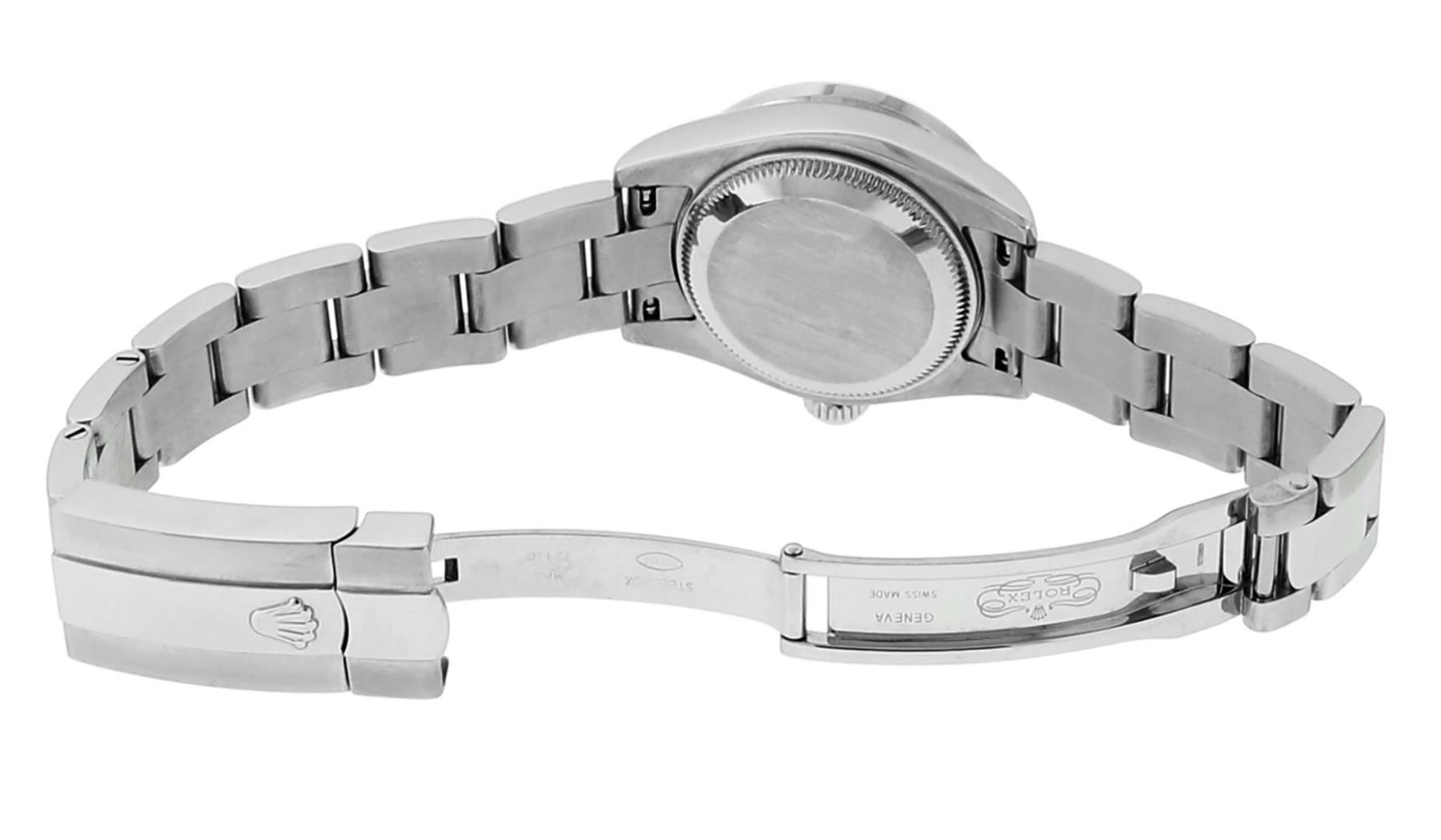 One Pre Owned Quickset Ladies Stainless Steel Rolex Datejust Polished Bright with Satin Finish, Serviced & Electronically Tested, Stainless Steel Case: 26mm, Stainless Steel Crown, Custom Bezel: New 18K White Gold Pyramid Diamond Bezel, Stone Count: 24 Di