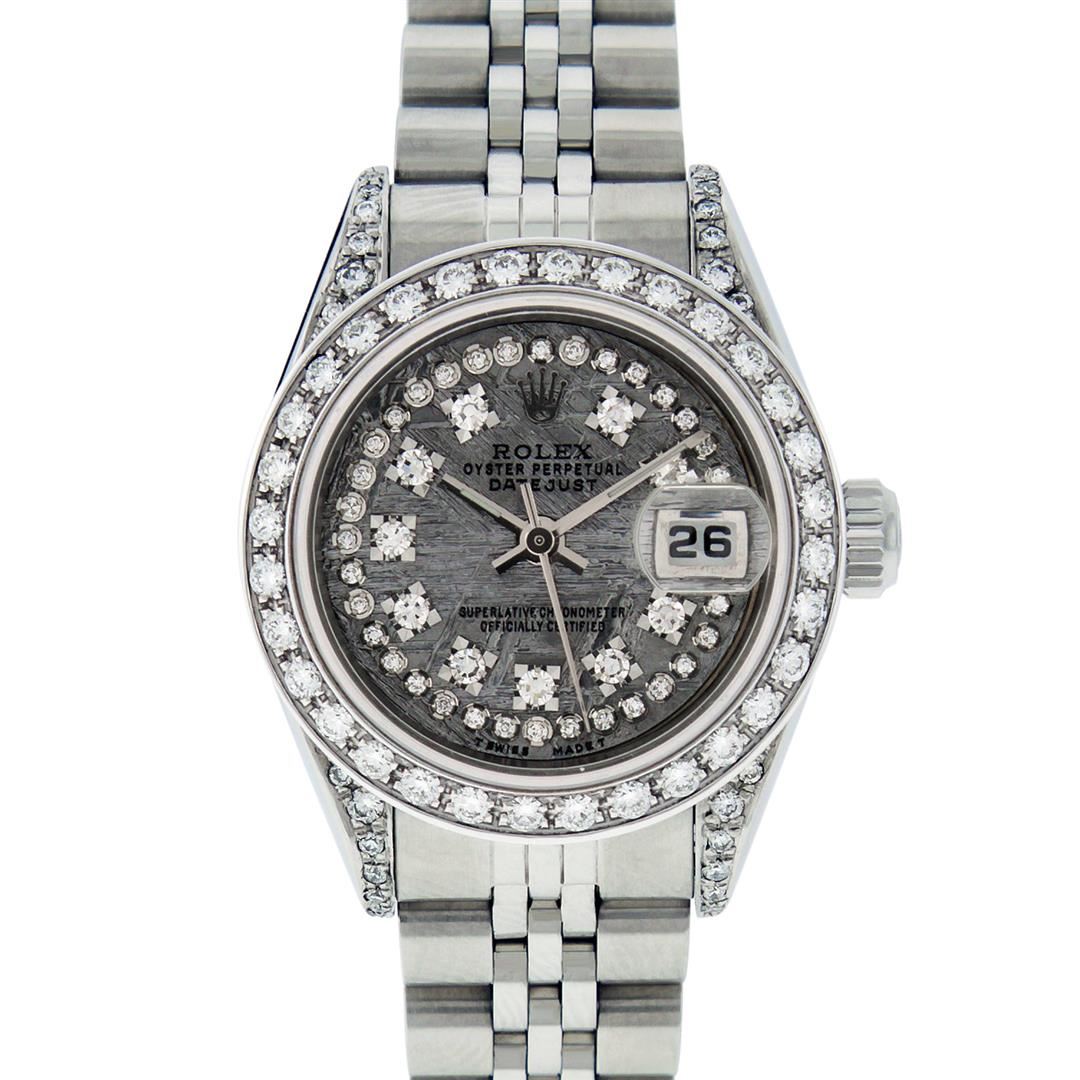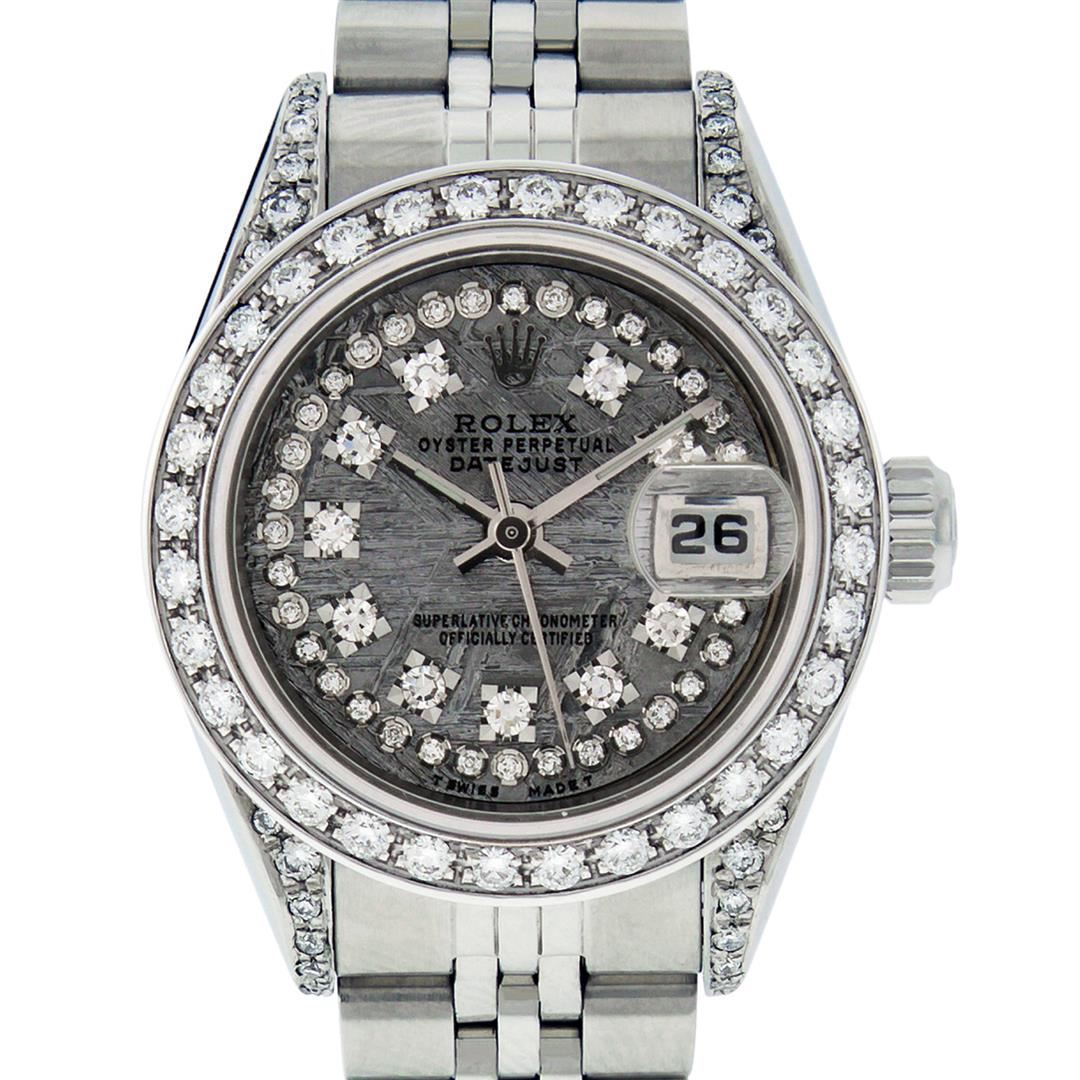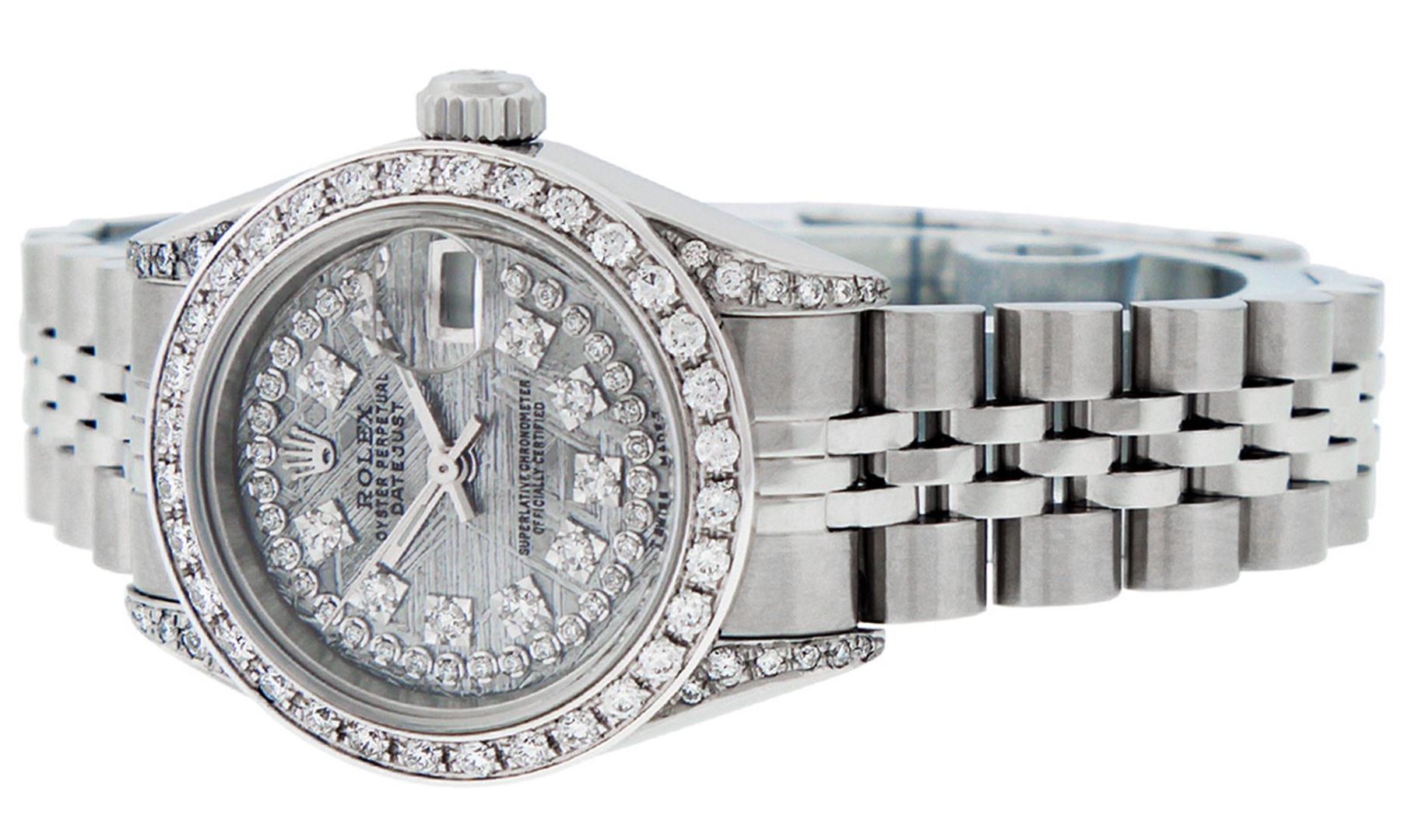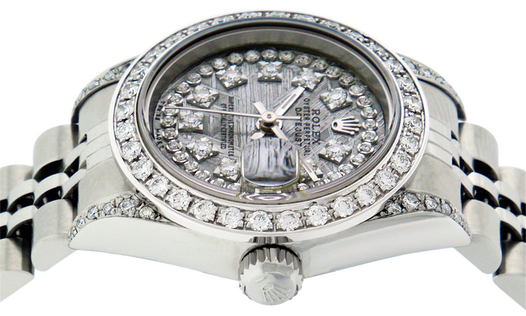 One Quickset Ladies Stainless Steel Rolex Datejust Polished Bright with Satin Finish, Serviced & Electronically Tested, Stainless Steel Case: 26mm, Stainless Steel Crown, Custom Diamond Lugs: 24 Diamonds On Lugs, Clarity: SI-VS, Color: G to H. Custom Bezel: New Stainless Steel Beadset Diamond Bezel, Stone Count: 39 Diamonds On Bezel, Total Weight .70 Carat, Clarity: SI-VS, Color: G to H. Custom Crystal: New Scratch Resistant Synthetic Sapphire Cyclops Lens. Custom Hands: New Luminescent Hands. Movement: Automatic Winding Movement Caliber 2235. Custom Dial: Refinished Single Cut Meteorite String Diamond Dial, 43 Diamonds in Dial G To H In Color, Clarity: VS. Date Window: 3 O'Clock Position Date Display, Model: 79174 Quickset Datejust. Condition: G-6 Extra Fine. Bracelet: Stainless Steel Jubilee Band. Bright Polish & Satin Finish. 6.0 Inch Length, Adjustable. Standard Clasp, With Rolex Logo. This Watch Has Been Serviced Time Tested And Is In Excellent Condition It Is Free Of All Scratches And Dents. This Watch Comes With A Rolex Box.