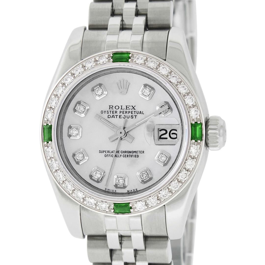 One Quickset Ladies Stainless Steel Rolex Datejust Polished Bright with Satin Finish, Serviced & Electronically Tested, Stainless Steel Case: 26mm, Stainless Steel Crown, Custom Bezel: New 18K White Gold Beadset + Emerald Diamond Bezel, Stone Count: 28 Diamonds + 4 Emeralds On Bezel, Total Weight .70 Carat, Clarity: SI-VS, Color: G to H. Custom Crystal: New Scratch Resistant Synthetic Sapphire Cyclops Lens. Custom Hands: New Luminescent Hands. Movement: Automatic Winding Movement Caliber 2235. Custom Dial: Refinished Mother Of Pearl Diamond Dial, Stone Count: 10 Diamonds On Dial, G To H In Color, Clarity: VS. Date Window: 3 O'Clock Position Date Display, Model: 179160 Quickset Datejust. Condition: G-6 Extra Fine. Bracelet: Stainless Steel Jubilee Band. Bright Polish & Satin Finish. 6.0 Inch Length, Adjustable. Standard Clasp, With Rolex Logo. This Watch Has Been Serviced Time Tested And Is In Excellent Condition It Is Free Of All Scratches And Dents. This Watch Comes With A Rolex Box.