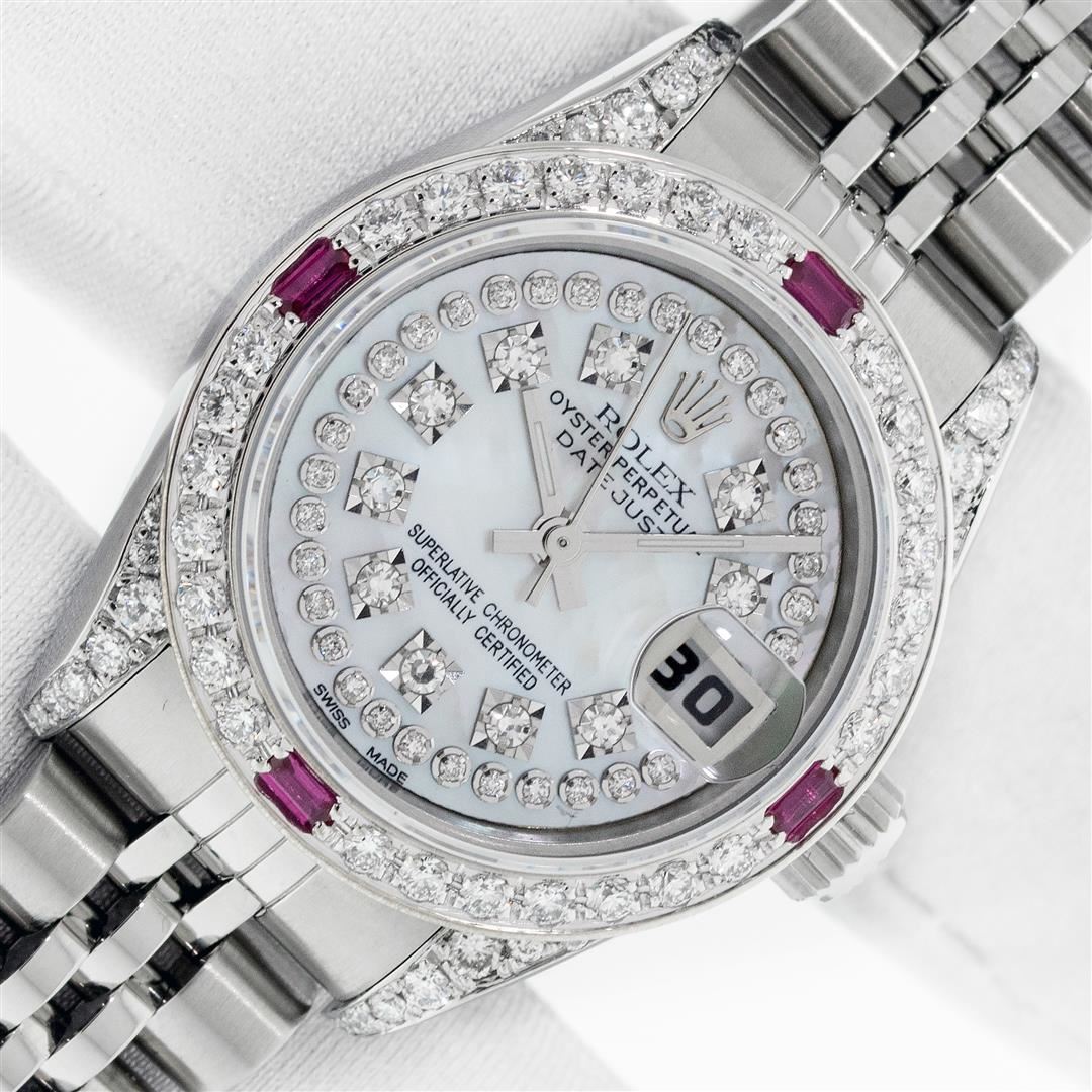 One Quickset Ladies Stainless Steel Rolex Datejust Polished Bright with Satin Finish, Serviced & Electronically Tested, Rolex Stainless Steel Case: 26mm, Rolex Stainless Steel Crown, Custom Diamond Lugs: 24 Diamonds On Lugs, Clarity: SI-VS, Color: G to H. Custom Bezel: New 18K White Gold Diamond + Ruby Beadset Diamond Bezel, Stone Count: 28 Diamonds + 4 Rubies, Total Weight .70 Carat, Clarity: SI-VS, Color: G to H. Custom Crystal: New Sapphire With Magnified Date Window. Custom Hands: New Luminescent Hands. Rolex Movement: Automatic Winding Movement. Custom Dial: Mother Of Pearl String Diamond Dial, 43 Diamonds in Dial G To H In Color, Clarity: VS. Date Window: 3 O'clock Position Date Display, Model: Quickset Datejust. Condition: G-6 Extra Fine. Rolex Bracelet: Stainless Steel Jubilee Band. Bright Polish & Satin Finish. 6.0 Inch Length, Adjustable. Standard Clasp, With Rolex Logo. This Pre Owned Watch Has Been Serviced Time Tested And Is In Excellent Condition It Is Free Of All Scratches And Dents. This Watch Comes With A Rolex Box.