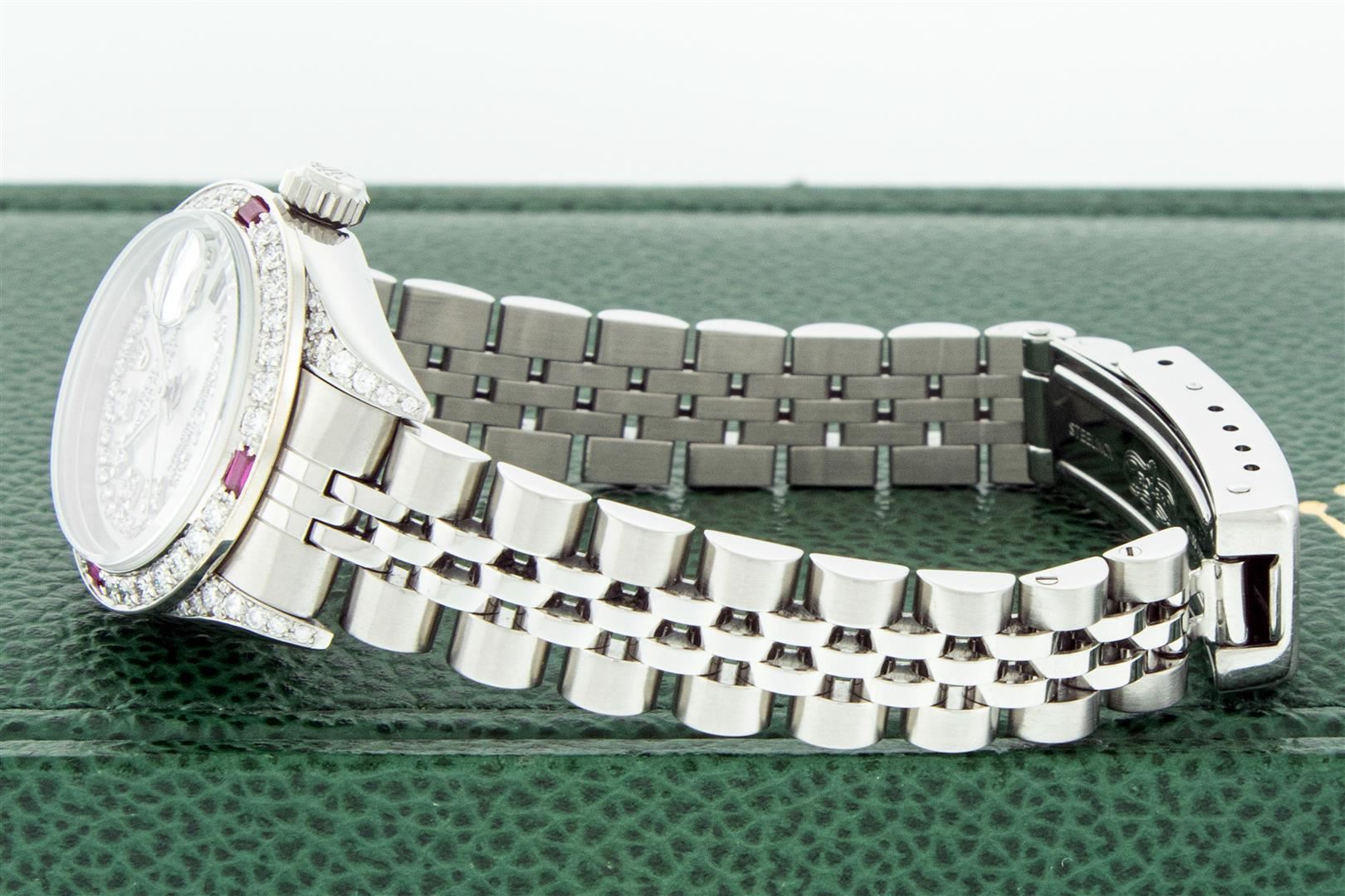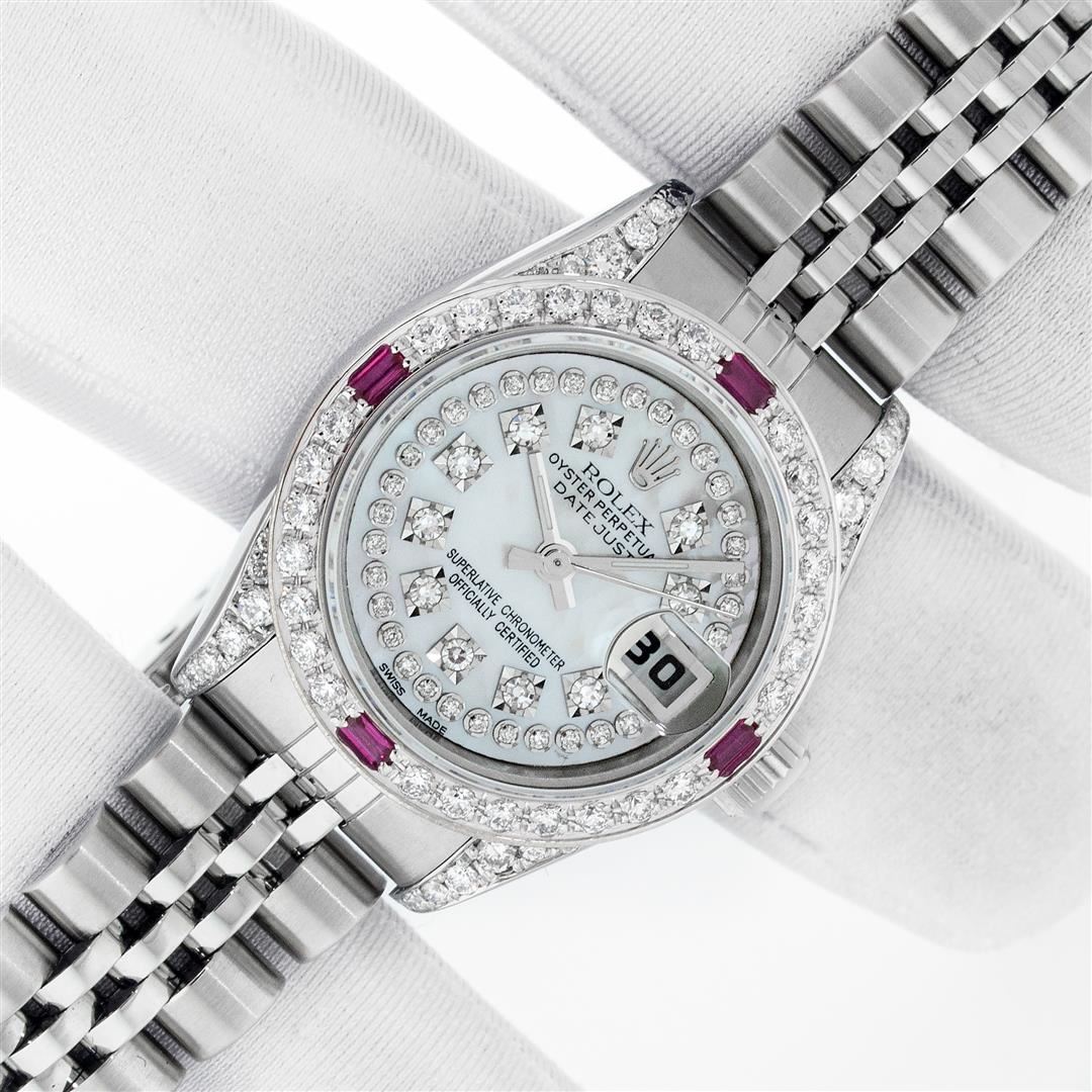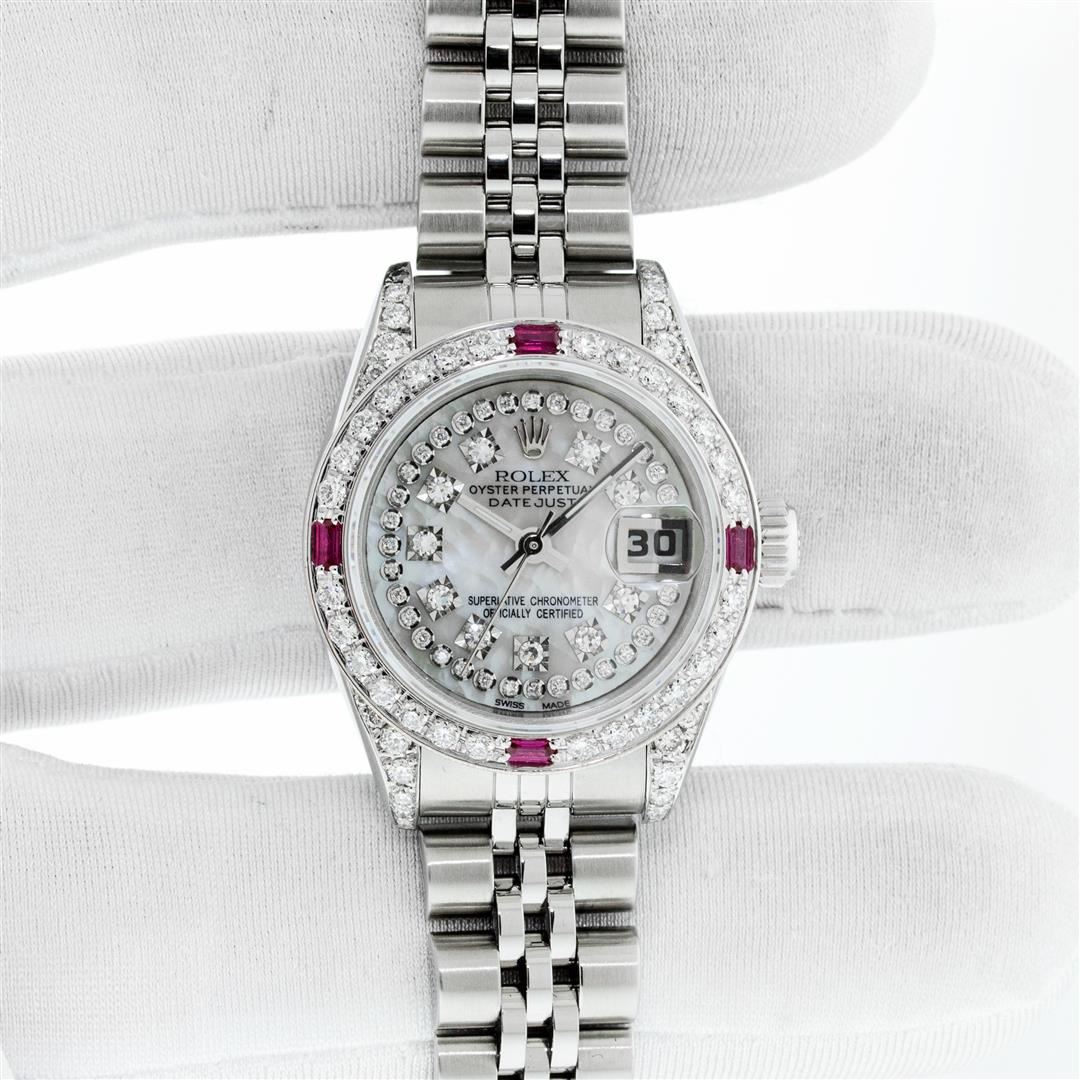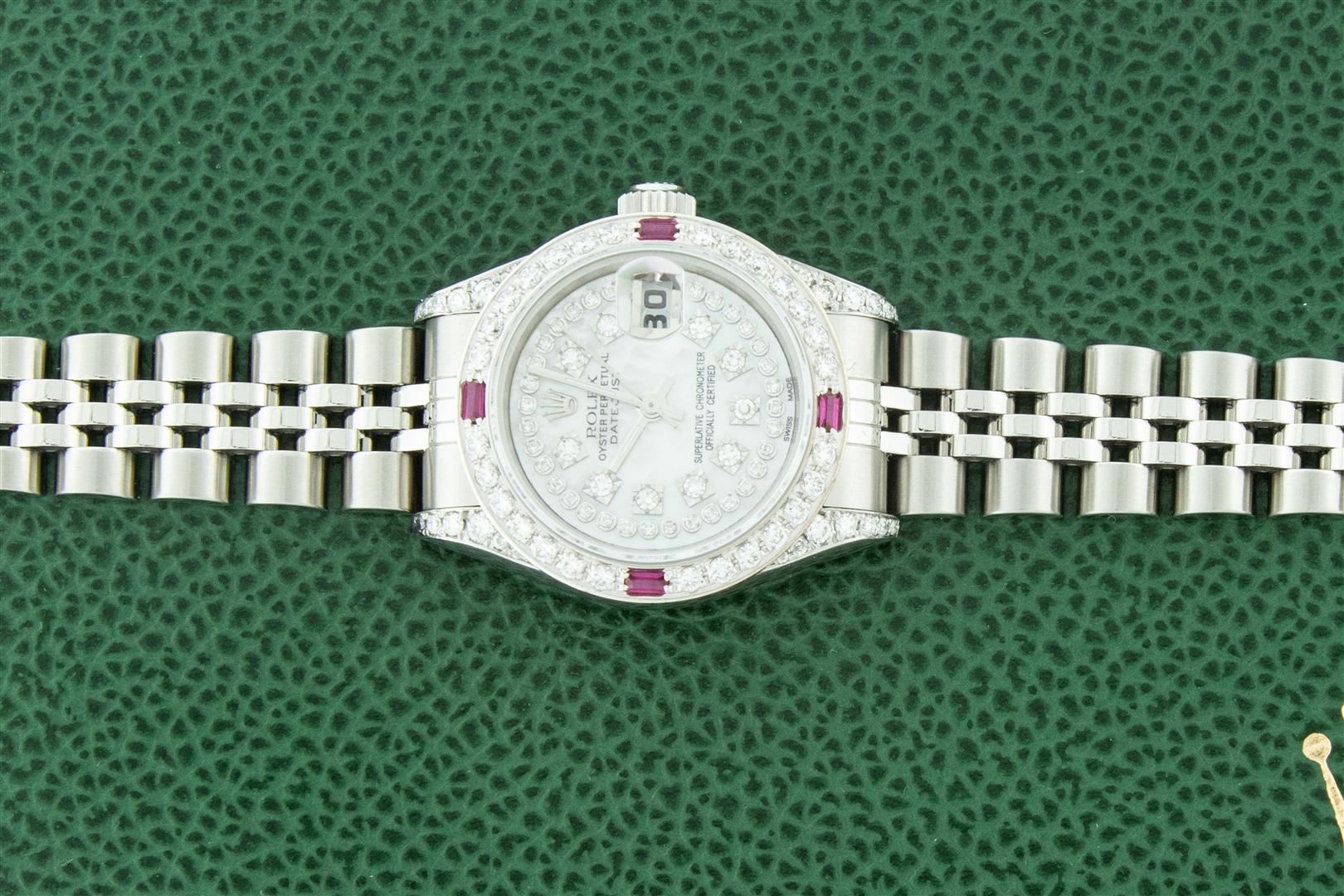 One Quickset Ladies Stainless Steel Rolex Datejust Polished Bright with Satin Finish, Serviced & Electronically Tested, Rolex Stainless Steel Case: 26mm, Rolex Stainless Steel Crown, Custom Diamond Lugs: 24 Diamonds On Lugs, Clarity: SI-VS, Color: G to H. Custom Bezel: New 18K White Gold Diamond + Ruby Beadset Diamond Bezel, Stone Count: 28 Diamonds + 4 Rubies, Total Weight .70 Carat, Clarity: SI-VS, Color: G to H. Custom Crystal: New Sapphire With Magnified Date Window. Custom Hands: New Luminescent Hands. Rolex Movement: Automatic Winding Movement. Custom Dial: Mother Of Pearl String Diamond Dial, 43 Diamonds in Dial G To H In Color, Clarity: VS. Date Window: 3 O'clock Position Date Display, Model: Quickset Datejust. Condition: G-6 Extra Fine. Rolex Bracelet: Stainless Steel Jubilee Band. Bright Polish & Satin Finish. 6.0 Inch Length, Adjustable. Standard Clasp, With Rolex Logo. This Pre Owned Watch Has Been Serviced Time Tested And Is In Excellent Condition It Is Free Of All Scratches And Dents. This Watch Comes With A Rolex Box.