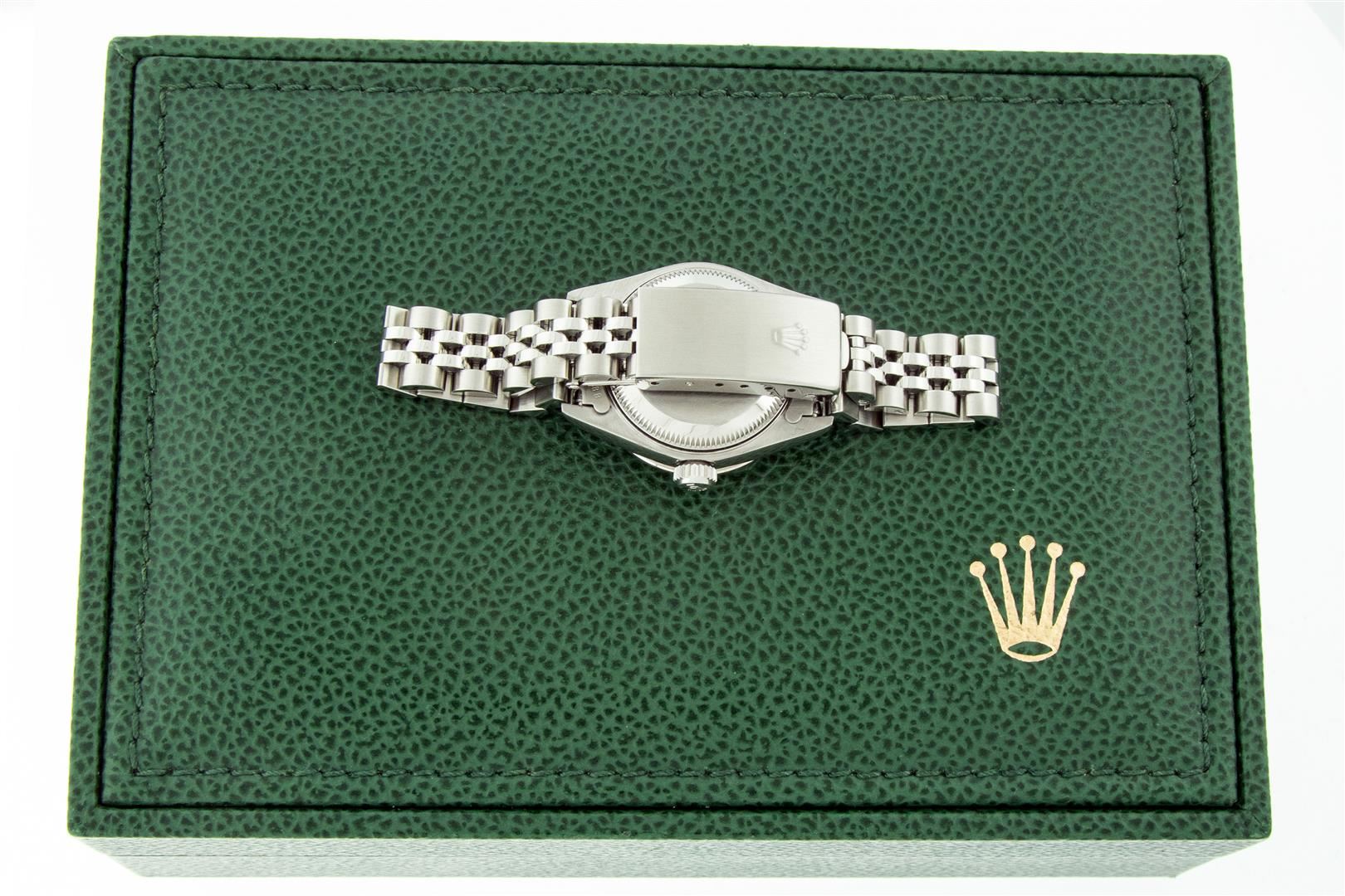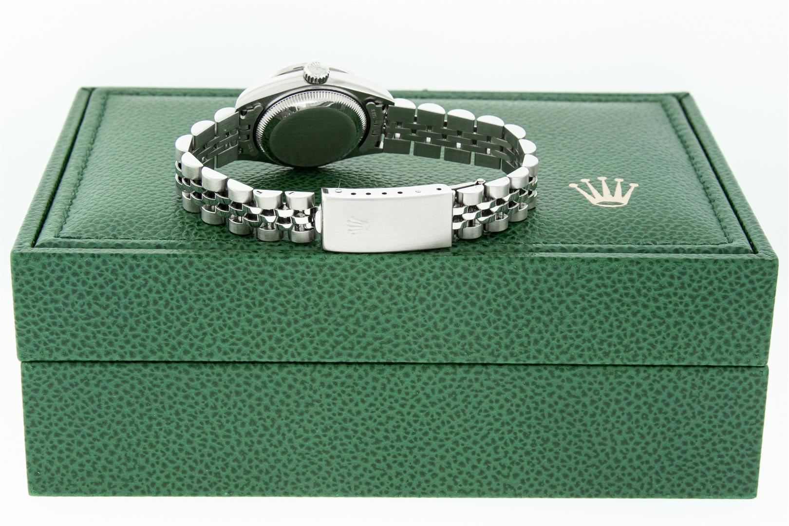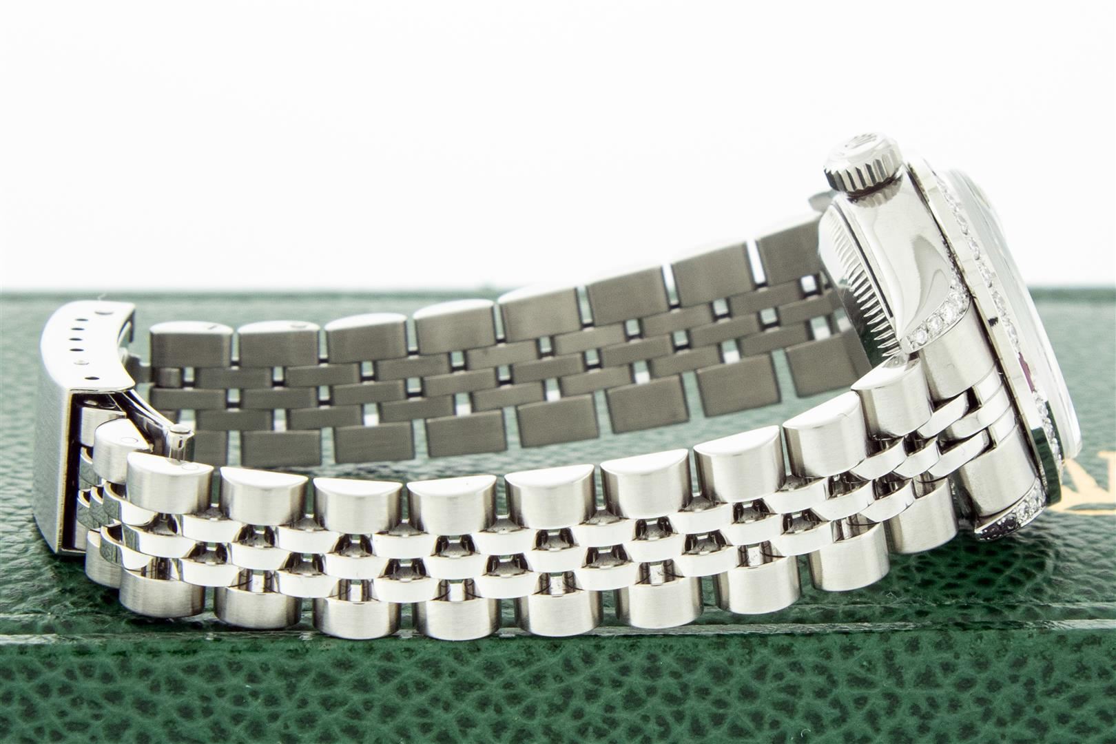 One Quickset Ladies Stainless Steel Rolex Datejust Polished Bright with Satin Finish, Serviced & Electronically Tested, Rolex Stainless Steel Case: 26mm, Rolex Stainless Steel Crown, Custom Diamond Lugs: 24 Diamonds On Lugs, Clarity: SI-VS, Color: G to H. Custom Bezel: New 18K White Gold Diamond + Ruby Beadset Diamond Bezel, Stone Count: 28 Diamonds + 4 Rubies, Total Weight .70 Carat, Clarity: SI-VS, Color: G to H. Custom Crystal: New Sapphire With Magnified Date Window. Custom Hands: New Luminescent Hands. Rolex Movement: Automatic Winding Movement. Custom Dial: Mother Of Pearl String Diamond Dial, 43 Diamonds in Dial G To H In Color, Clarity: VS. Date Window: 3 O'clock Position Date Display, Model: Quickset Datejust. Condition: G-6 Extra Fine. Rolex Bracelet: Stainless Steel Jubilee Band. Bright Polish & Satin Finish. 6.0 Inch Length, Adjustable. Standard Clasp, With Rolex Logo. This Pre Owned Watch Has Been Serviced Time Tested And Is In Excellent Condition It Is Free Of All Scratches And Dents. This Watch Comes With A Rolex Box.