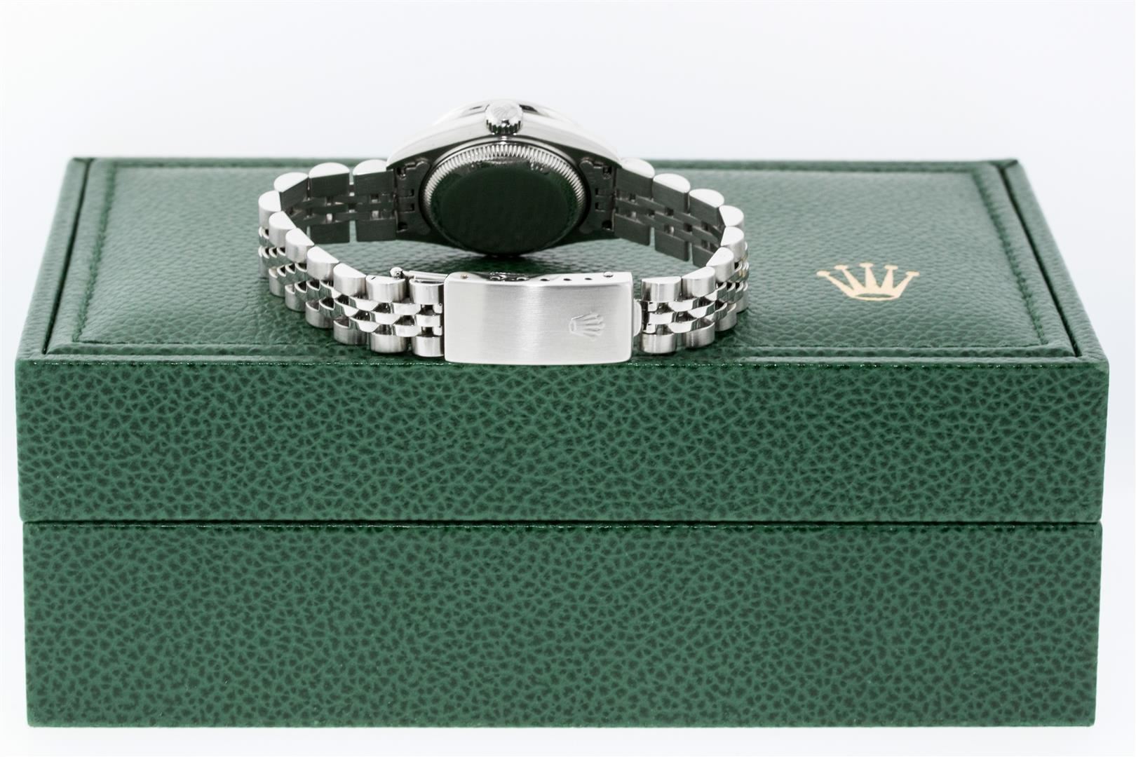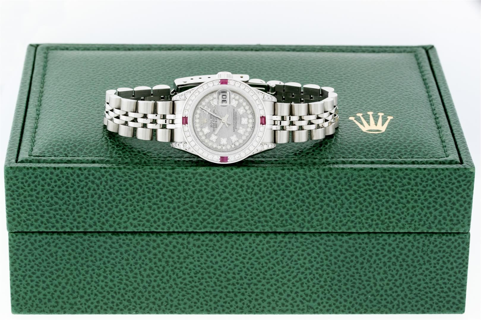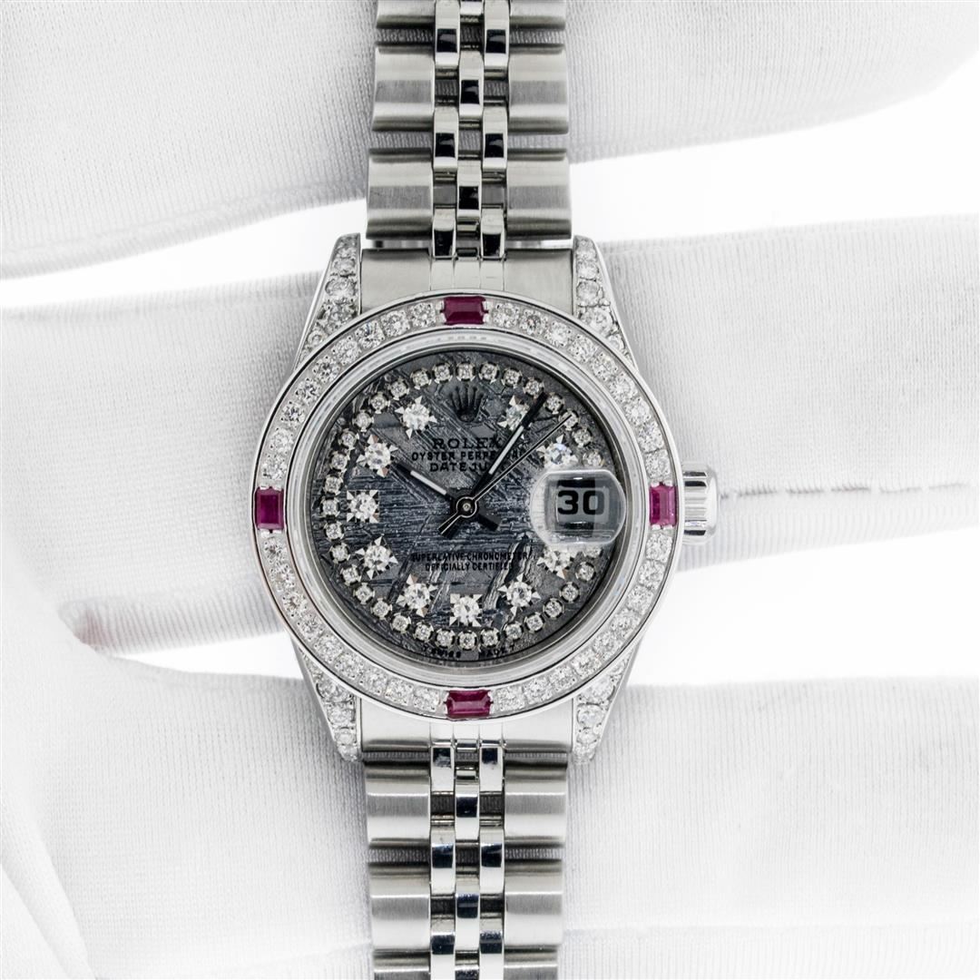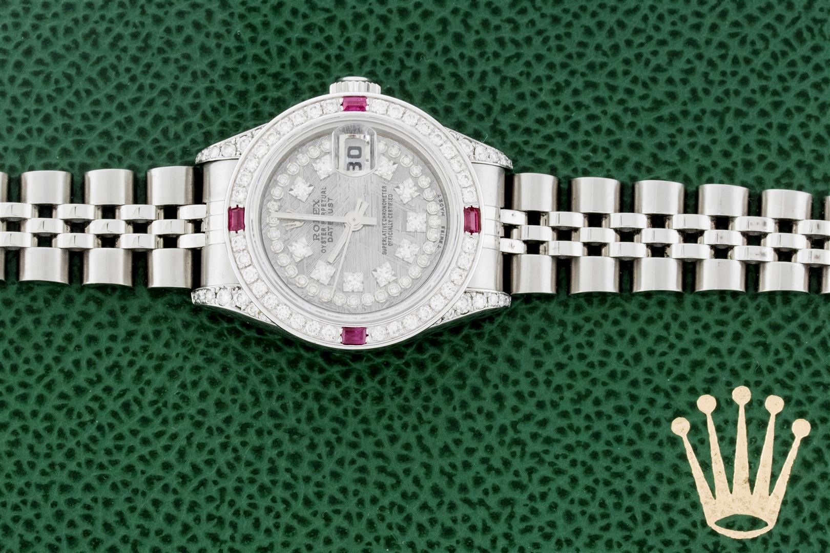 One Quickset Ladies Stainless Steel Rolex Datejust Polished Bright with Satin Finish, Serviced & Electronically Tested, Rolex Stainless Steel Case: 26mm, Rolex Stainless Steel Crown, Custom Diamond Lugs: 24 Diamonds On Lugs, Clarity: SI-VS, Color: G to H. Custom Bezel: New 18K White Gold Beadset Diamond Bezel, Stone Count: 28 Diamonds + 4 Emeralds On Bezel, Total Weight .70 Carat, Clarity: SI-VS, Color: G to H. Custom Crystal: New Sapphire With Magnified Date Window. Custom Hands: New Luminescent Hands. Rolex Movement: Automatic Winding Movement. Custom Dial: Meteorite String Diamond Dial, 43 Diamonds in Dial G To H In Color, Clarity: VS. Date Window: 3 O'clock Position Date Display, Model: Sapphire Quickset Datejust. Condition: G-6 Extra Fine. Rolex Bracelet: Stainless Steel Jubilee Band. Bright Polish & Satin Finish. 6.0 Inch Length, Adjustable. Standard Clasp, With Rolex Logo. This Pre Owned Watch Has Been Serviced Time Tested And Is In Excellent Condition It Is Free Of All Scratches And Dents. This Watch Comes With A Rolex Box.