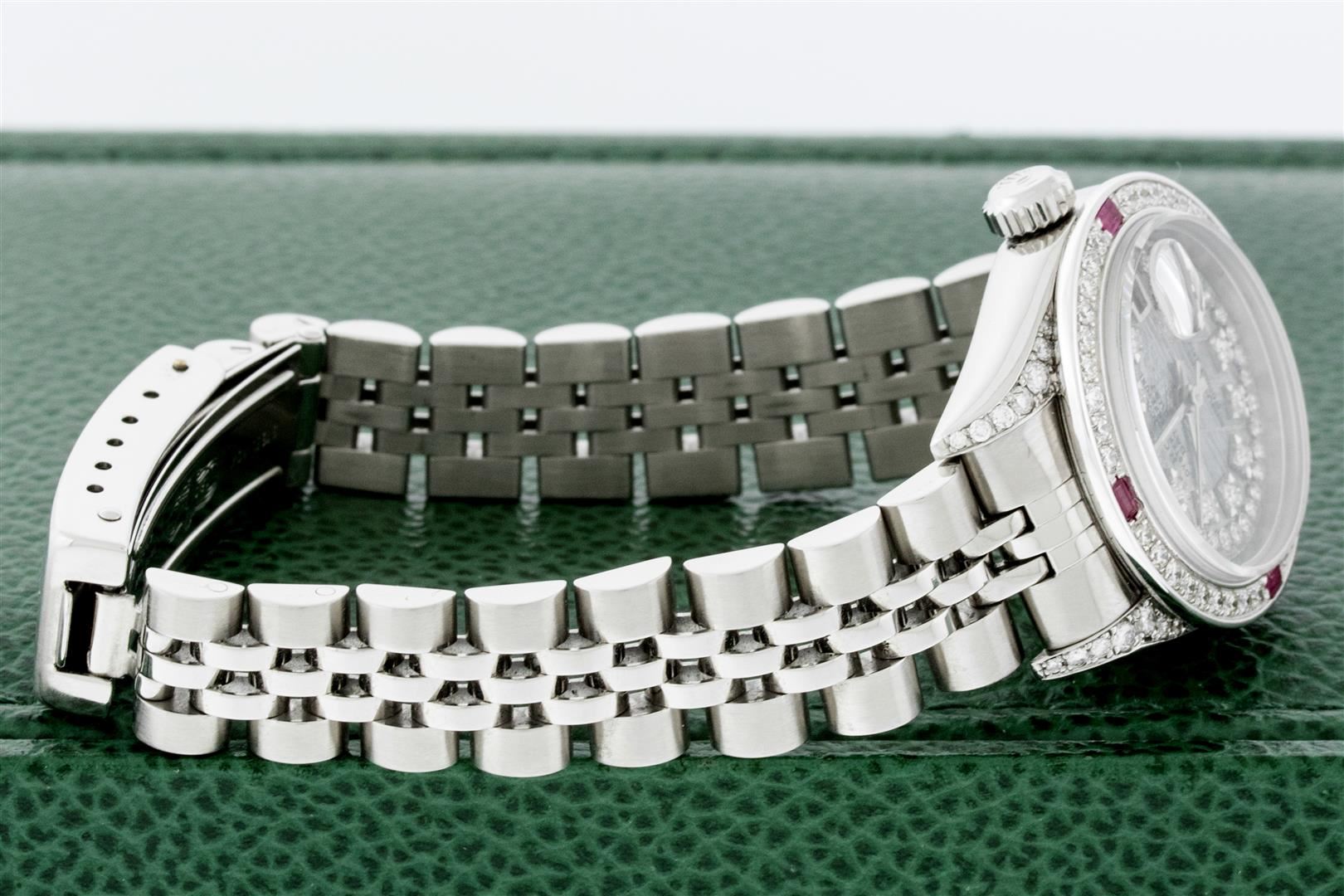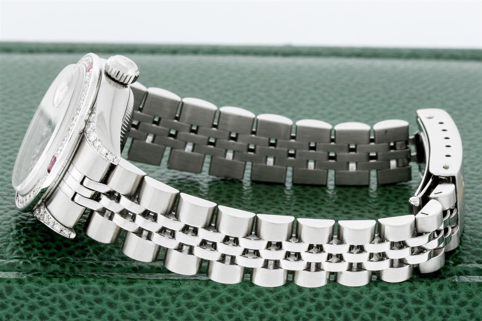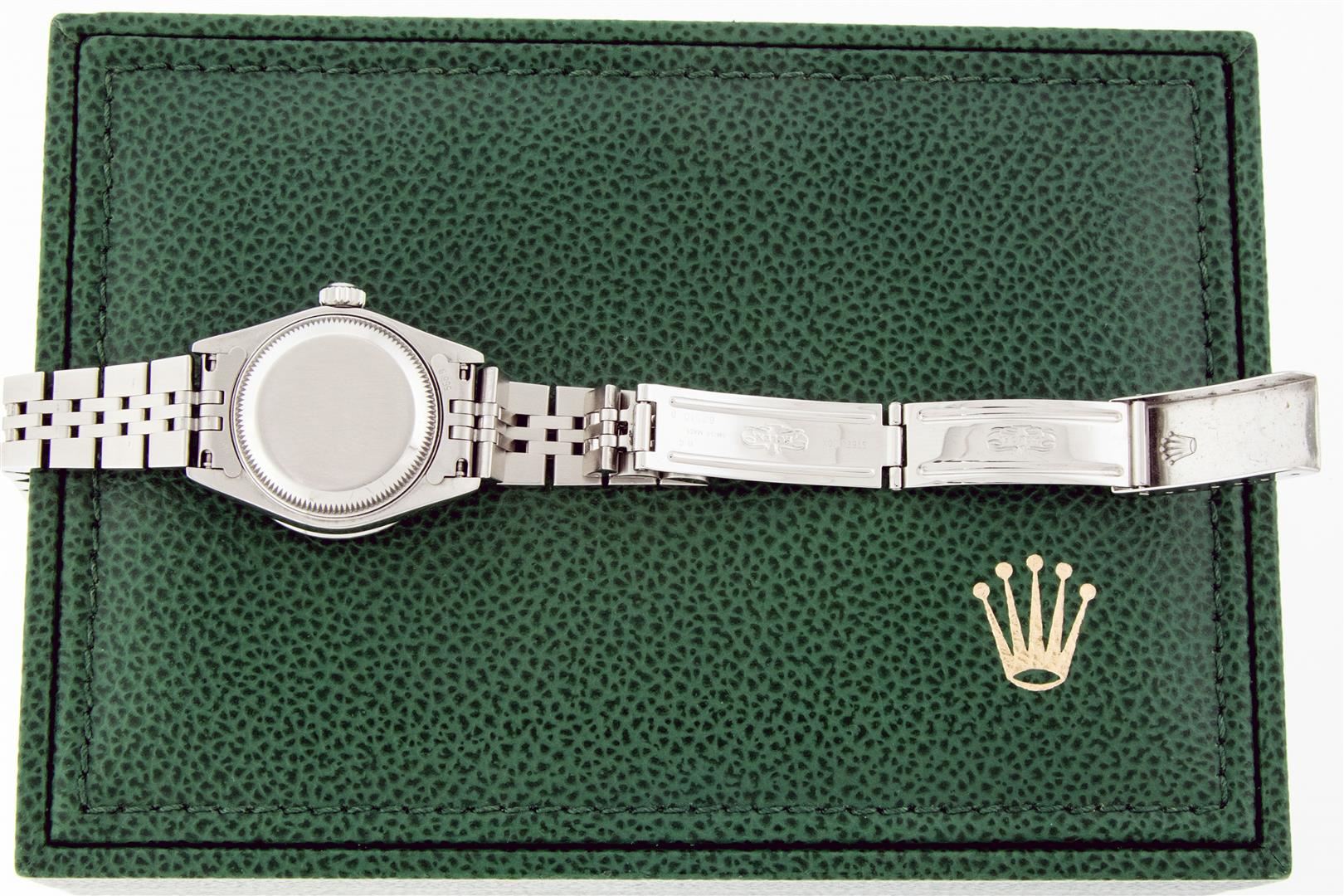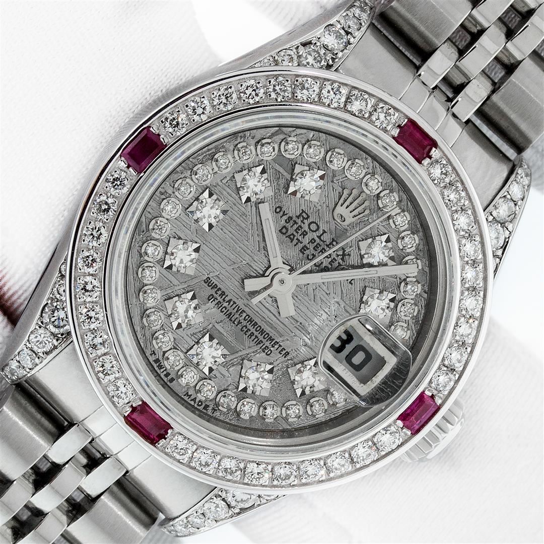 One Quickset Ladies Stainless Steel Rolex Datejust Polished Bright with Satin Finish, Serviced & Electronically Tested, Rolex Stainless Steel Case: 26mm, Rolex Stainless Steel Crown, Custom Diamond Lugs: 24 Diamonds On Lugs, Clarity: SI-VS, Color: G to H. Custom Bezel: New 18K White Gold Beadset Diamond Bezel, Stone Count: 28 Diamonds + 4 Emeralds On Bezel, Total Weight .70 Carat, Clarity: SI-VS, Color: G to H. Custom Crystal: New Sapphire With Magnified Date Window. Custom Hands: New Luminescent Hands. Rolex Movement: Automatic Winding Movement. Custom Dial: Meteorite String Diamond Dial, 43 Diamonds in Dial G To H In Color, Clarity: VS. Date Window: 3 O'clock Position Date Display, Model: Sapphire Quickset Datejust. Condition: G-6 Extra Fine. Rolex Bracelet: Stainless Steel Jubilee Band. Bright Polish & Satin Finish. 6.0 Inch Length, Adjustable. Standard Clasp, With Rolex Logo. This Pre Owned Watch Has Been Serviced Time Tested And Is In Excellent Condition It Is Free Of All Scratches And Dents. This Watch Comes With A Rolex Box.
