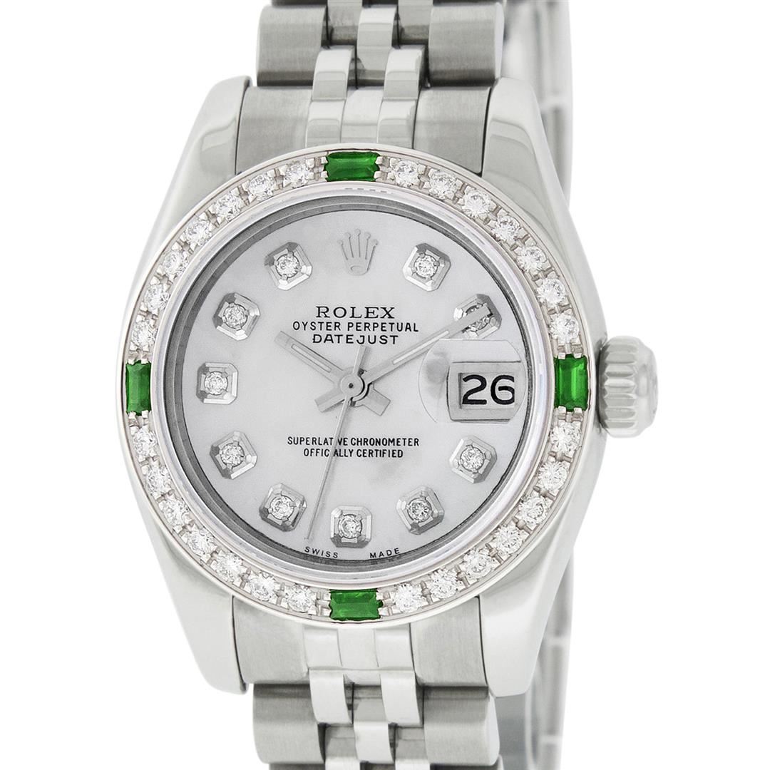 One Quickset Ladies Stainless Steel Rolex Datejust Polished Bright with Satin Finish, Serviced & Electronically Tested, Stainless Steel Case: 26mm, Stainless Steel Crown, Custom Bezel: New 18K White Gold Beadset + Emerald Diamond Bezel, Stone Count: 28 Diamonds + 4 Emeralds On Bezel, Total Weight .70 Carat, Clarity: SI-VS, Color: G to H. Custom Crystal: New Scratch Resistant Synthetic Sapphire Cyclops Lens. Custom Hands: New Luminescent Hands. Movement: Automatic Winding Movement Caliber 2235. Custom Dial: Refinished Mother Of Pearl Diamond Dial, Stone Count: 10 Diamonds On Dial, G To H In Color, Clarity: VS. Date Window: 3 O'Clock Position Date Display, Model: 179160 Quickjset Datejust. Condition: G-6 Extra Fine. Bracelet: Stainless Steel Jubilee Band. Bright Polish & Satin Finish. 6.0 Inch Length, Adjustable. Standard Clasp, With Rolex Logo. This Watch Has Been Serviced Time Tested And Is In Excellent Condition It Is Free Of All Scratches And Dents. This Watch Comes With A Rolex Box.