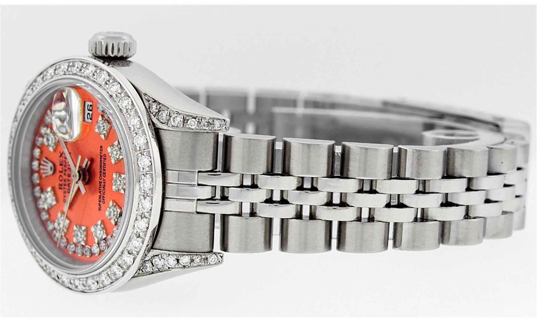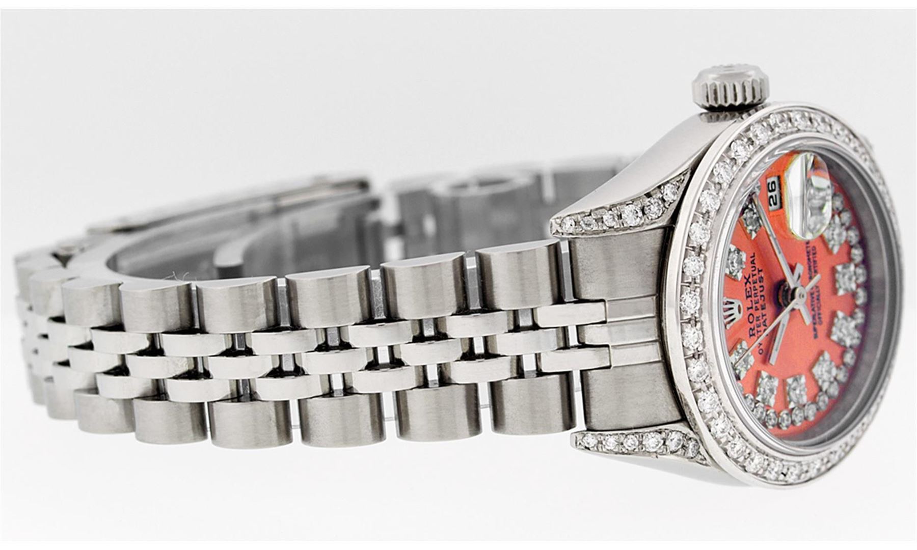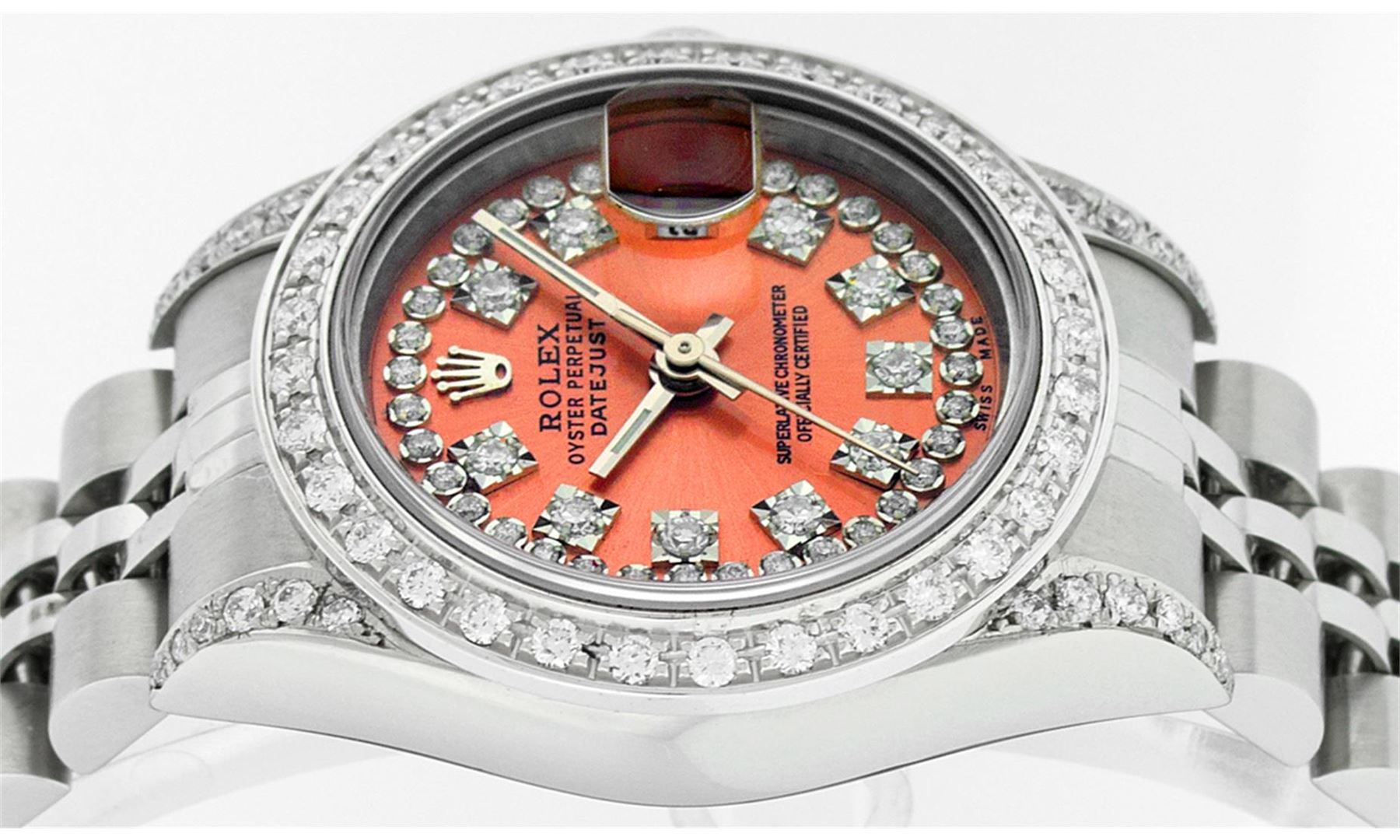 One Quickset Ladies Stainless Steel Rolex Datejust Polished Bright with Satin Finish, Serviced & Electronically Tested, Stainless Steel Case: 26mm, Stainless Steel Crown, Custom Diamond Lugs: 24 Diamonds On Lugs, Clarity: SI-VS, Color: G to H. Custom Bezel: New 18K White Gold Beadset Diamond Bezel, Stone Count: 32 Diamonds On Bezel, Total Bezel Weight .70 Carat, Clarity: SI-VS, Color: G to H. Custom Crystal: New Scratch Resistant Synthetic Sapphire Cyclops Lens. Custom Hands: New Luminescent Hands. Movement: Automatic Winding Movement Caliber 2235. Custom Dial: Refinished Single Cut Orange String Diamond Dial, 43 Diamonds in Dial G To H In Color, Clarity: VS. Date Window: 3 O'Clock Position Date Display, Model: 79174 Quickjset Datejust. Condition: G-6 Extra Fine. Bracelet: Stainless Steel Jubilee Band. Bright Polish & Satin Finish. 6.0 Inch Length, Adjustable. Standard Clasp, With Rolex Logo. This Watch Has Been Serviced Time Tested And Is In Excellent Condition It Is Free Of All Scratches And Dents.