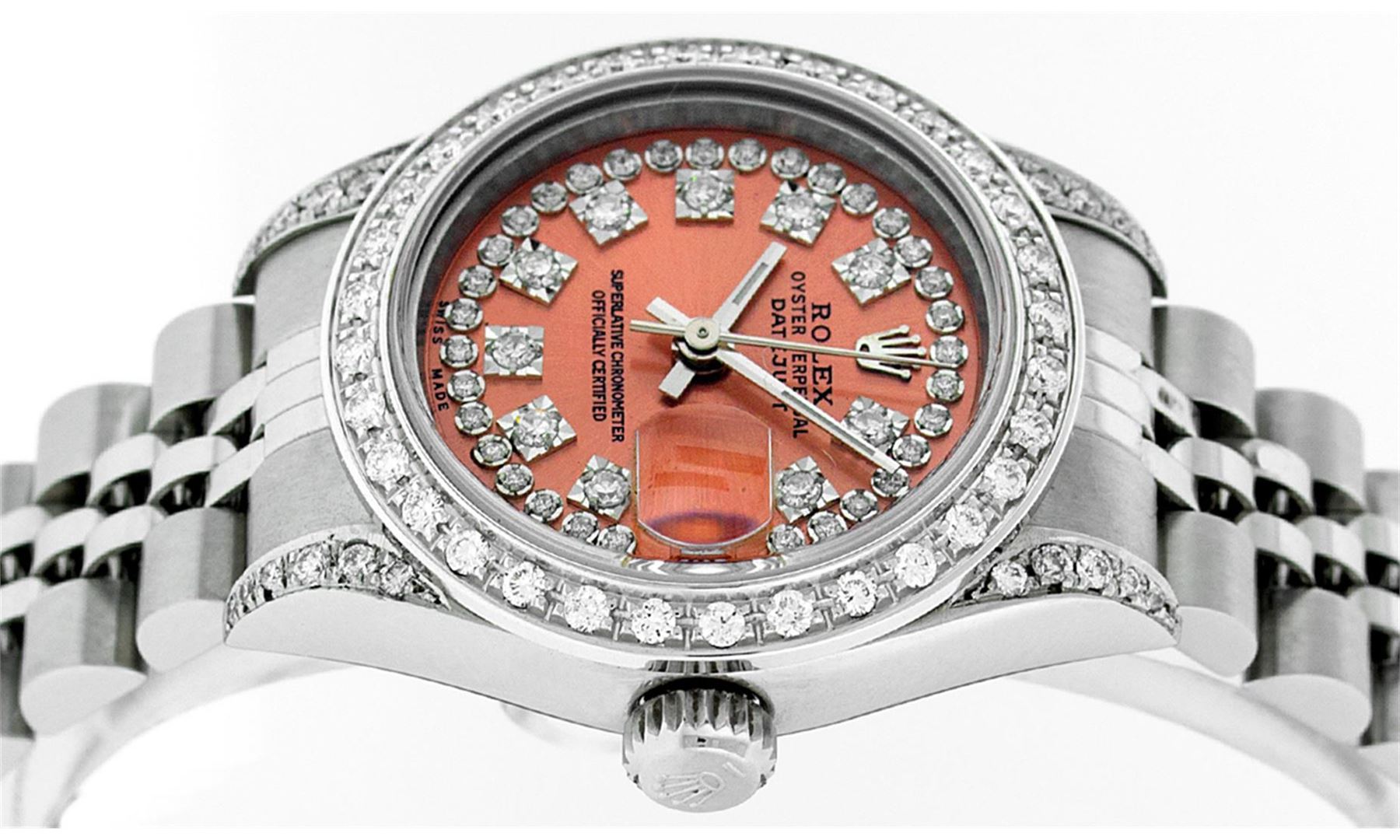 One Quickset Ladies Stainless Steel Rolex Datejust Polished Bright with Satin Finish, Serviced & Electronically Tested, Stainless Steel Case: 26mm, Stainless Steel Crown, Custom Diamond Lugs: 24 Diamonds On Lugs, Clarity: SI-VS, Color: G to H. Custom Bezel: New 18K White Gold Beadset Diamond Bezel, Stone Count: 32 Diamonds On Bezel, Total Bezel Weight .70 Carat, Clarity: SI-VS, Color: G to H. Custom Crystal: New Scratch Resistant Synthetic Sapphire Cyclops Lens. Custom Hands: New Luminescent Hands. Movement: Automatic Winding Movement Caliber 2235. Custom Dial: Refinished Single Cut Orange String Diamond Dial, 43 Diamonds in Dial G To H In Color, Clarity: VS. Date Window: 3 O'Clock Position Date Display, Model: 79174 Quickjset Datejust. Condition: G-6 Extra Fine. Bracelet: Stainless Steel Jubilee Band. Bright Polish & Satin Finish. 6.0 Inch Length, Adjustable. Standard Clasp, With Rolex Logo. This Watch Has Been Serviced Time Tested And Is In Excellent Condition It Is Free Of All Scratches And Dents.