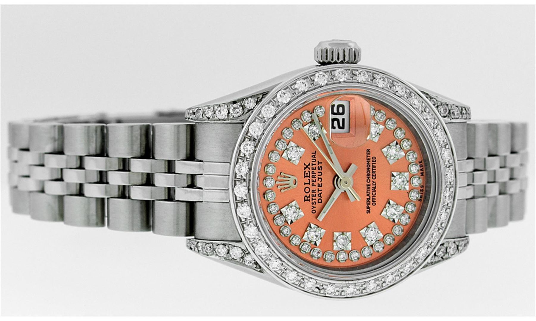 One Quickset Ladies Stainless Steel Rolex Datejust Polished Bright with Satin Finish, Serviced & Electronically Tested, Stainless Steel Case: 26mm, Stainless Steel Crown, Custom Diamond Lugs: 24 Diamonds On Lugs, Clarity: SI-VS, Color: G to H. Custom Bezel: New 18K White Gold Beadset Diamond Bezel, Stone Count: 32 Diamonds On Bezel, Total Bezel Weight .70 Carat, Clarity: SI-VS, Color: G to H. Custom Crystal: New Scratch Resistant Synthetic Sapphire Cyclops Lens. Custom Hands: New Luminescent Hands. Movement: Automatic Winding Movement Caliber 2235. Custom Dial: Refinished Single Cut Orange String Diamond Dial, 43 Diamonds in Dial G To H In Color, Clarity: VS. Date Window: 3 O'Clock Position Date Display, Model: 79174 Quickjset Datejust. Condition: G-6 Extra Fine. Bracelet: Stainless Steel Jubilee Band. Bright Polish & Satin Finish. 6.0 Inch Length, Adjustable. Standard Clasp, With Rolex Logo. This Watch Has Been Serviced Time Tested And Is In Excellent Condition It Is Free Of All Scratches And Dents.