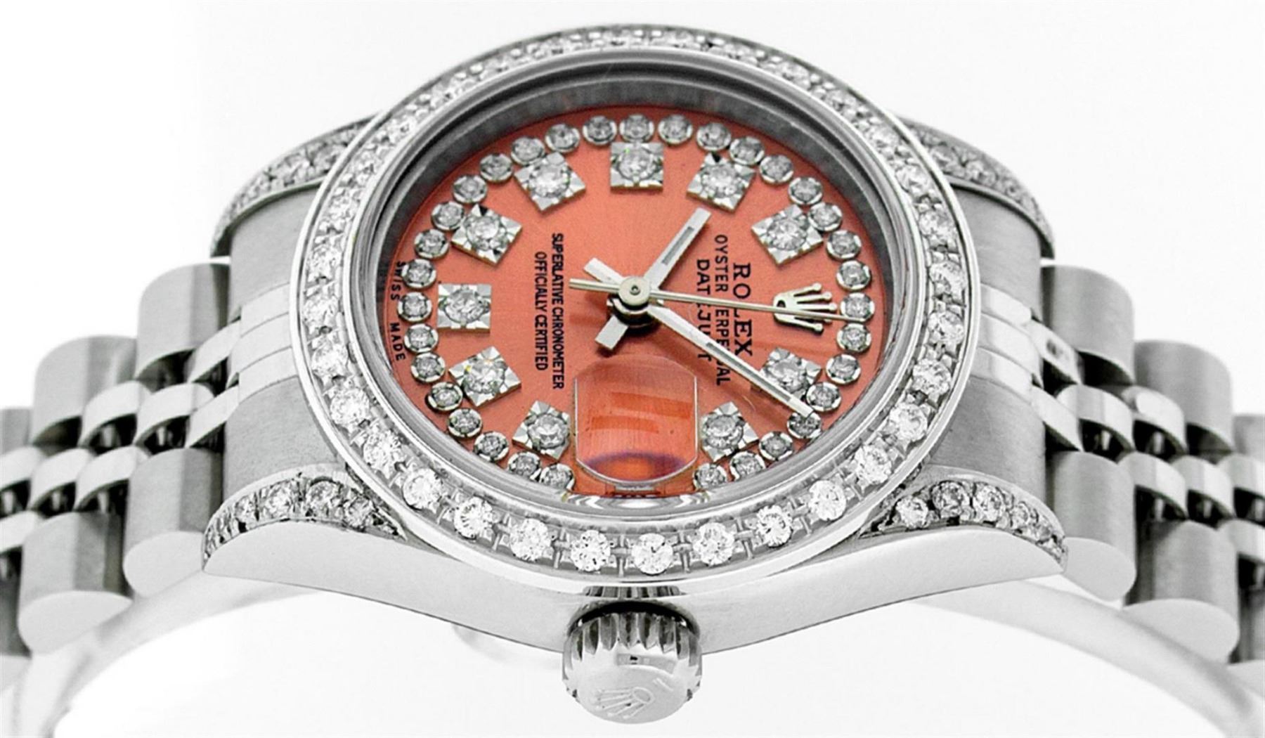 One Quickset Ladies Stainless Steel Rolex Datejust Polished Bright with Satin Finish, Serviced & Electronically Tested, Stainless Steel Case: 26mm, Stainless Steel Crown, Custom Diamond Lugs: 24 Diamonds On Lugs, Clarity: SI-VS, Color: G to H. Custom Bezel: New 18K White Gold Beadset Diamond Bezel, Stone Count: 32 Diamonds On Bezel, Total Bezel Weight .70 Carat, Clarity: SI-VS, Color: G to H. Custom Crystal: New Scratch Resistant Synthetic Sapphire Cyclops Lens. Custom Hands: New Luminescent Hands. Movement: Automatic Winding Movement Caliber 2235. Custom Dial: Refinished Single Cut Orange String Diamond Dial, 43 Diamonds in Dial G To H In Color, Clarity: VS. Date Window: 3 O'Clock Position Date Display, Model: 79174 Quickjset Datejust. Condition: G-6 Extra Fine. Bracelet: Stainless Steel Jubilee Band. Bright Polish & Satin Finish. 6.0 Inch Length, Adjustable. Standard Clasp, With Rolex Logo. This Watch Has Been Serviced Time Tested And Is In Excellent Condition It Is Free Of All Scratches And Dents.