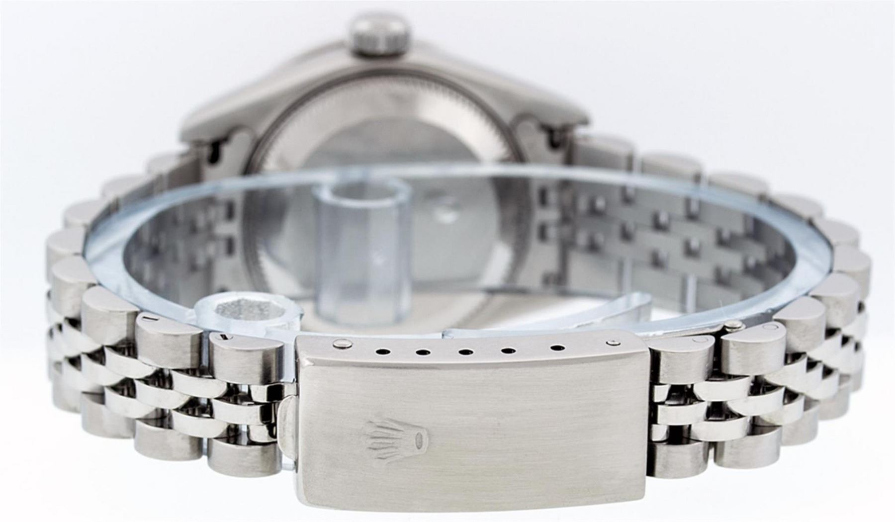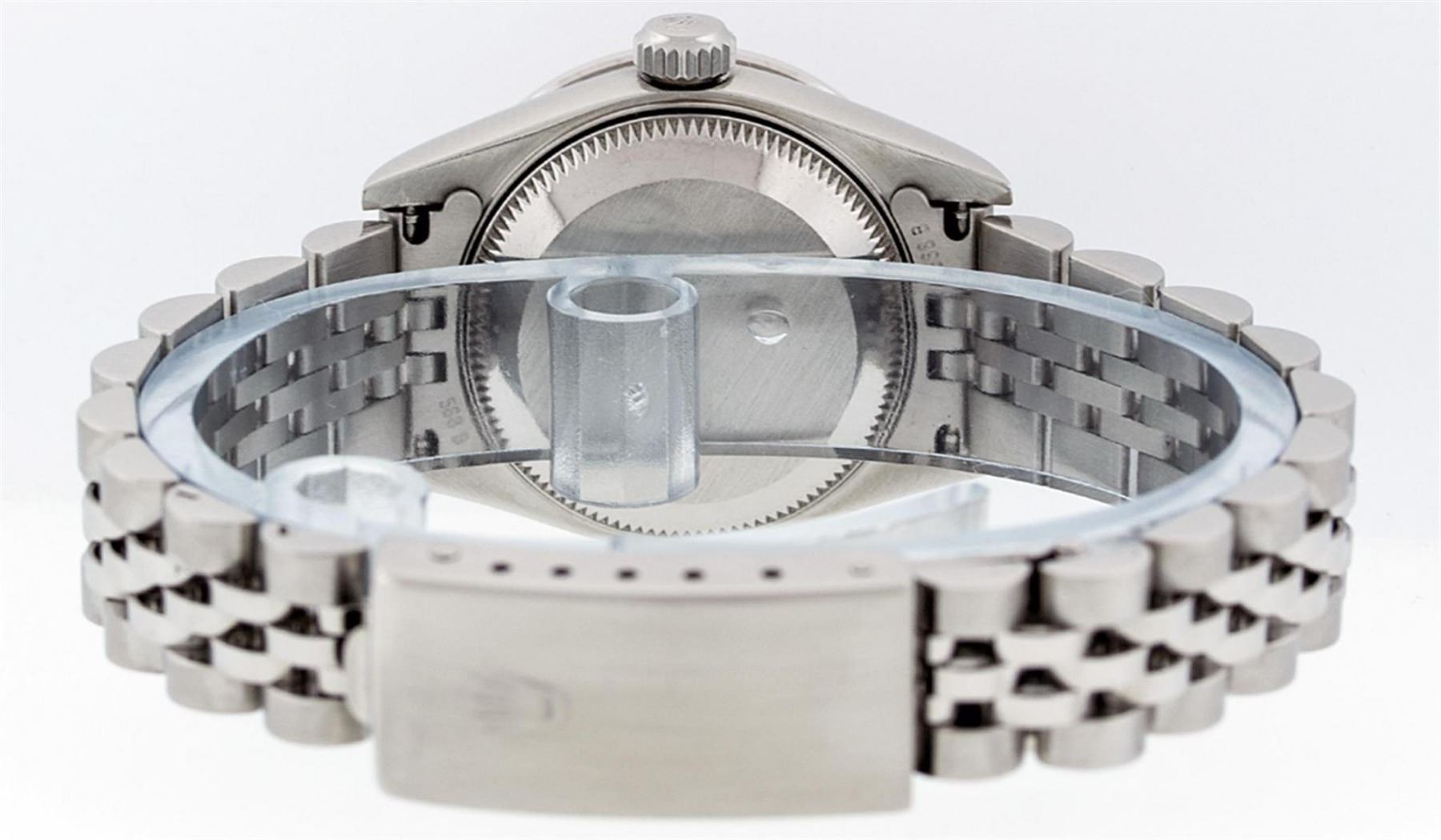 One Quickset Ladies Stainless Steel Rolex Datejust Polished Bright with Satin Finish, Serviced & Electronically Tested, Stainless Steel Case: 26mm, Stainless Steel Crown, Custom Diamond Lugs: 24 Diamonds On Lugs, Clarity: SI-VS, Color: G to H. Custom Bezel: New 18K White Gold Beadset Diamond Bezel, Stone Count: 32 Diamonds On Bezel, Total Bezel Weight .70 Carat, Clarity: SI-VS, Color: G to H. Custom Crystal: New Scratch Resistant Synthetic Sapphire Cyclops Lens. Custom Hands: New Luminescent Hands. Movement: Automatic Winding Movement . Custom Dial: Refinished Single Cut Orange String Diamond Dial, 43 Diamonds in Dial G To H In Color, Clarity: VS. Date Window: 3 O'Clock Position Date Display, Model: 79174 Quickjset Datejust. Condition: G-6 Extra Fine. Bracelet: Stainless Steel Jubilee Band. Bright Polish & Satin Finish. 6.0 Inch Length, Adjustable. Standard Clasp, With Rolex Logo. This Watch Has Been Serviced Time Tested And Is In Excellent Condition It Is Free Of All Scratches And Dents. This Watch Comes With A Rolex Box.