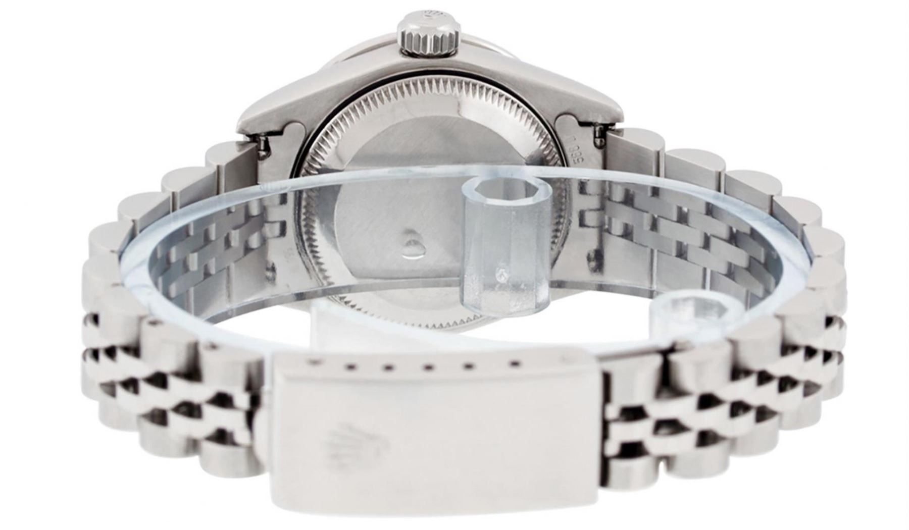 One Quickset Ladies Stainless Steel Rolex Datejust Polished Bright with Satin Finish, Serviced & Electronically Tested, Stainless Steel Case: 26mm, Stainless Steel Crown, Custom Bezel: New 18K White Gold Diamond + Ruby Beadset Diamond Bezel, Stone Count:�28 Diamonds + 4 Rubies, Total Weight .70 Carat, Clarity: SI-VS, Color: G to H. Custom Crystal: New Scratch Resistant Synthetic Sapphire Cyclops Lens. Custom Hands: New Luminescent Hands. Movement: Automatic Winding Movement Caliber 2235.�Custom Dial: Refinished Pink Diamond Dial, 10 Diamonds in Dial G To H In Color, Clarity: VS. Date Window: 3 O'Clock Position Date Display, Model: Quickset Datejust. Condition: G-6 Extra Fine. Bracelet: Stainless Steel Jubilee Band. Bright Polish & Satin Finish. 6.0 Inch Length, Adjustable. Standard Clasp, With Rolex Logo. This Watch Has Been Serviced Time Tested And Is In Excellent Condition It Is Free Of All Scratches And Dents.