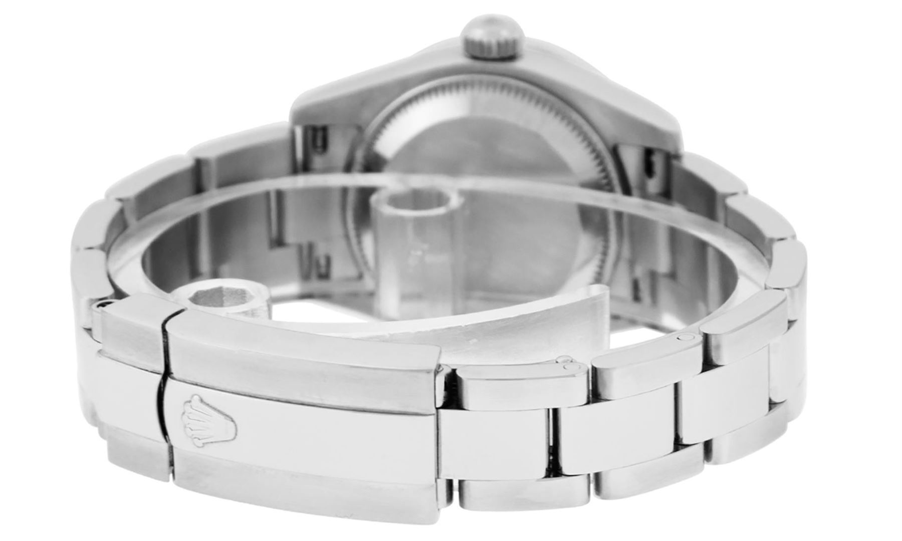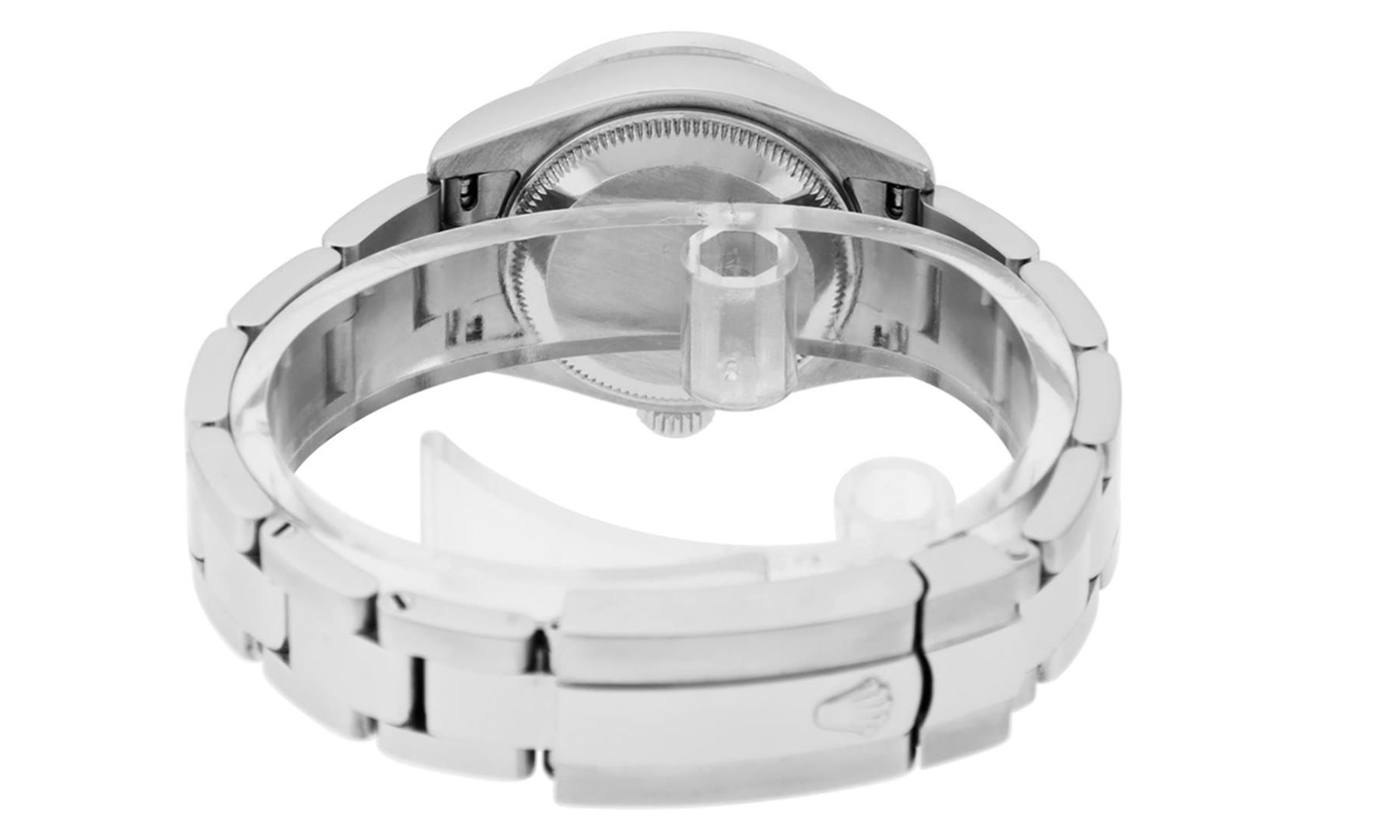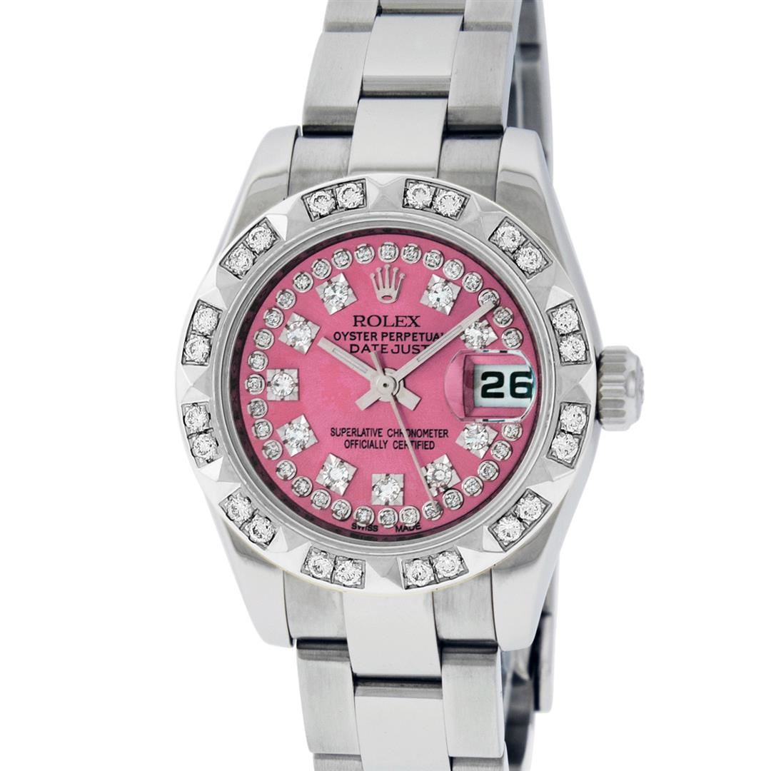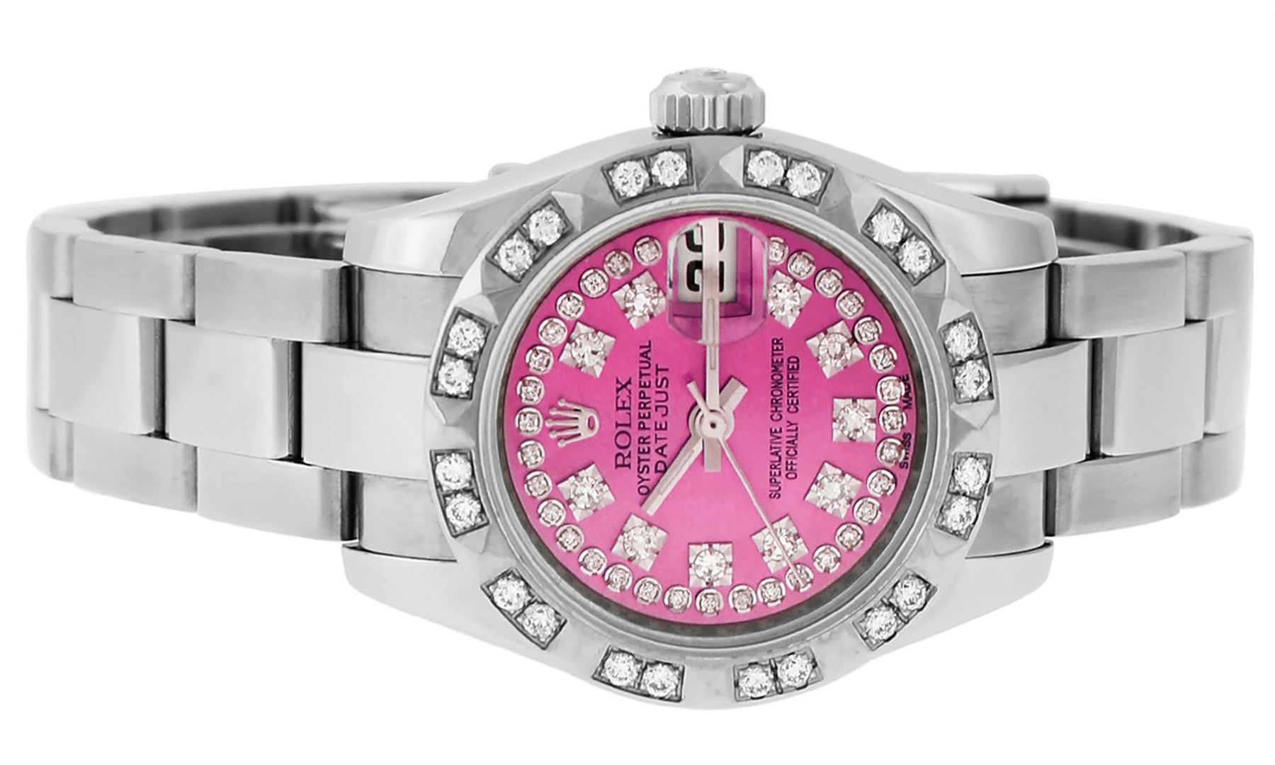 One Pre Owned Quickset Ladies Stainless Steel Rolex Datejust Polished Bright with Satin Finish, Serviced & Electronically Tested, Stainless Steel Case: 26mm, Stainless Steel Crown, Custom Bezel: New 18K White Gold Pyramid Diamond Bezel, Stone Count: 24 Diamonds On Bezel, Clarity: SI-VS, Color: G to H. Custom Crystal: New Sapphire With Date Window. Custom Hands: New Luminescent Hands. Rolex Movement: Automatic Winding Movement. Custom Dial: Refinished To Pink With Custom Added Diamonds, 43 Diamonds in Dial, G To H In Color, Clarity: VS. Date Window: 3 O'Clock Position Date Display, Model: 179160 Quickjset Datejust. Condition: G-6 Extra Fine. Bracelet: Stainless Steel Oyster Band. Bright Polish & Satin Finish. 6.0 Inch Length, Adjustable. Standard Clasp, With Rolex Logo. This Watch Has Been Serviced Time Tested And Is In Excellent Condition It Is Free Of All Scratches And Dents.