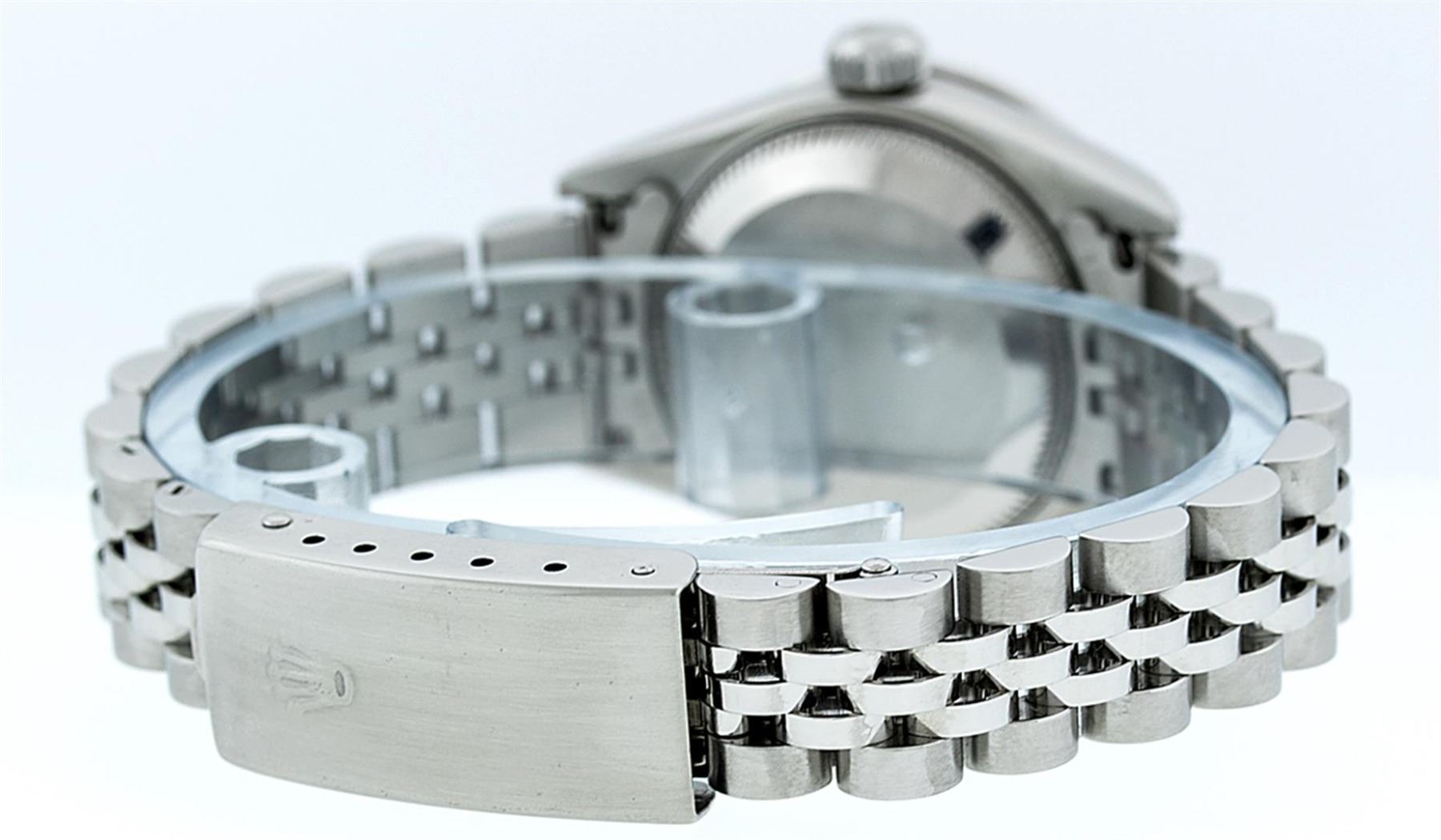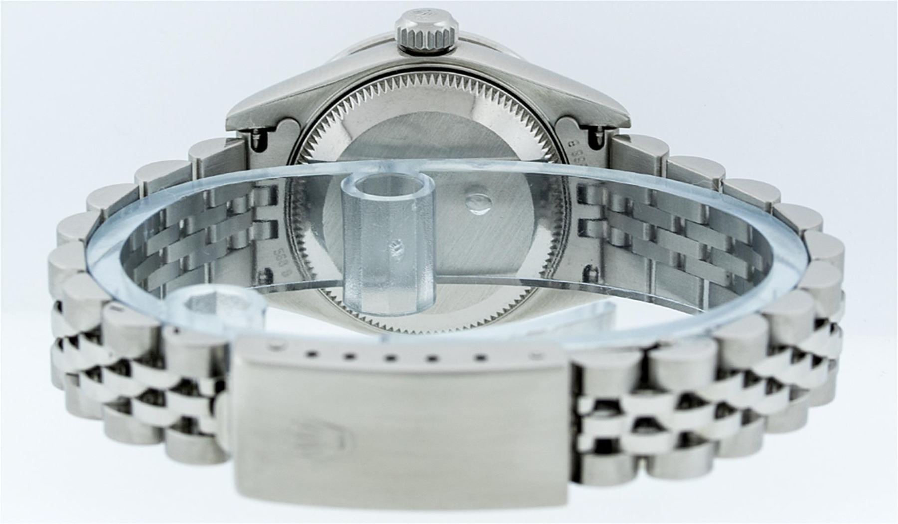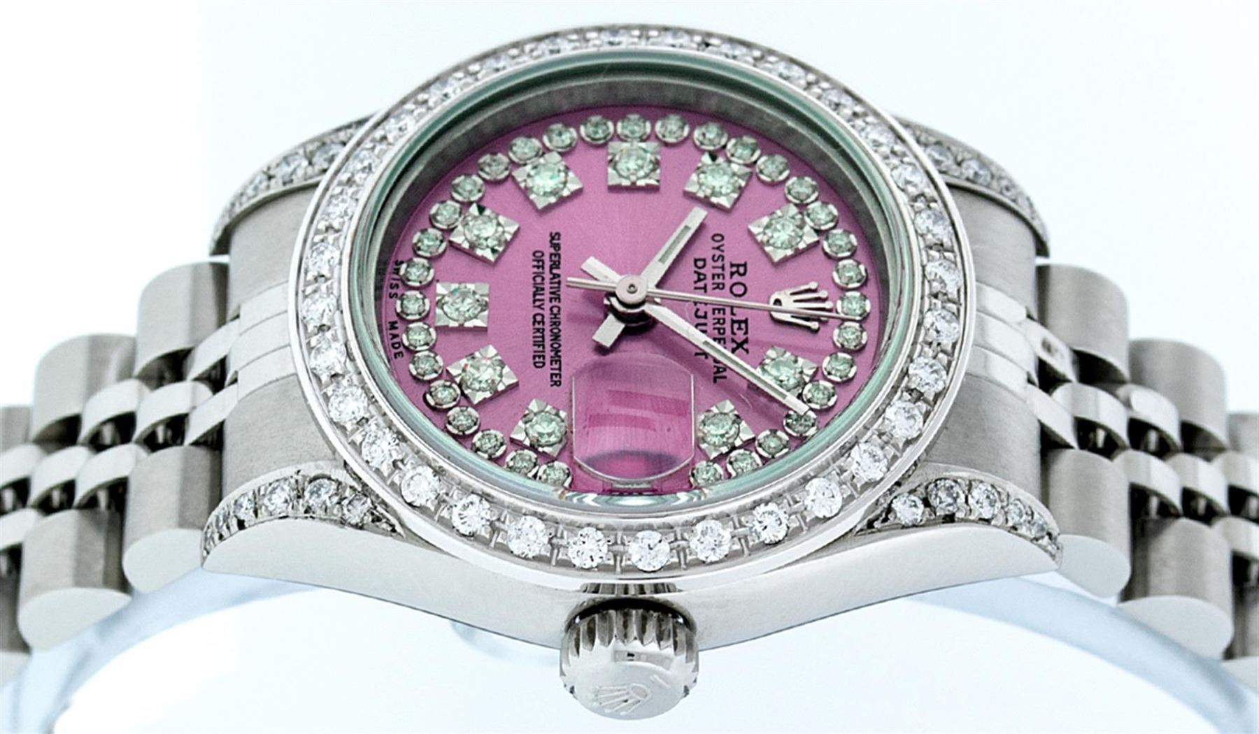 One Quickset Ladies Stainless Steel Rolex Datejust Polished Bright with Satin Finish, Serviced & Electronically Tested, Stainless Steel Case: 26mm, Stainless Steel Crown, Custom Diamond Lugs: 24 Diamonds On Lugs, Clarity: SI-VS, Color: G to H. Custom Bezel: New 18K White Gold Beadset Diamond Bezel, Stone Count: 32 Diamonds, Total Weight .70 Carat, Clarity: SI-VS, Color: G to H. Custom Crystal: New Scratch Resistant Synthetic Sapphire Cyclops Lens. Custom Hands: New Luminescent Hands. Movement: Automatic Winding Movement Caliber 2235. Custom Dial: Refinished Single Cut Pink String Diamond Dial, 43 Diamonds in Dial G To H In Color, Clarity: VS. Date Window: 3 O'Clock Position Date Display, Model: 79174 Quickjset Datejust. Condition: G-6 Extra Fine. Bracelet: Stainless Steel Jubilee Band. Bright Polish & Satin Finish. 6.0 Inch Length, Adjustable. Standard Clasp, With Rolex Logo. This Watch Has Been Serviced Time Tested And Is In Excellent Condition It Is Free Of All Scratches And Dents.