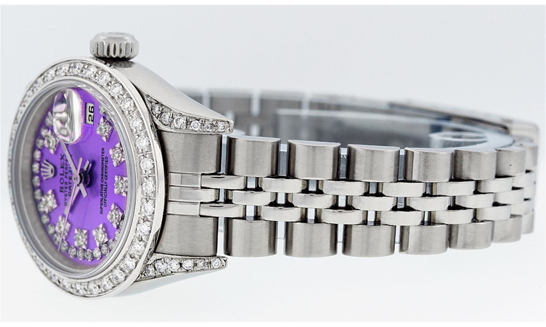 One Quickset Ladies Stainless Steel Rolex Datejust Polished Bright with Satin Finish, Serviced & Electronically Tested, Stainless Steel Case: 26mm, Stainless Steel Crown, Custom Diamond Lugs: 24 Diamonds On Lugs, Clarity: SI-VS, Color: G to H. Custom Bezel: New 18K White Gold Beadset Diamond Bezel, Stone Count: 32 Diamonds On Bezel, Total Bezel Weight .70 Carat, Clarity: SI-VS, Color: G to H. Custom Crystal: New Scratch Resistant Synthetic Sapphire Cyclops Lens. Custom Hands: New Luminescent Hands. Movement: Automatic Winding Movement Caliber 2235. Custom Dial: Refinished Single Cut Purple String Diamond Dial, 43 Diamonds in Dial, G To H In Color, Clarity: VS. Date Window: 3 O'Clock Position Date Display, Model: 79174 Quickjset Datejust. Condition: G-6 Extra Fine. Bracelet: Stainless Steel Jubilee Band. Bright Polish & Satin Finish. 6.0 Inch Length, Adjustable. Standard Clasp, With Rolex Logo. This Watch Has Been Serviced Time Tested And Is In Excellent Condition It Is Free Of All Scratches And Dents.