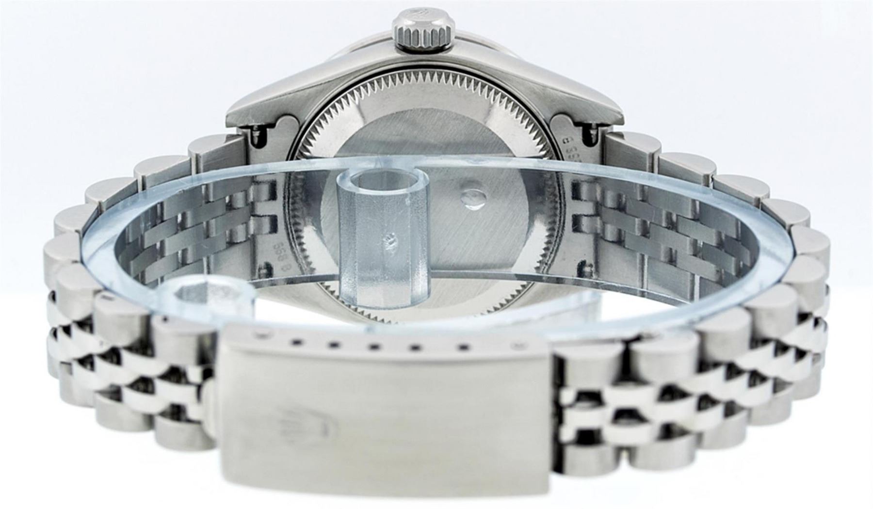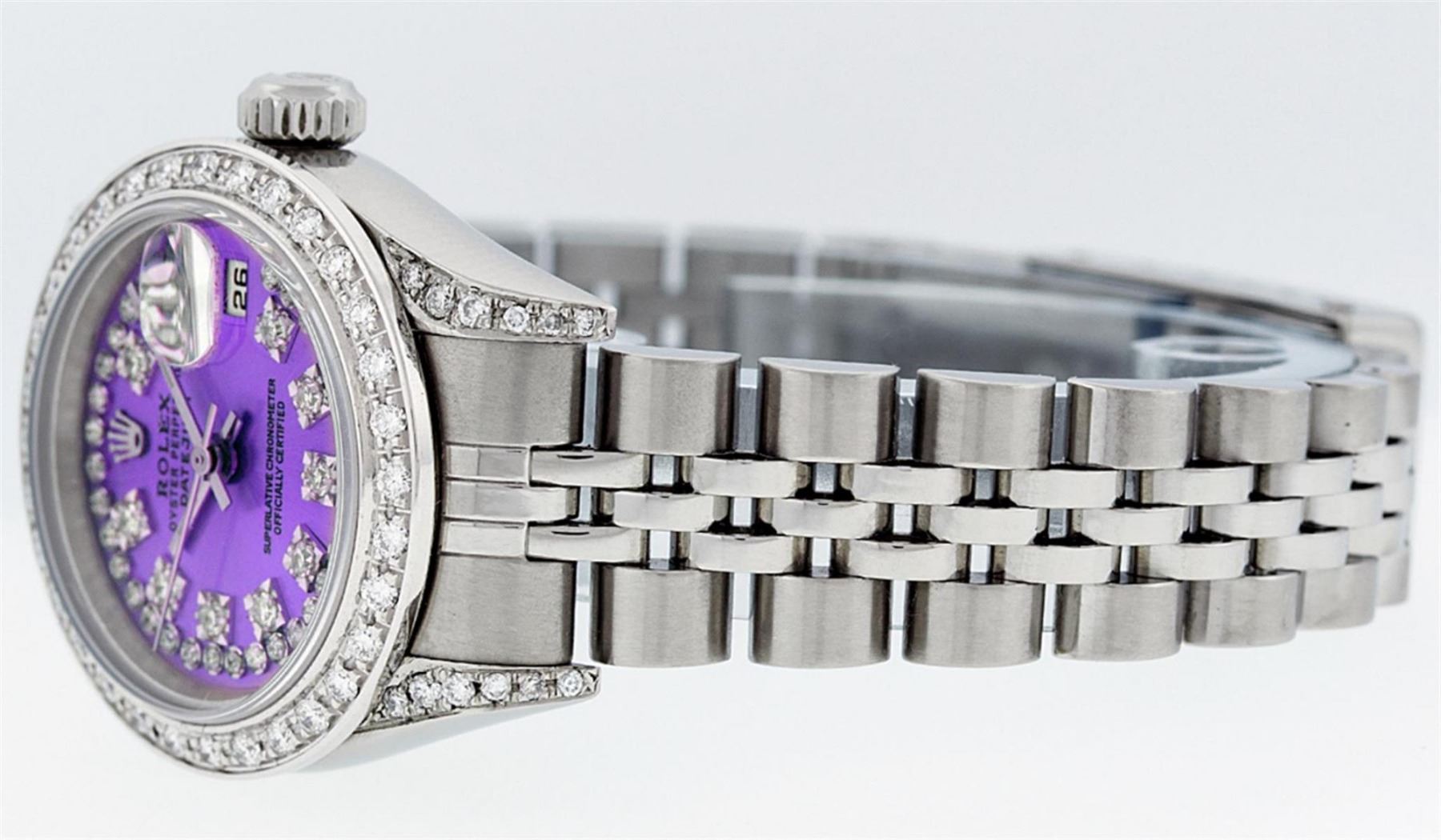 One Quickset Ladies Stainless Steel Rolex Datejust Polished Bright with Satin Finish, Serviced & Electronically Tested, Stainless Steel Case: 26mm, Stainless Steel Crown, Custom Diamond Lugs: 24 Diamonds On Lugs, Clarity: SI-VS, Color: G to H. Custom Bezel: New 18K White Gold Beadset Diamond Bezel, Stone Count: 32 Diamonds On Bezel, Total Bezel Weight .70 Carat, Clarity: SI-VS, Color: G to H. Custom Crystal: New Scratch Resistant Synthetic Sapphire Cyclops Lens. Custom Hands: New Luminescent Hands. Movement: Automatic Winding Movement Caliber 2235. Custom Dial: Refinished Single Cut Purple String Diamond Dial, 43 Diamonds in Dial, G To H In Color, Clarity: VS. Date Window: 3 O'Clock Position Date Display, Model: 79174 Quickjset Datejust. Condition: G-6 Extra Fine. Bracelet: Stainless Steel Jubilee Band. Bright Polish & Satin Finish. 6.0 Inch Length, Adjustable. Standard Clasp, With Rolex Logo. This Watch Has Been Serviced Time Tested And Is In Excellent Condition It Is Free Of All Scratches And Dents.