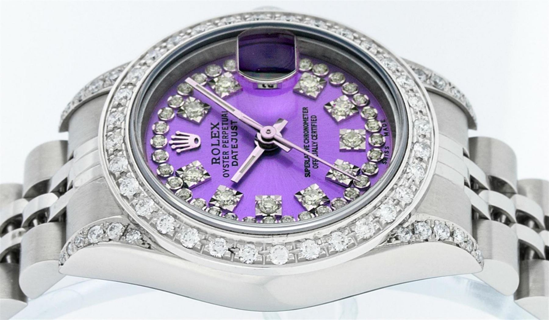 One Quickset Ladies Stainless Steel Rolex Datejust Polished Bright with Satin Finish, Serviced & Electronically Tested, Stainless Steel Case: 26mm, Stainless Steel Crown, Custom Diamond Lugs: 24 Diamonds On Lugs, Clarity: SI-VS, Color: G to H. Custom Bezel: New 18K White Gold Beadset Diamond Bezel, Stone Count: 32 Diamonds On Bezel, Total Bezel Weight .70 Carat, Clarity: SI-VS, Color: G to H. Custom Crystal: New Scratch Resistant Synthetic Sapphire Cyclops Lens. Custom Hands: New Luminescent Hands. Movement: Automatic Winding Movement Caliber 2235. Custom Dial: Refinished Single Cut Purple String Diamond Dial, 43 Diamonds in Dial, G To H In Color, Clarity: VS. Date Window: 3 O'Clock Position Date Display, Model: 79174 Quickjset Datejust. Condition: G-6 Extra Fine. Bracelet: Stainless Steel Jubilee Band. Bright Polish & Satin Finish. 6.0 Inch Length, Adjustable. Standard Clasp, With Rolex Logo. This Watch Has Been Serviced Time Tested And Is In Excellent Condition It Is Free Of All Scratches And Dents.