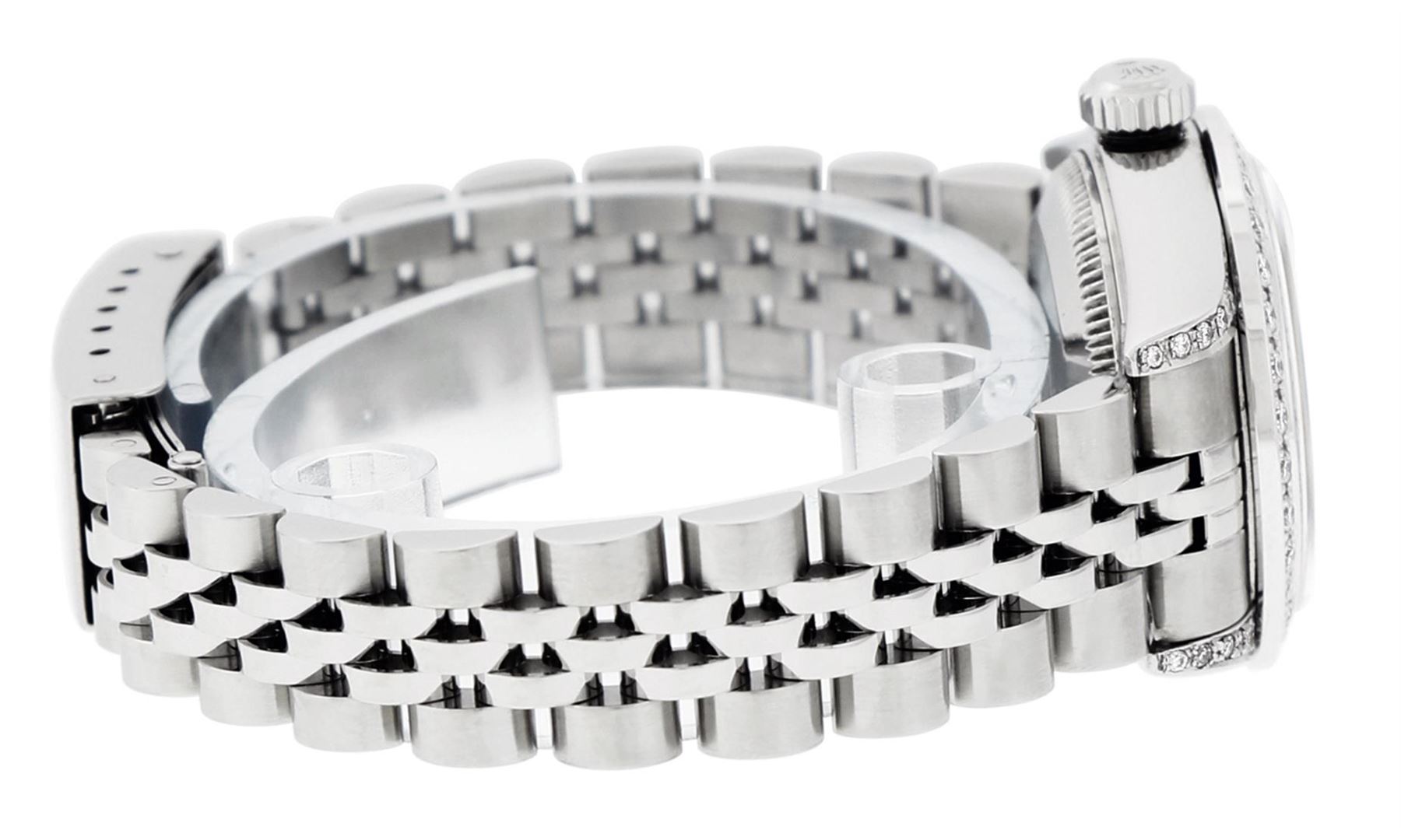 One Quickset Pre Owned Ladies Stainless Steel Rolex Date Polished Bright with Satin Finish, Serviced & Electronically Tested, Rolex Stainless Steel Case: 26mm, Rolex Stainless Steel Crown, Custom Diamond Lugs: 24 Diamonds On Lugs, Clarity: SI-VS, Color: G to H. Custom Bezel: New 18K White Gold Beadset Diamond Bezel, Stone Count: 32 Diamonds On Bezel, Total Weight.70 Carat, Clarity: SI-VS, Color: G to H. Custom Crystal: New Sapphire With Magnified Date Window. Custom Hands: New Luminescent Hands. Rolex Movement: Automatic Winding 2235 Movement. Rolex Dial: Salmon Arabic With Dash Track, Date Window: 3 O'Clock Position Date Display, Model: Sapphire Quickset Date. Condition: G-6 Extra Fine. Rolex Bracelet: Stainless Steel Jubilee Band. Bright Polish & Satin Finish. 6.0 Inch Length, Adjustable. Standard Clasp, With Rolex Logo. This Watch Has Been Serviced Time Tested And Is In Excellent Condition It Is Free Of All Scratches And Dents.