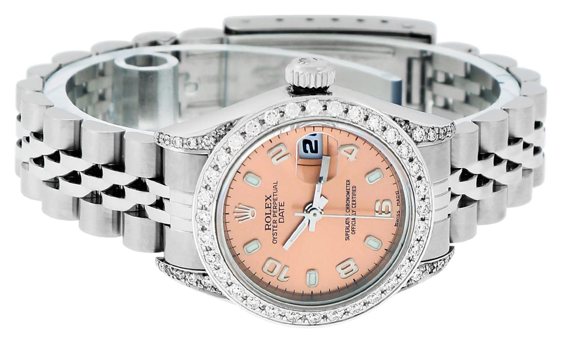 One Quickset Pre Owned Ladies Stainless Steel Rolex Date Polished Bright with Satin Finish, Serviced & Electronically Tested, Rolex Stainless Steel Case: 26mm, Rolex Stainless Steel Crown, Custom Diamond Lugs: 24 Diamonds On Lugs, Clarity: SI-VS, Color: G to H. Custom Bezel: New 18K White Gold Beadset Diamond Bezel, Stone Count: 32 Diamonds On Bezel, Total Weight.70 Carat, Clarity: SI-VS, Color: G to H. Custom Crystal: New Sapphire With Magnified Date Window. Custom Hands: New Luminescent Hands. Rolex Movement: Automatic Winding 2235 Movement. Rolex Dial: Salmon Arabic With Dash Track, Date Window: 3 O'Clock Position Date Display, Model: Sapphire Quickset Date. Condition: G-6 Extra Fine. Rolex Bracelet: Stainless Steel Jubilee Band. Bright Polish & Satin Finish. 6.0 Inch Length, Adjustable. Standard Clasp, With Rolex Logo. This Watch Has Been Serviced Time Tested And Is In Excellent Condition It Is Free Of All Scratches And Dents.