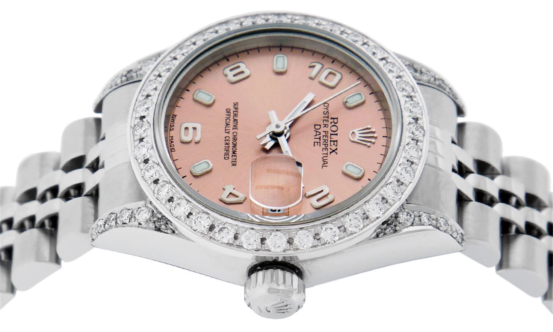 One Quickset Pre Owned Ladies Stainless Steel Rolex Date Polished Bright with Satin Finish, Serviced & Electronically Tested, Rolex Stainless Steel Case: 26mm, Rolex Stainless Steel Crown, Custom Diamond Lugs: 24 Diamonds On Lugs, Clarity: SI-VS, Color: G to H. Custom Bezel: New 18K White Gold Beadset Diamond Bezel, Stone Count: 32 Diamonds On Bezel, Total Weight.70 Carat, Clarity: SI-VS, Color: G to H. Custom Crystal: New Sapphire With Magnified Date Window. Custom Hands: New Luminescent Hands. Rolex Movement: Automatic Winding 2235 Movement. Rolex Dial: Salmon Arabic With Dash Track, Date Window: 3 O'Clock Position Date Display, Model: Sapphire Quickset Date. Condition: G-6 Extra Fine. Rolex Bracelet: Stainless Steel Jubilee Band. Bright Polish & Satin Finish. 6.0 Inch Length, Adjustable. Standard Clasp, With Rolex Logo. This Watch Has Been Serviced Time Tested And Is In Excellent Condition It Is Free Of All Scratches And Dents.