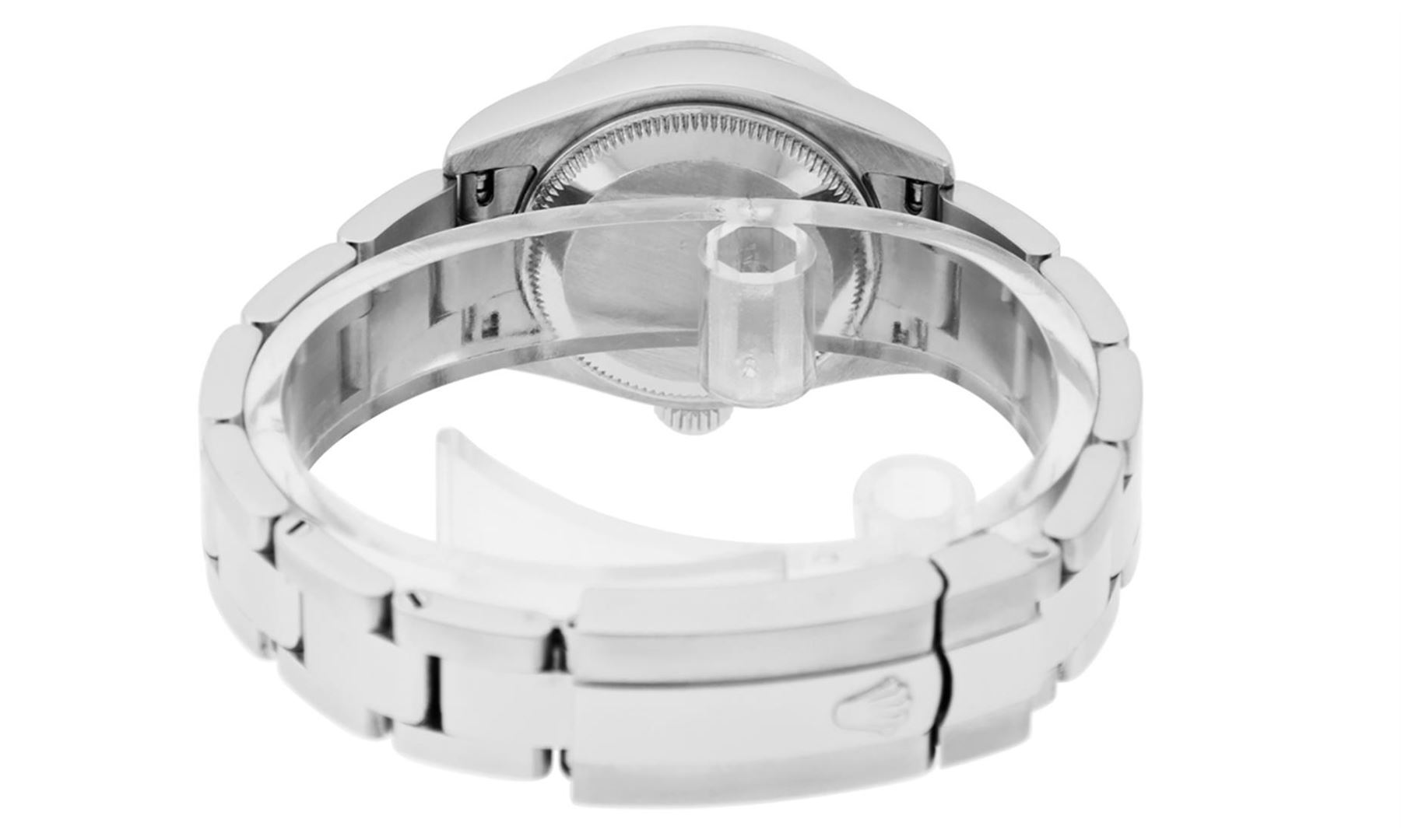 One Quickset Ladies Stainless Steel Rolex Datejust Polished Bright with Satin Finish, Serviced & Electronically Tested, Stainless Steel Case: 26mm, Stainless Steel Crown, Custom Bezel: New 18K White Gold Pyramid Diamond Bezel, Stone Count: 24 Diamonds On Bezel, Total Weight .50 Carat, Clarity: SI-VS, Color: G to H. Custom Crystal: New Scratch Resistant Synthetic Sapphire Cyclops Lens. Custom Hands: New Luminescent Hands. Movement: Automatic Winding Movement Caliber 2235. Custom Dial: Refinished Single Cut Salmon String Diamond Dial, 43 Diamonds in Dial, G To H In Color, Clarity: VS. Date Window: 3 O'Clock Position Date Display, Model: 179160 Quickjset Datejust. Condition: G-6 Extra Fine. Bracelet: Stainless Steel Oyster Band. Bright Polish & Satin Finish. 6.0 Inch Length, Adjustable. Standard Clasp, With Rolex Logo. This Watch Has Been Serviced Time Tested And Is In Excellent Condition It Is Free Of All Scratches And Dents.