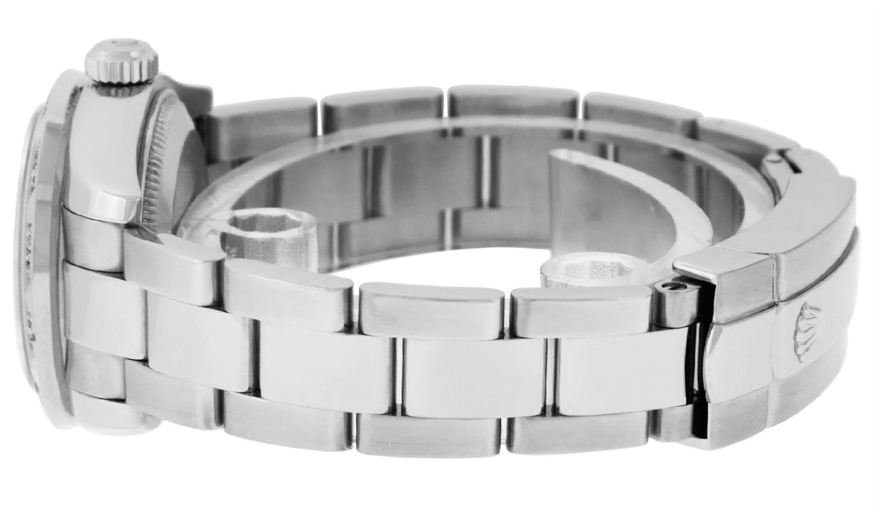 One Quickset Ladies Stainless Steel Rolex Datejust Polished Bright with Satin Finish, Serviced & Electronically Tested, Stainless Steel Case: 26mm, Stainless Steel Crown, Custom Bezel: New 18K White Gold Pyramid Diamond Bezel, Stone Count: 24 Diamonds On Bezel, Total Weight .50 Carat, Clarity: SI-VS, Color: G to H. Custom Crystal: New Scratch Resistant Synthetic Sapphire Cyclops Lens. Custom Hands: New Luminescent Hands. Movement: Automatic Winding Movement Caliber 2235. Custom Dial: Refinished Single Cut Salmon String Diamond Dial, 43 Diamonds in Dial, G To H In Color, Clarity: VS. Date Window: 3 O'Clock Position Date Display, Model: 179160 Quickjset Datejust. Condition: G-6 Extra Fine. Bracelet: Stainless Steel Oyster Band. Bright Polish & Satin Finish. 6.0 Inch Length, Adjustable. Standard Clasp, With Rolex Logo. This Watch Has Been Serviced Time Tested And Is In Excellent Condition It Is Free Of All Scratches And Dents.