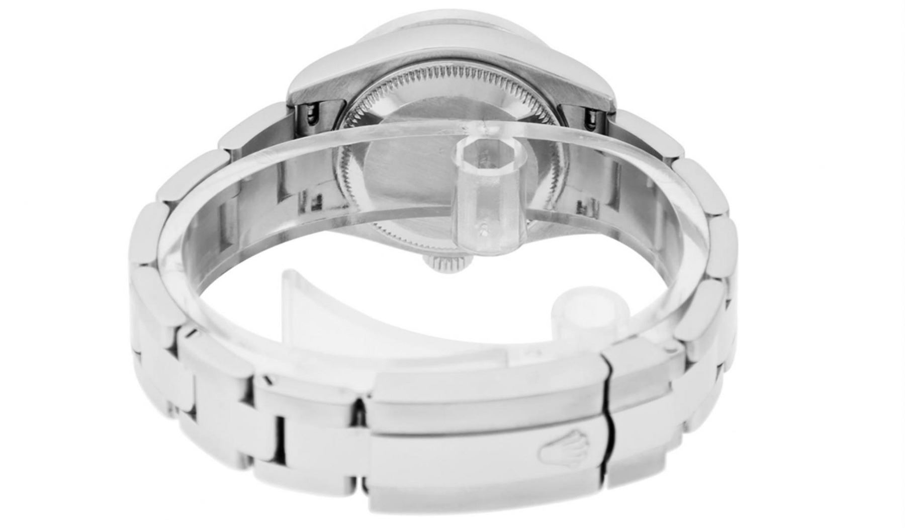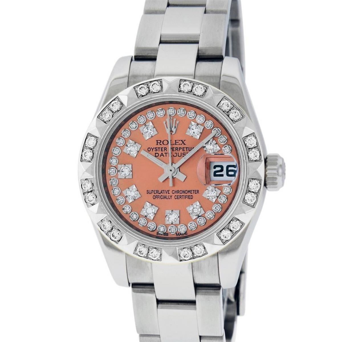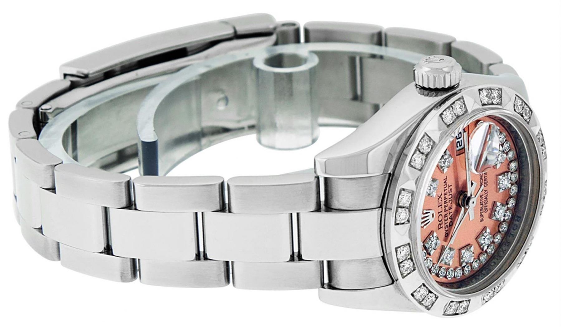 One Quickset Ladies Stainless Steel Rolex Datejust Polished Bright with Satin Finish, Serviced & Electronically Tested, Stainless Steel Case: 26mm, Stainless Steel Crown, Custom Bezel: New 18K White Gold Pyramid Diamond Bezel, Stone Count: 24 Diamonds On Bezel, Total Weight .50 Carat, Clarity: SI-VS, Color: G to H. Custom Crystal: New Scratch Resistant Synthetic Sapphire Cyclops Lens. Custom Hands: New Luminescent Hands. Movement: Automatic Winding Movement Caliber 2235. Custom Dial: Refinished Single Cut Salmon String Diamond Dial, 43 Diamonds in Dial, G To H In Color, Clarity: VS. Date Window: 3 O'Clock Position Date Display, Model: 179160 Quickjset Datejust. Condition: G-6 Extra Fine. Bracelet: Stainless Steel Oyster Band. Bright Polish & Satin Finish. 6.0 Inch Length, Adjustable. Standard Clasp, With Rolex Logo. This Watch Has Been Serviced Time Tested And Is In Excellent Condition It Is Free Of All Scratches And Dents.