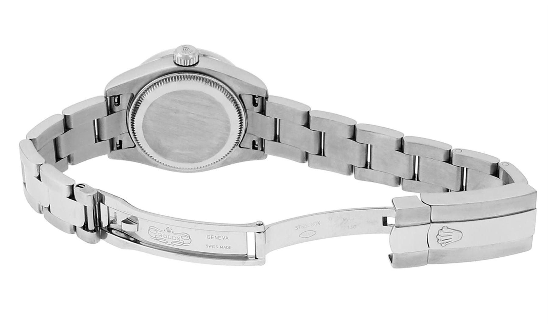 One Quickset Ladies Stainless Steel Rolex Datejust Polished Bright with Satin Finish, Serviced & Electronically Tested, Stainless Steel Case: 26mm, Stainless Steel Crown, Custom Bezel: New 18K White Gold Pyramid Diamond Bezel, Stone Count: 24 Diamonds On Bezel, Total Weight .50 Carat, Clarity: SI-VS, Color: G to H. Custom Crystal: New Scratch Resistant Synthetic Sapphire Cyclops Lens. Custom Hands: New Luminescent Hands. Movement: Automatic Winding Movement. Custom Dial: Refinished Single Cut Salmon String Diamond Dial, 43 Diamonds in Dial, G To H In Color, Clarity: VS. Date Window: 3 O'Clock Position Date Display, Model: 179160 Quickjset Sapphire Datejust. Condition: G-6 Extra Fine. Bracelet: Stainless Steel Oyster Band. Bright Polish & Satin Finish. 6.0 Inch Length, Adjustable. Standard Clasp, With Rolex Logo. This Watch Has Been Serviced Time Tested And Is In Excellent Condition It Is Free Of All Scratches And Dents.