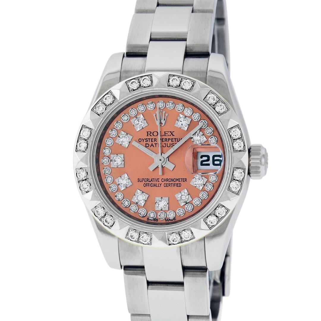 One Quickset Pre Owned Ladies Stainless Steel Rolex Datejust Polished Bright with Satin Finish, Serviced & Electronically Tested, Stainless Steel Case: 26mm, Stainless Steel Crown, Custom Bezel: New 18K White Gold Pyramid Diamond Bezel, Stone Count: 24 Diamonds On Bezel, Clarity: SI-VS, Color: G to H. Custom Crystal: New Sapphire With Date Window. Custom Hands: New Luminescent Hands. Rolex Movement: Automatic Winding Movement. Custom Dial: Refinished To Salmon With Custom Added String Diamond Hour Markers, 43 Diamonds in Dial, G To H In Color, Clarity: VS. Date Window: 3 O'Clock Position Date Display, Model: Quickset Sapphire Datejust. Condition: G-6 Extra Fine. Rolex Bracelet: Stainless Steel Oyster Band. Bright Polish & Satin Finish. 6.0 Inch Length, Adjustable. Standard Clasp, With Rolex Logo. This Watch Has Been Serviced Time Tested And Is In Excellent Condition It Is Free Of All Scratches And Dents.