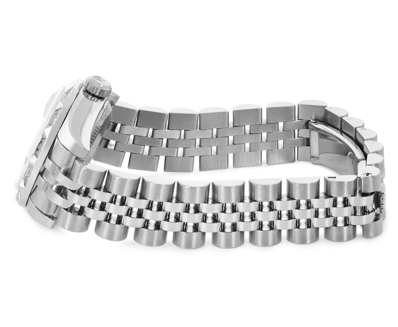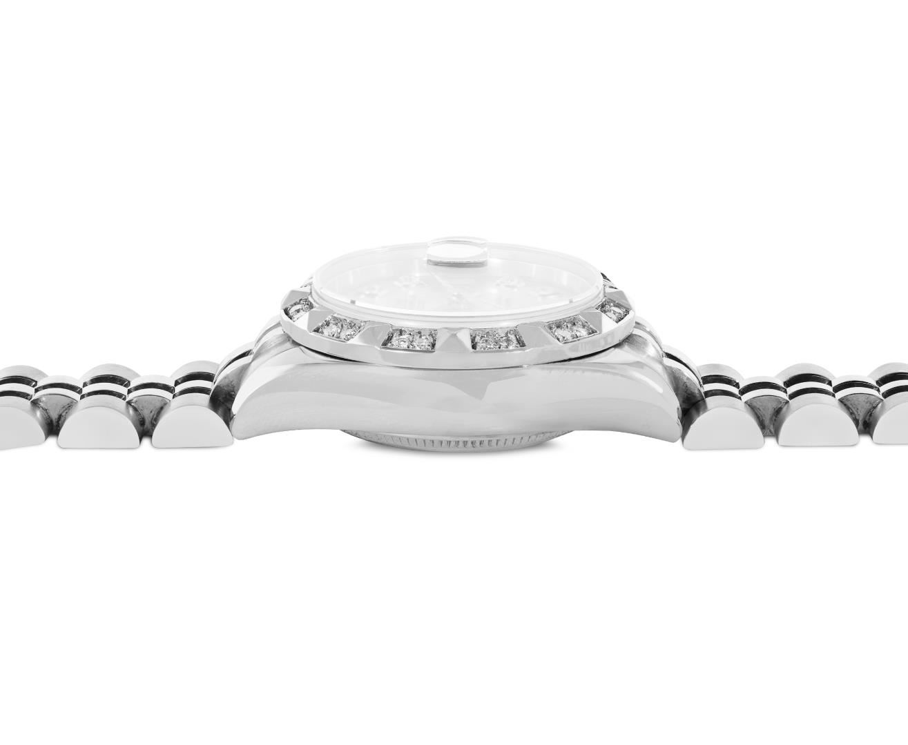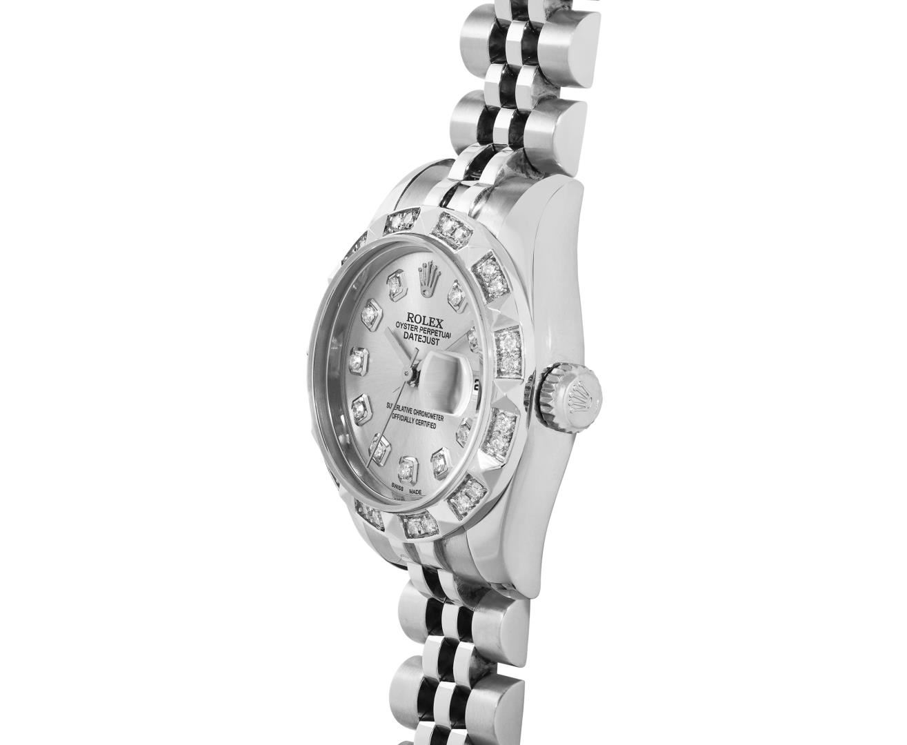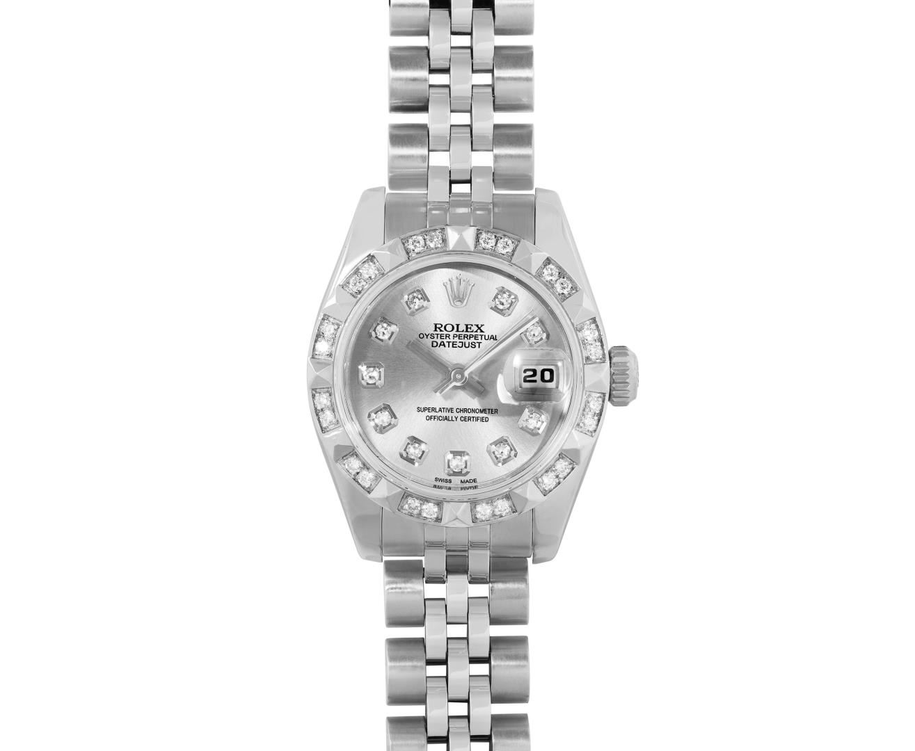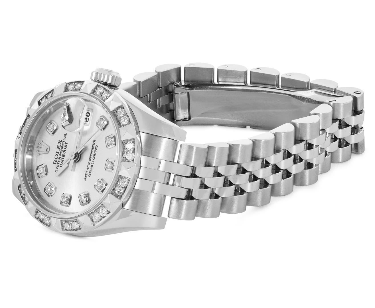 One Rolex Ladies Rolex Quickset Pre Owned Stainless Steel Date Wristwatch Polished Bright with Satin Finish, Serviced And Electronically Tested, Stainless Steel Case: 26mm, Stainless Steel Crown, Custom Bezel: New 18K White Gold Pyramid Diamond Bezel, Diamond Count: 24 Diamonds. Crystal: Sapphire With Magnified Date Window. Hands: Non Luminescent Hands. Rolex Movement: 2235 Automatic Winding Movement 2235. Custom Dial: Custom Silver Dial With Added Diamond Hour Markers, Diamond Count: 10 Diamonds On Dial. Date Window: 3 O'Clock Position Date Display, Model: Quickset Datejust. Condition: G-6 Extra Fine. Rolex Bracelet: Stainless Steel Jubilee Band. Bright Polish And Satin Finish. 6.0 Inch Length, Adjustable. Hidden Clasp, With Rolex Logo. This Watch Has Been Serviced And Time Tested. It Is In Excellent Condition, Free Of All Scratches And Dents. This Watch Comes With A Rolex Box.