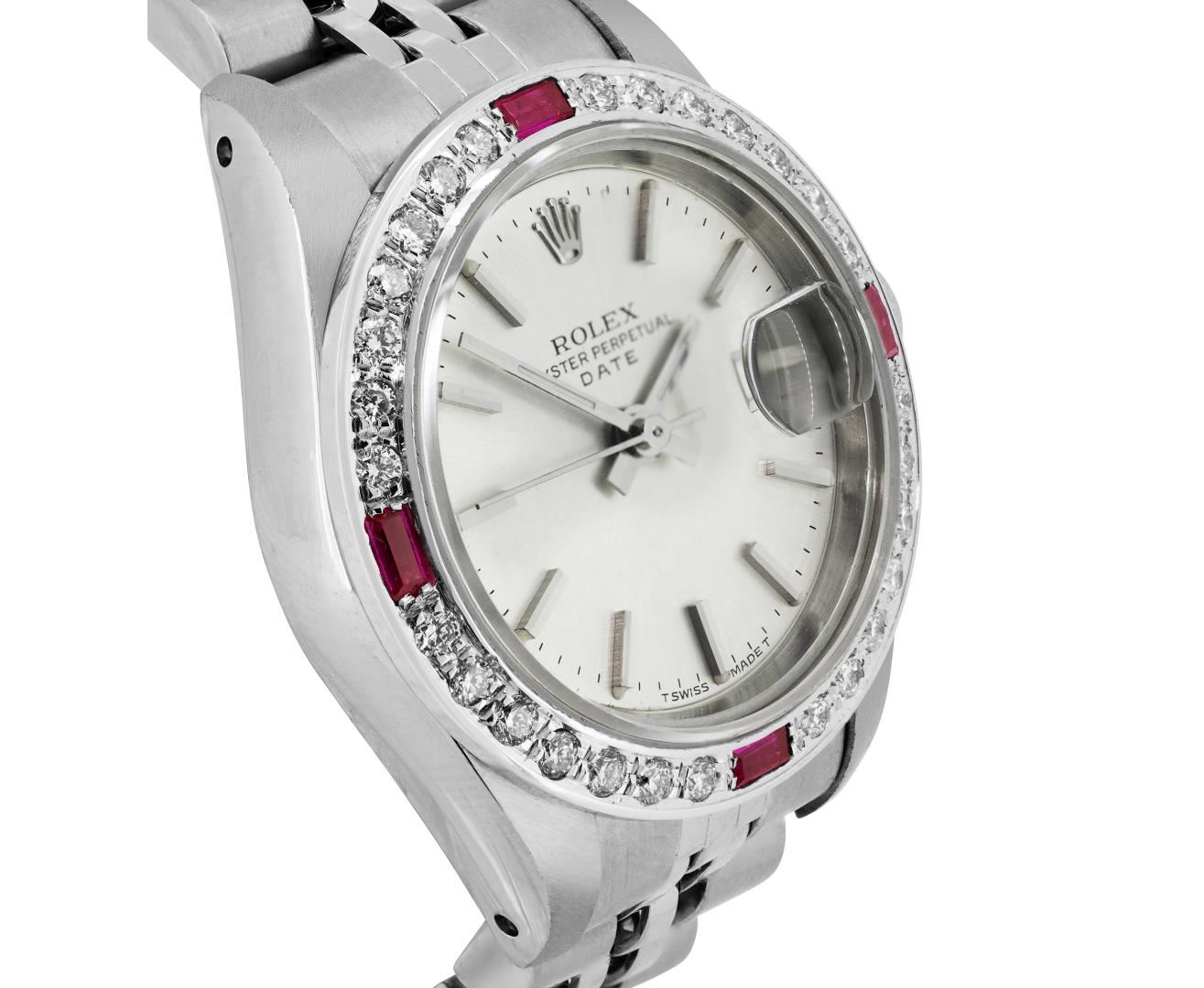 One Rolex Ladies Pre Owned Stainless Steel Date Wristwatch Polished Bright with Satin Finish, Serviced & Electronically Tested, Stainless Steel Case: 26mm, Stainless Steel Crown, Custom Bezel: New 18K White Gold Ruby Beadset Diamond Bezel, Diamond + Gem Count: 36 Diamonds + 4 Rubies. Custom Crystal: New Sapphire With Magnified Date Window. Custom Hands: New Luminescent Hands. Rolex Movement: 2135 Automatic Winding Movement. Rolex Dial: Factory Silver With Index Hour Markers And Lumi Dots. Date Window: 3 O'Clock Position Date Display, Model: Quickset Date. Condition: G-6 Extra Fine. Rolex Bracelet: Stainless Steel Jubilee Band. Bright Polish & Satin Finish. 6.0 Inch Length, Adjustable. Standard Clasp, With Rolex Logo. This Watch Has Been Serviced Time Tested And Is In Excellent Condition. It Is Free Of All Scratches And Dents. This Watch Comes With A Rolex Box.