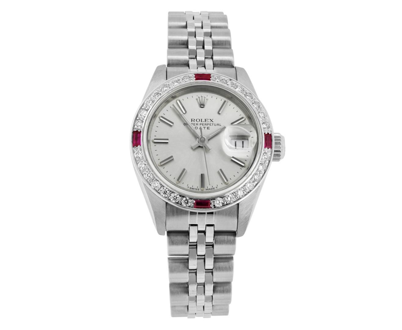 One Rolex Ladies Pre Owned Stainless Steel Date Wristwatch Polished Bright with Satin Finish, Serviced & Electronically Tested, Stainless Steel Case: 26mm, Stainless Steel Crown, Custom Bezel: New 18K White Gold Ruby Beadset Diamond Bezel, Diamond + Gem Count: 36 Diamonds + 4 Rubies. Custom Crystal: New Sapphire With Magnified Date Window. Custom Hands: New Luminescent Hands. Rolex Movement: 2135 Automatic Winding Movement. Rolex Dial: Factory Silver With Index Hour Markers And Lumi Dots. Date Window: 3 O'Clock Position Date Display, Model: Quickset Date. Condition: G-6 Extra Fine. Rolex Bracelet: Stainless Steel Jubilee Band. Bright Polish & Satin Finish. 6.0 Inch Length, Adjustable. Standard Clasp, With Rolex Logo. This Watch Has Been Serviced Time Tested And Is In Excellent Condition. It Is Free Of All Scratches And Dents. This Watch Comes With A Rolex Box.