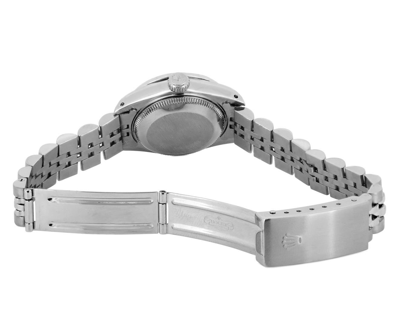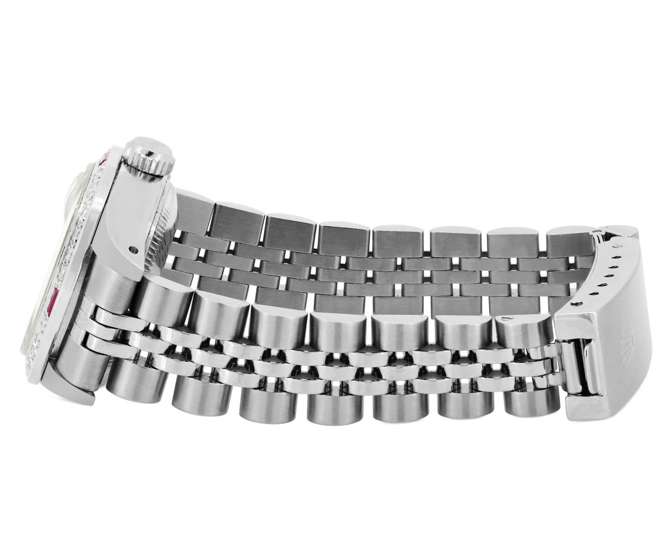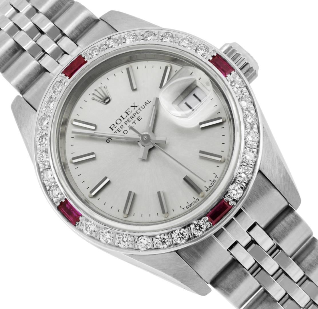 One Rolex Ladies Pre Owned Stainless Steel Date Wristwatch Polished Bright with Satin Finish, Serviced & Electronically Tested, Stainless Steel Case: 26mm, Stainless Steel Crown, Custom Bezel: New 18K White Gold Ruby Beadset Diamond Bezel, Diamond + Gem Count: 36 Diamonds + 4 Rubies. Custom Crystal: New Sapphire With Magnified Date Window. Custom Hands: New Luminescent Hands. Rolex Movement: 2135 Automatic Winding Movement. Rolex Dial: Factory Silver With Index Hour Markers And Lumi Dots. Date Window: 3 O'Clock Position Date Display, Model: Quickset Date. Condition: G-6 Extra Fine. Rolex Bracelet: Stainless Steel Jubilee Band. Bright Polish & Satin Finish. 6.0 Inch Length, Adjustable. Standard Clasp, With Rolex Logo. This Watch Has Been Serviced Time Tested And Is In Excellent Condition. It Is Free Of All Scratches And Dents. This Watch Comes With A Rolex Box.