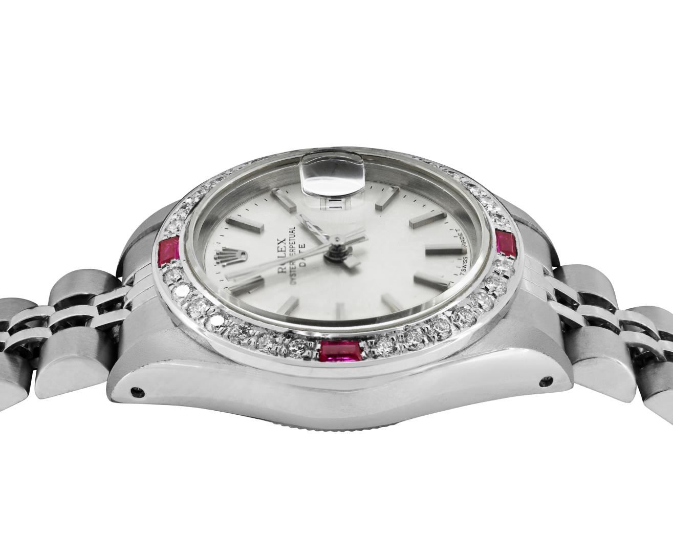 One Rolex Ladies Pre Owned Stainless Steel Date Wristwatch Polished Bright with Satin Finish, Serviced & Electronically Tested, Stainless Steel Case: 26mm, Stainless Steel Crown, Custom Bezel: New 18K White Gold Ruby Beadset Diamond Bezel, Diamond + Gem Count: 36 Diamonds + 4 Rubies. Custom Crystal: New Sapphire With Magnified Date Window. Custom Hands: New Luminescent Hands. Rolex Movement: 2135 Automatic Winding Movement. Rolex Dial: Factory Silver With Index Hour Markers And Lumi Dots. Date Window: 3 O'Clock Position Date Display, Model: Quickset Date. Condition: G-6 Extra Fine. Rolex Bracelet: Stainless Steel Jubilee Band. Bright Polish & Satin Finish. 6.0 Inch Length, Adjustable. Standard Clasp, With Rolex Logo. This Watch Has Been Serviced Time Tested And Is In Excellent Condition. It Is Free Of All Scratches And Dents. This Watch Comes With A Rolex Box.