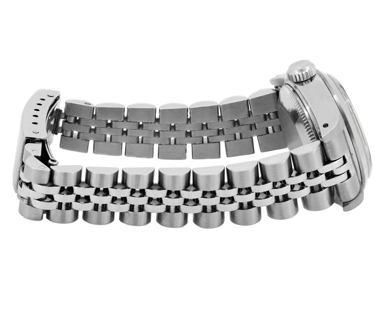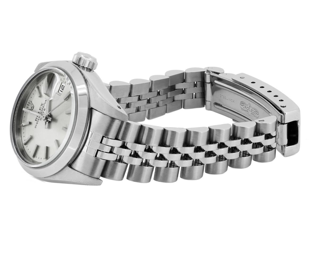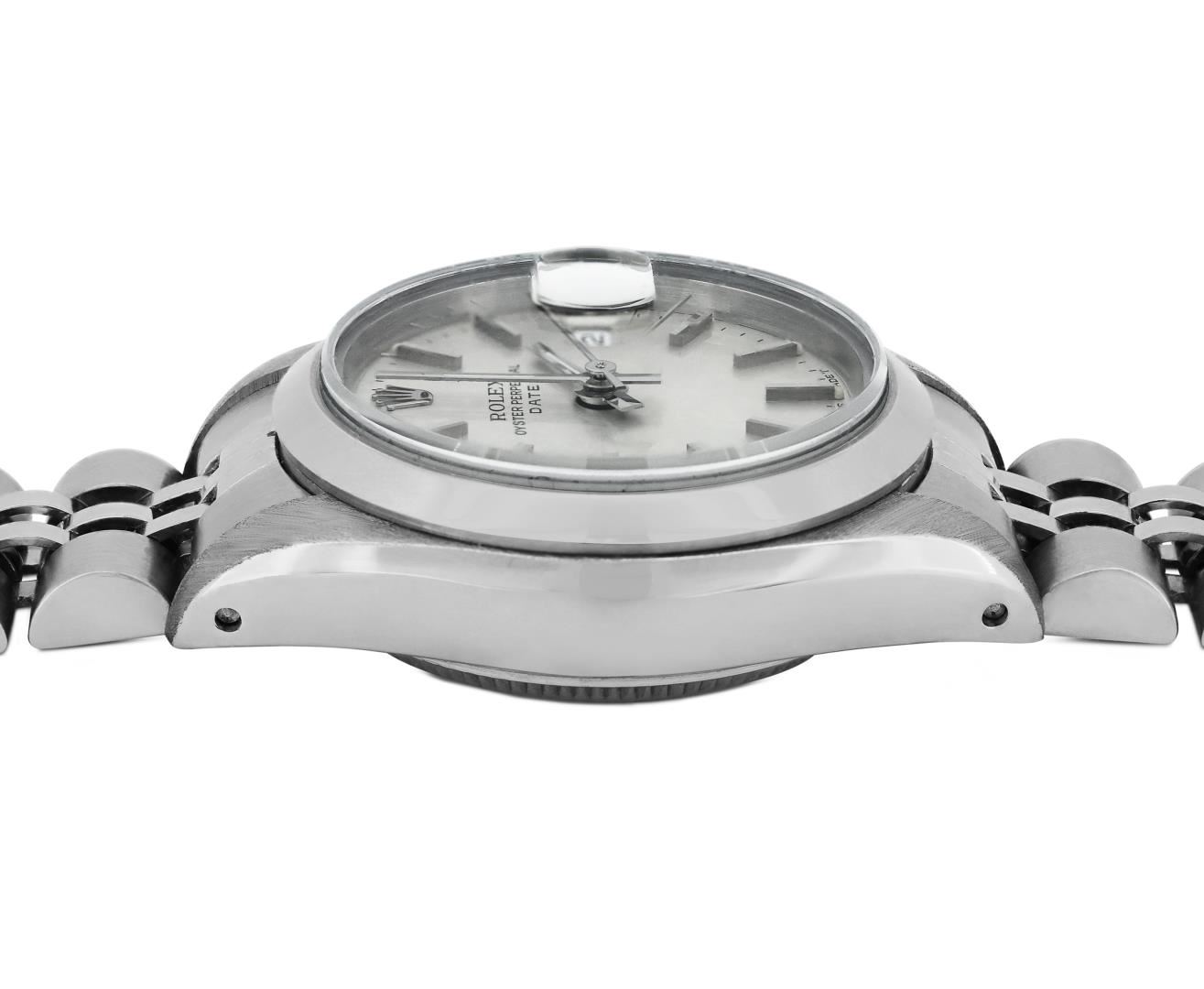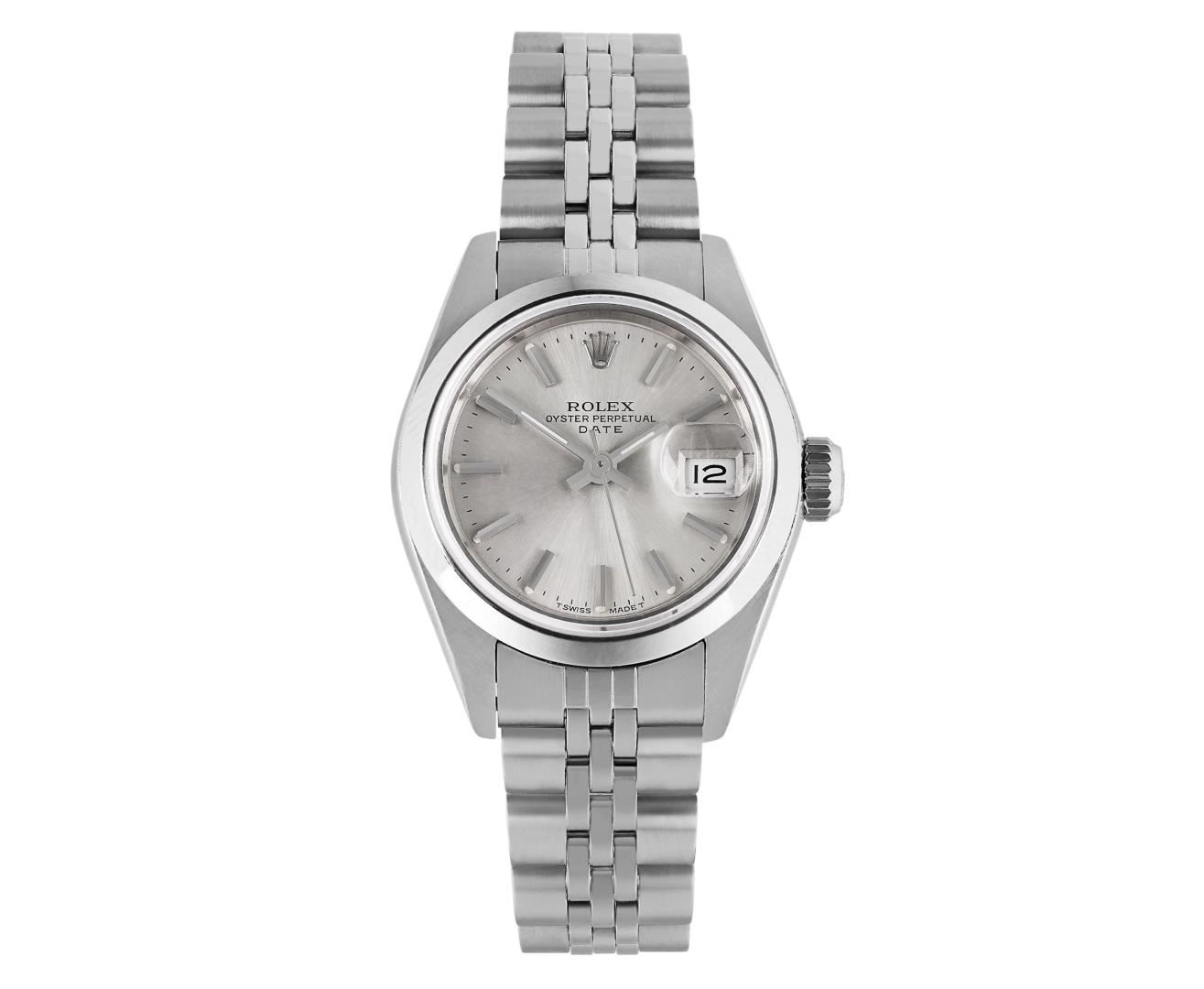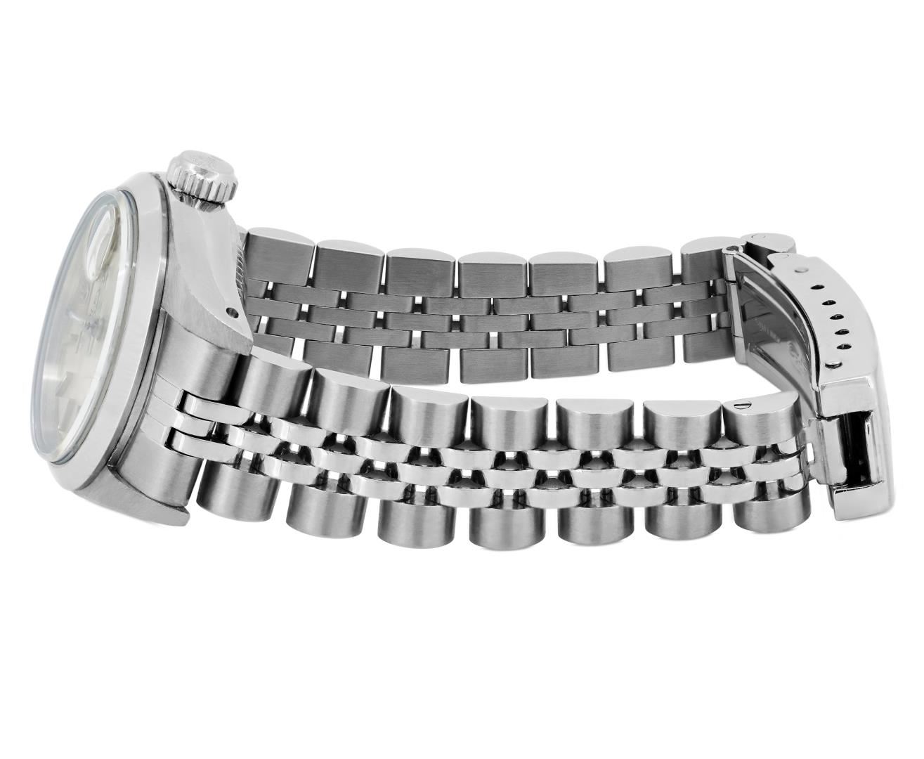 One Rolex Ladies Pre Owned Stainless Steel Date Wristwatch Polished Bright with Satin Finish, Serviced & Electronically Tested, Stainless Steel Case: 26mm, Stainless Steel Crown, Rolex Bezel: Rolex Stainless Steel Smooth bezel. Custom Crystal: New Sapphire With Magnified Date Window. Custom Hands: New Luminescent Hands. Rolex Movement: 2135 Automatic Winding Movement. Rolex Dial: Factory Silver Dial With Index Hour Markers, Lumi Dots and Dash Tracks. Date Window: 3 O'Clock Position Date Display, Model: Quickset Date. Condition: G-6 Extra Fine. Rolex Bracelet: Stainless Steel Jubilee Band. Bright Polish & Satin Finish. 6.0 Inch Length, Adjustable. Standard Clasp, With Rolex Logo. This Watch Has Been Serviced And Time Tested. It Is In Excellent Condition, Free Of All Scratches And Dents. This Watch Comes With A Rolex Box.