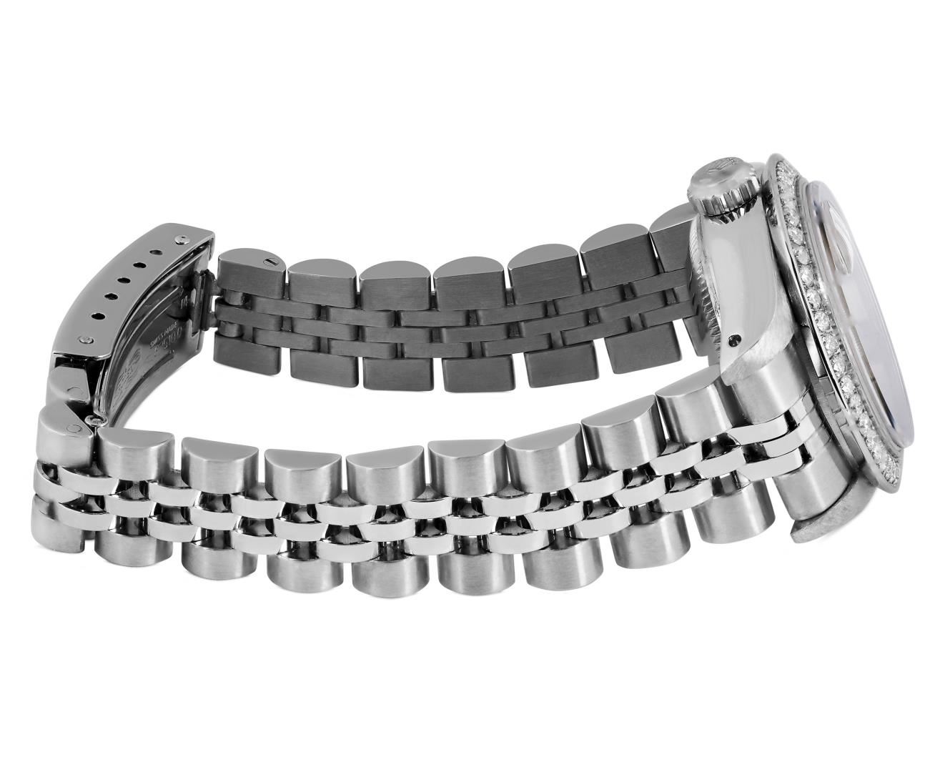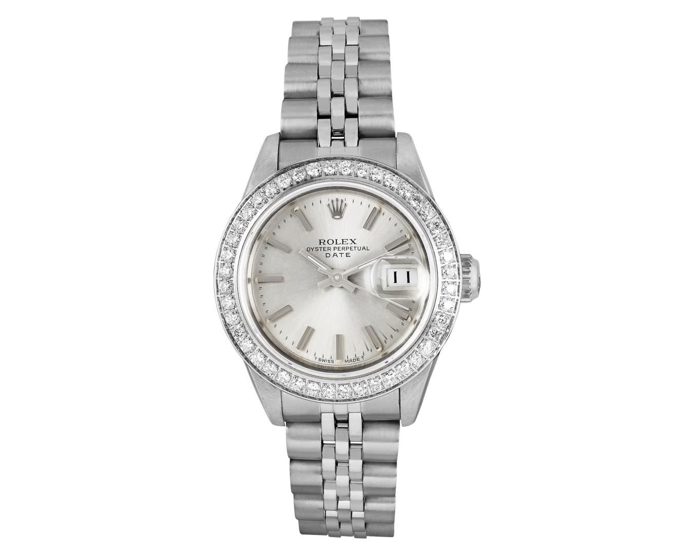 One Rolex Ladies Pre Owned Stainless Steel Date Wristwatch Polished Bright with Satin Finish, Serviced And Electronically Tested, Stainless Steel Case: 26mm, Stainless Steel Crown, Custom Bezel: New Stainless Steel Beadset Diamond Bezel, Diamond Count: 40 Diamonds On Bezel. Custom Crystal: New Sapphire With Magnified Date Window. Custom Hands: New Luminescent Hands. Rolex Movement: 2135 Automatic Winding Movement. Rolex Dial: Factory Silver With Index Hour Markers And Lumi Dots. Date Window: 3 O'Clock Position Date Display, Model: Quickset Date. Condition: G-6 Extra Fine. Rolex Bracelet: Stainless Steel Jubilee Band. Bright Polish & Satin Finish. 6.0 Inch Length, Adjustable. Standard Clasp, With Rolex Logo. This Watch Has Been Serviced And Time Tested. It Is In Excellent Condition, Free Of All Scratches And Dents. This Watch Comes With A Rolex Box.