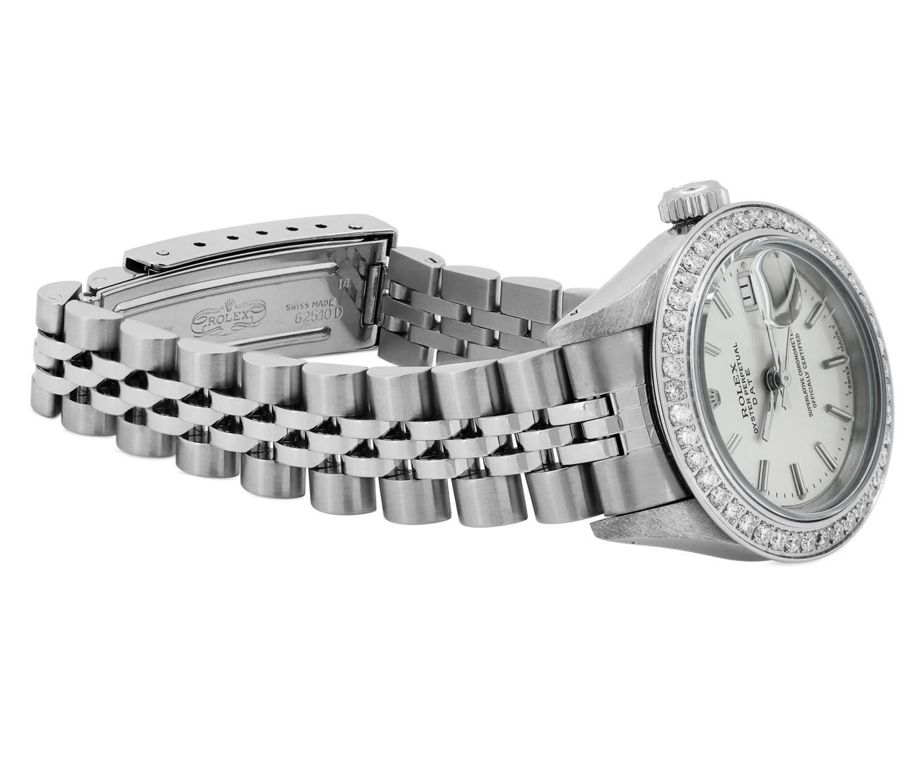 One Rolex Ladies Pre Owned Stainless Steel Date Wristwatch Polished Bright with Satin Finish, Serviced And Electronically Tested, Stainless Steel Case: 26mm, Stainless Steel Crown, Custom Bezel: New Stainless Steel Beadset Diamond Bezel, Diamond Count: 40 Diamonds. Custom Crystal: New Sapphire With Magnified Date Window. Custom Hands: New Luminescent Hands. Rolex Movement: 2135 Automatic Winding Movement. Rolex Dial: Factory Silver With Index Hour Markers And Lumi Dots. Date Window: 3 O'Clock Position Date Display, Model: Quickset Date. Condition: G-6 Extra Fine. Rolex Bracelet: Stainless Steel Jubilee Band. Bright Polish And Satin Finish. 6.0 Inch Length, Adjustable. Standard Clasp, With Rolex Logo. This Watch Has Been Serviced And Time Tested. It Is In Excellent Condition, Free Of All Scratches And Dents. This Watch Comes With A Rolex Box.