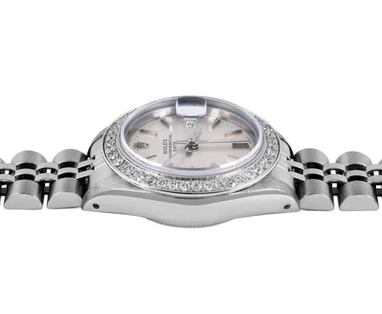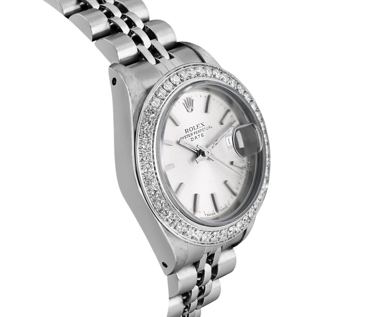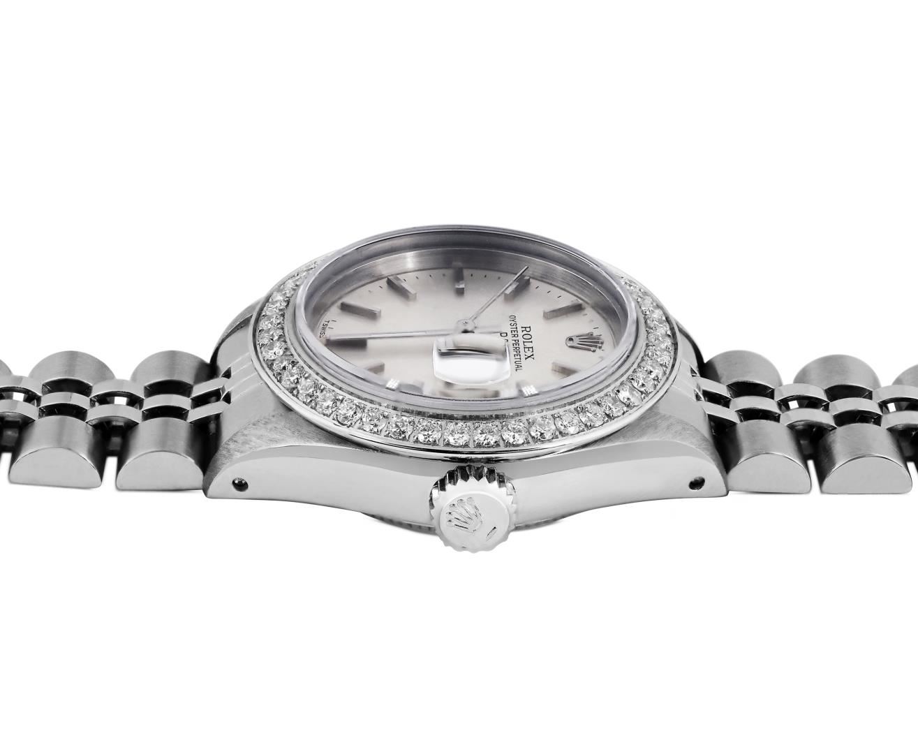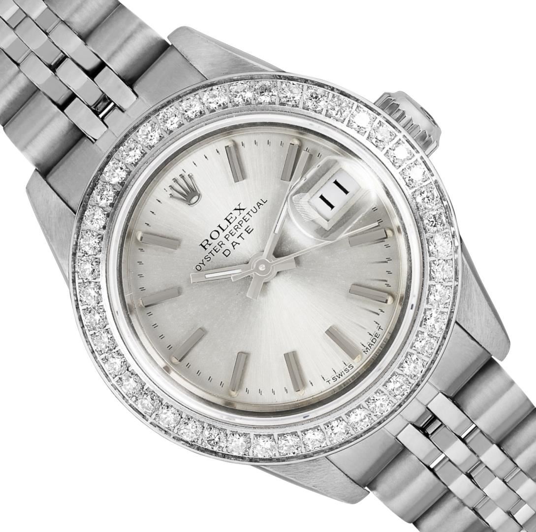 One Rolex Ladies Pre Owned Stainless Steel Date Wristwatch Polished Bright with Satin Finish, Serviced And Electronically Tested, Stainless Steel Case: 26mm, Stainless Steel Crown, Custom Bezel: New Stainless Steel Beadset Diamond Bezel, Diamond Count: 40 Diamonds On Bezel. Custom Crystal: New Sapphire With Magnified Date Window. Custom Hands: New Luminescent Hands. Rolex Movement: 2135 Automatic Winding Movement. Rolex Dial: Factory Silver With Index Hour Markers And Lumi Dots. Date Window: 3 O'Clock Position Date Display, Model: Quickset Date. Condition: G-6 Extra Fine. Rolex Bracelet: Stainless Steel Jubilee Band. Bright Polish & Satin Finish. 6.0 Inch Length, Adjustable. Standard Clasp, With Rolex Logo. This Watch Has Been Serviced And Time Tested. It Is In Excellent Condition, Free Of All Scratches And Dents. This Watch Comes With A Rolex Box.