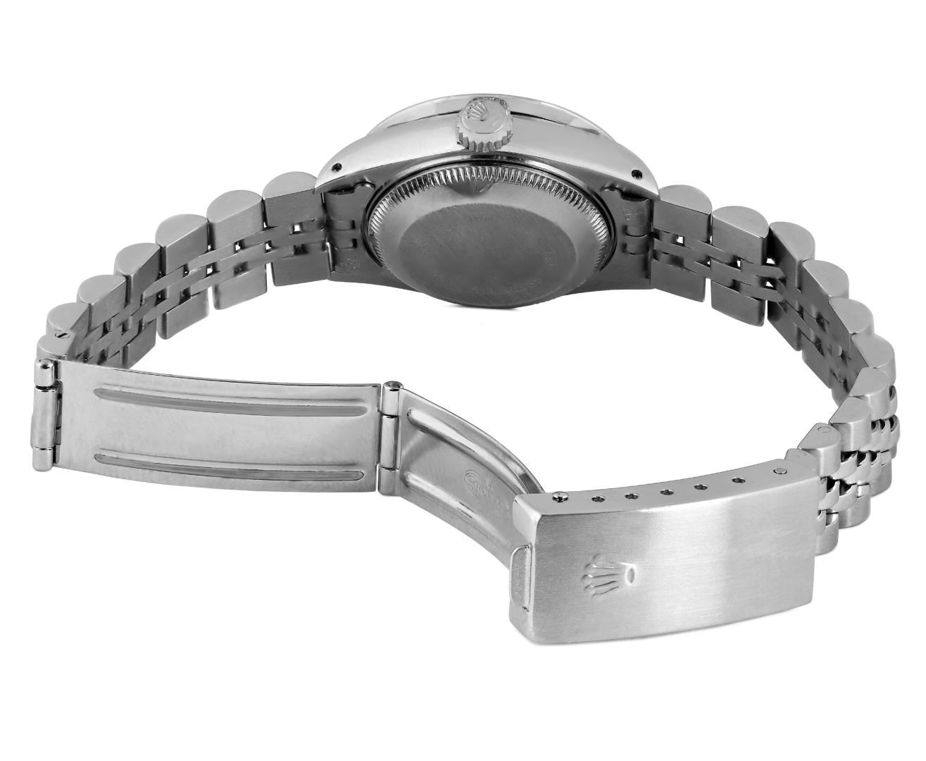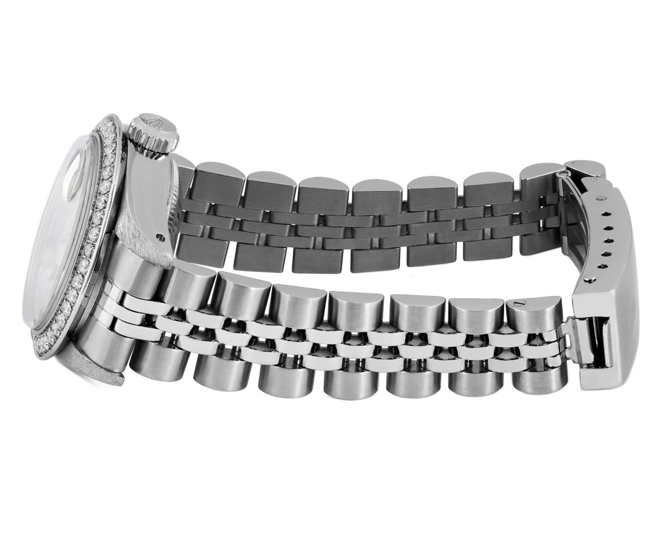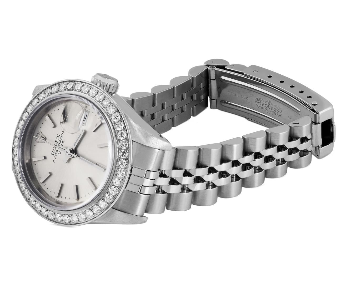 One Rolex Ladies Pre Owned Stainless Steel Date Wristwatch Polished Bright with Satin Finish, Serviced And Electronically Tested, Stainless Steel Case: 26mm, Stainless Steel Crown, Custom Bezel: New Stainless Steel Beadset Diamond Bezel, Diamond Count: 40 Diamonds On Bezel. Custom Crystal: New Sapphire With Magnified Date Window. Custom Hands: New Luminescent Hands. Rolex Movement: 2135 Automatic Winding Movement. Rolex Dial: Factory Silver With Index Hour Markers And Lumi Dots. Date Window: 3 O'Clock Position Date Display, Model: Quickset Date. Condition: G-6 Extra Fine. Rolex Bracelet: Stainless Steel Jubilee Band. Bright Polish & Satin Finish. 6.0 Inch Length, Adjustable. Standard Clasp, With Rolex Logo. This Watch Has Been Serviced And Time Tested. It Is In Excellent Condition, Free Of All Scratches And Dents. This Watch Comes With A Rolex Box.