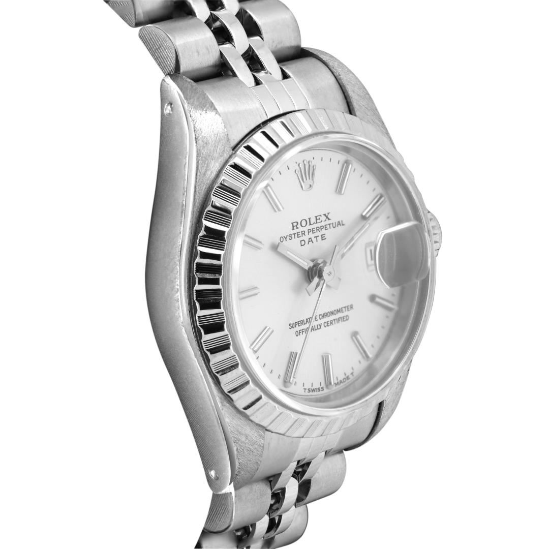 One Rolex Ladies Pre Owned Stainless Steel Date Wristwatch Polished Bright with Satin Finish, Serviced & Electronically Tested, Stainless Steel Case: 26mm, Stainless Steel Crown, Rolex Stainless Steel Engine Turn bezel. Custom Crystal: New Sapphire With Magnified Date Window. Custom Hands: New Luminescent Hands. Rolex Movement: 2135 Automatic Winding Movement. Rolex Dial: Factory Silver With Index Hour Markers And Lumi Dots. Date Window: 3 O'Clock Position Date Display, Model: Quickset Date. Condition: G-6 Extra Fine. Rolex Bracelet: Stainless Steel Jubilee Band. Bright Polish & Satin Finish. 6.0 Inch Length, Adjustable. Standard Clasp, With Rolex Logo. This Watch Has Been Serviced And Time Tested. It Is In Excellent Condition, Free Of All Scratches And Dents. This Watch Comes With A Rolex Box.