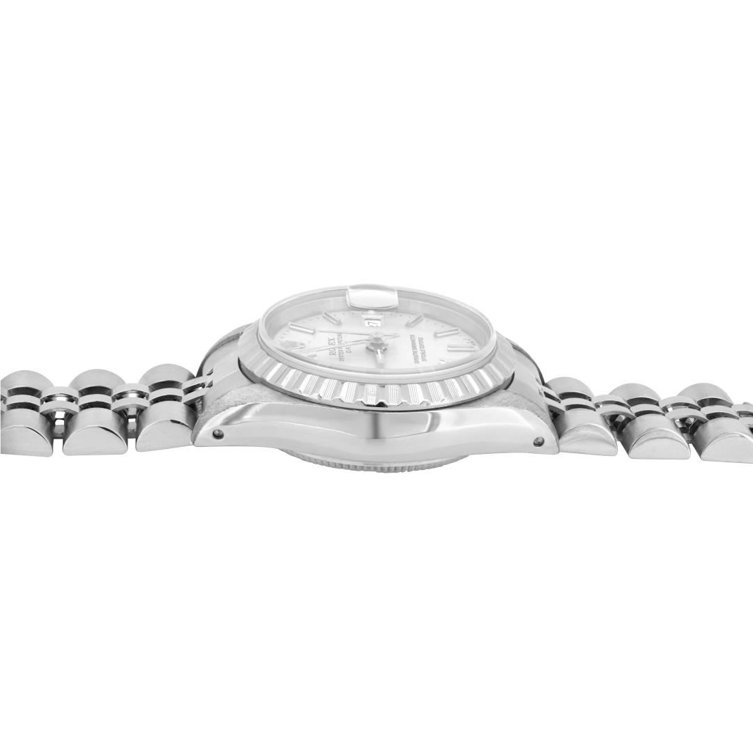 One Rolex Ladies Pre Owned Stainless Steel Date Wristwatch Polished Bright with Satin Finish, Serviced & Electronically Tested, Stainless Steel Case: 26mm, Stainless Steel Crown, Rolex Stainless Steel Engine Turn bezel. Custom Crystal: New Sapphire With Magnified Date Window. Custom Hands: New Luminescent Hands. Rolex Movement: 2135 Automatic Winding Movement. Rolex Dial: Factory Silver With Index Hour Markers And Lumi Dots. Date Window: 3 O'Clock Position Date Display, Model: Quickset Date. Condition: G-6 Extra Fine. Rolex Bracelet: Stainless Steel Jubilee Band. Bright Polish & Satin Finish. 6.0 Inch Length, Adjustable. Standard Clasp, With Rolex Logo. This Watch Has Been Serviced And Time Tested. It Is In Excellent Condition, Free Of All Scratches And Dents. This Watch Comes With A Rolex Box.