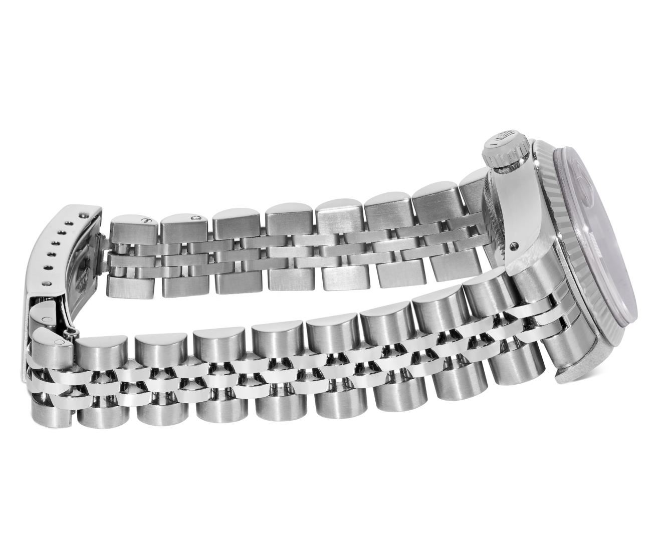 One Rolex Ladies Pre Owned Stainless Steel Datejust Wristwatch Polished Bright with Satin Finish, Serviced & Electronically Tested, Stainless Steel Case: 26mm, Stainless Steel Crown, 18K White Gold Fluted Bezel, Custom Crystal: New Sapphire With Magnifying Date Window. Custom Hands: New Luminescent Hands. Rolex Movement: Rolex Automatic Movement Self Winding 2135. Rolex Dial: Factory Silver With Index Hour Markers And Square Roman Track and Lumi Dots. Date Window: 3 O'Clock Position Date Display, Model: Quickset Datejust. Condition: G-6 Extra Fine. Rolex Bracelet: Stainless Steel Jubilee Band. Bright Polish & Satin Finish. 6.0 Inch Length, Adjustable. Standard Clasp, With Rolex Logo. This Watch Has Been Serviced Time Tested And Is In Excellent Condition. It Is Free Of All Scratches And Dents. This Watch Comes With A Rolex Box.