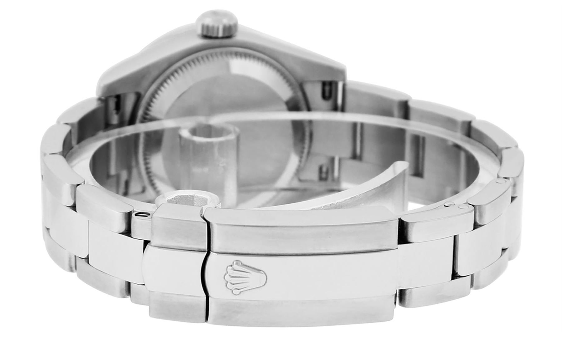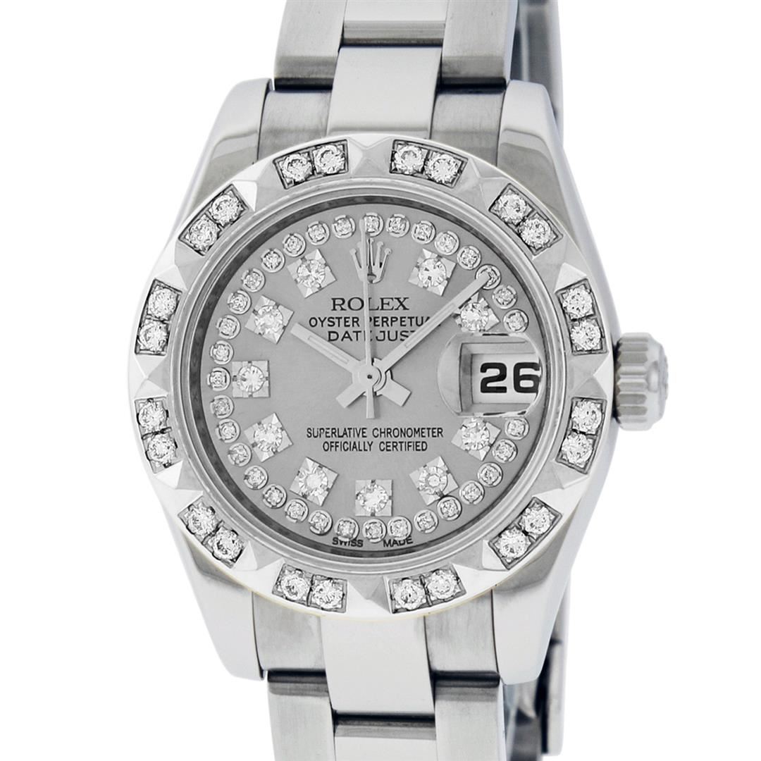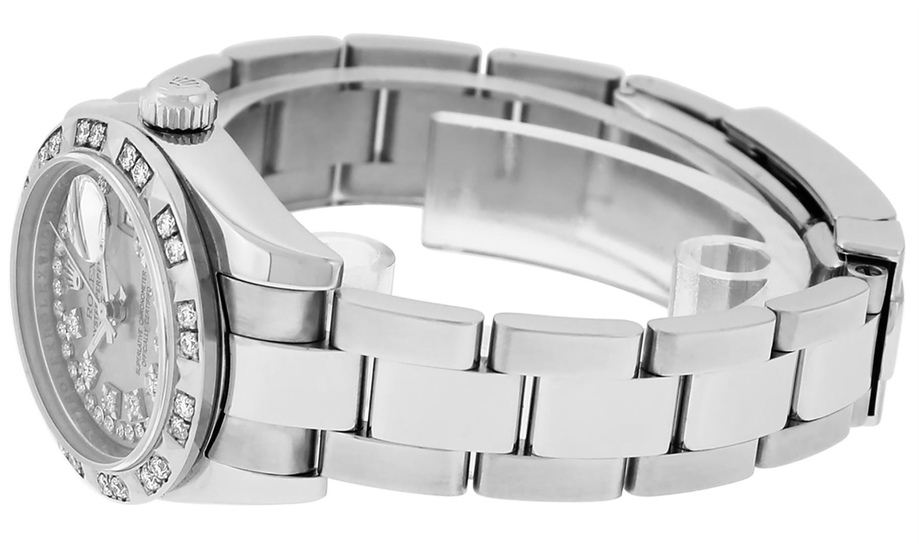 One Quickset Ladies Stainless Steel Rolex Datejust Polished Bright with Satin Finish, Serviced & Electronically Tested, Stainless Steel Case: 26mm, Stainless Steel Crown, Custom Bezel: New 18K White Gold Pyramid Diamond Bezel, Stone Count: 24 Diamonds On Bezel, Total Weight .50 Carat, Clarity: SI-VS, Color: G to H. Custom Crystal: New Scratch Resistant Synthetic Sapphire Cyclops Lens. Custom Hands: New Luminescent Hands. Movement: Automatic Winding Movement Caliber 2235. Custom Dial: Refinished Single Cut Slate Grey String String Diamond Dial, 43 Diamonds in Dial, G To H In Color, Clarity: VS. Date Window: 3 O'Clock Position Date Display, Model: 179160 Quickjset Datejust. Condition: G-6 Extra Fine. Bracelet: Stainless Steel Oyster Band. Bright Polish & Satin Finish. 6.0 Inch Length, Adjustable. Standard Clasp, With Rolex Logo. This Watch Has Been Serviced Time Tested And Is In Excellent Condition It Is Free Of All Scratches And Dents.