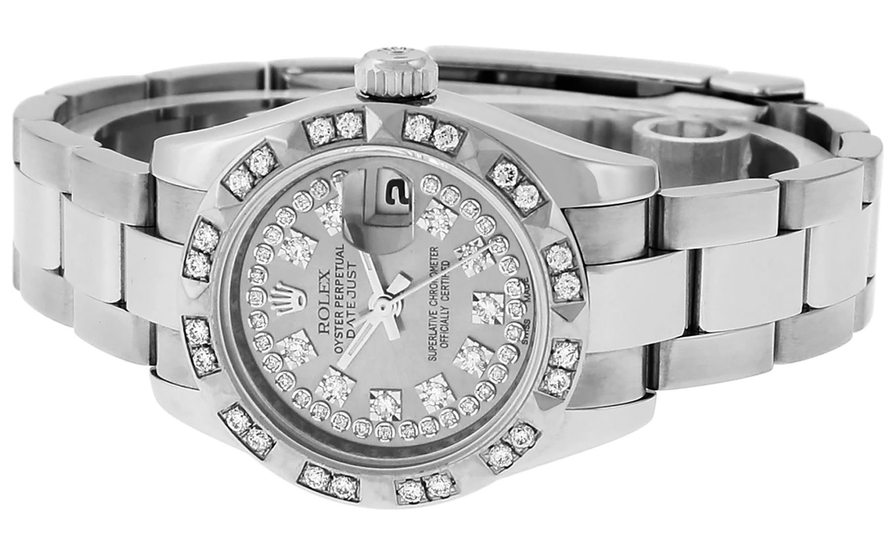 One Quickset Ladies Stainless Steel Rolex Datejust Polished Bright with Satin Finish, Serviced & Electronically Tested, Stainless Steel Case: 26mm, Stainless Steel Crown, Custom Bezel: New 18K White Gold Pyramid Diamond Bezel, Stone Count: 24 Diamonds On Bezel, Total Weight .50 Carat, Clarity: SI-VS, Color: G to H. Custom Crystal: New Scratch Resistant Synthetic Sapphire Cyclops Lens. Custom Hands: New Luminescent Hands. Movement: Automatic Winding Movement Caliber 2235. Custom Dial: Refinished Single Cut Slate Grey String String Diamond Dial, 43 Diamonds in Dial, G To H In Color, Clarity: VS. Date Window: 3 O'Clock Position Date Display, Model: 179160 Quickjset Datejust. Condition: G-6 Extra Fine. Bracelet: Stainless Steel Oyster Band. Bright Polish & Satin Finish. 6.0 Inch Length, Adjustable. Standard Clasp, With Rolex Logo. This Watch Has Been Serviced Time Tested And Is In Excellent Condition It Is Free Of All Scratches And Dents.