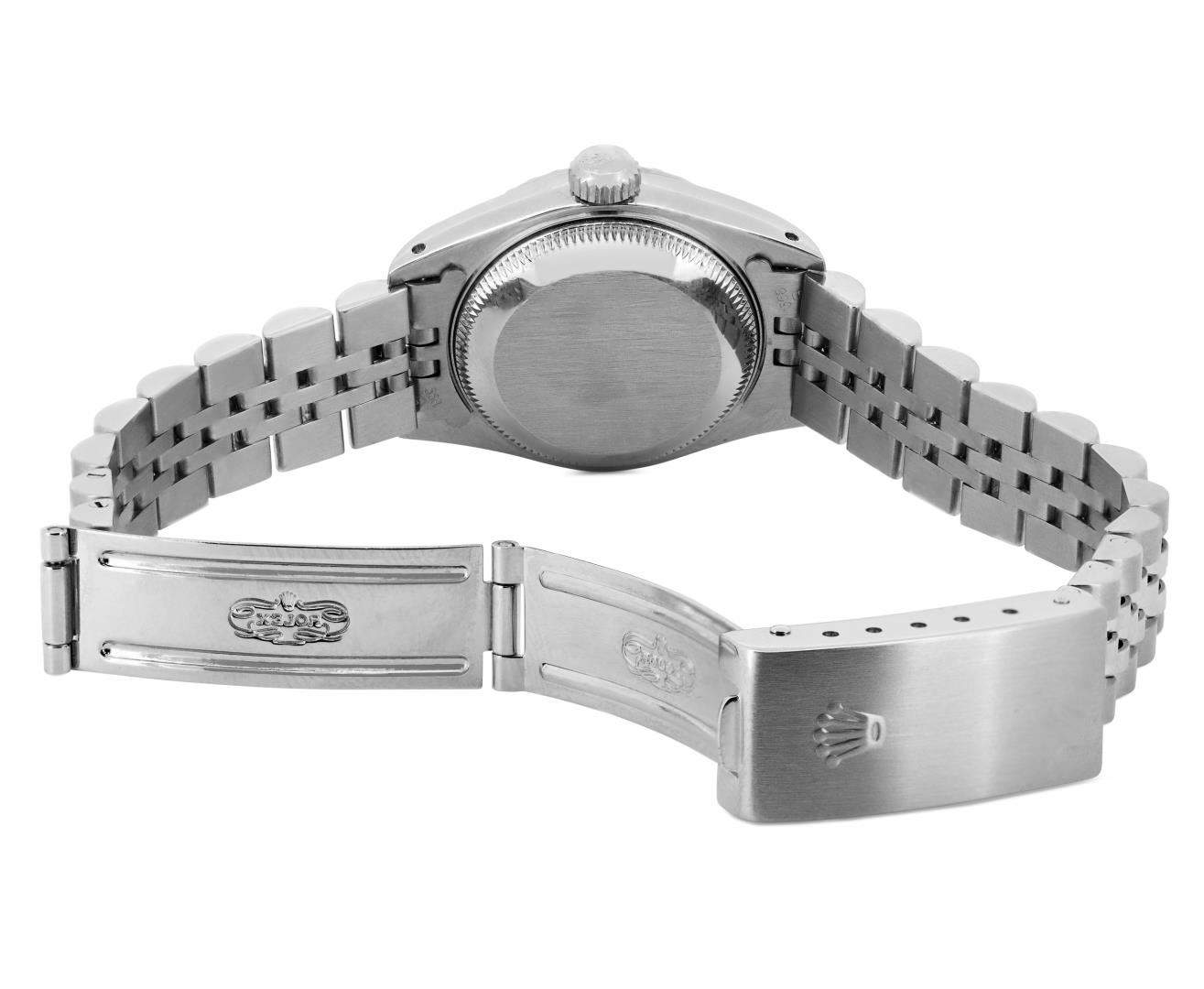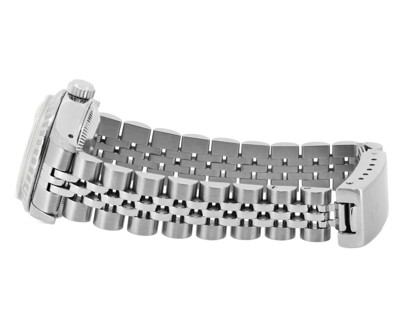 One Rolex Ladies Pre Owned Stainless Steel Date Wristwatch Polished Bright with Satin Finish, Serviced & Electronically Tested, Stainless Steel Case: 26mm, Stainless Steel Crown, Rolex Stainless Steel Engine Turn bezel. Custom Crystal: New Sapphire With Magnified Date Window. Custom Hands: New Luminescent Hands. Rolex Movement: 2135 Automatic Winding Movement. Rolex Dial: Factory White Dial With Roman Hour Markers and Index Markers And Lumi Dots and Dash Tracks. Date Window: 3 O'Clock Position Date Display, Model: Quickset Date. Condition: G-6 Extra Fine. Rolex Bracelet: Stainless Steel Jubilee Band. Bright Polish & Satin Finish. 6.0 Inch Length, Adjustable. Standard Clasp, With Rolex Logo. This Watch Has Been Serviced And Time Tested. It Is In Excellent Condition, Free Of All Scratches And Dents. This Watch Comes With A Rolex Box.