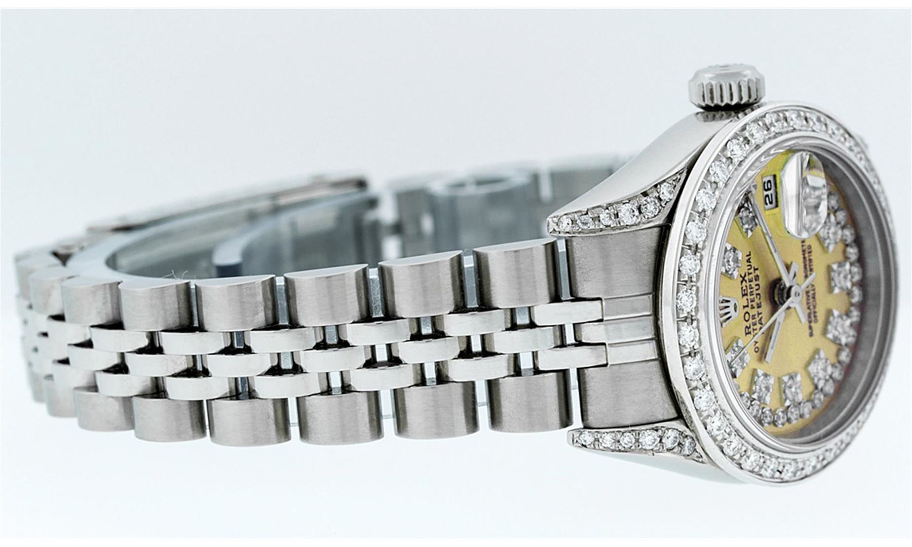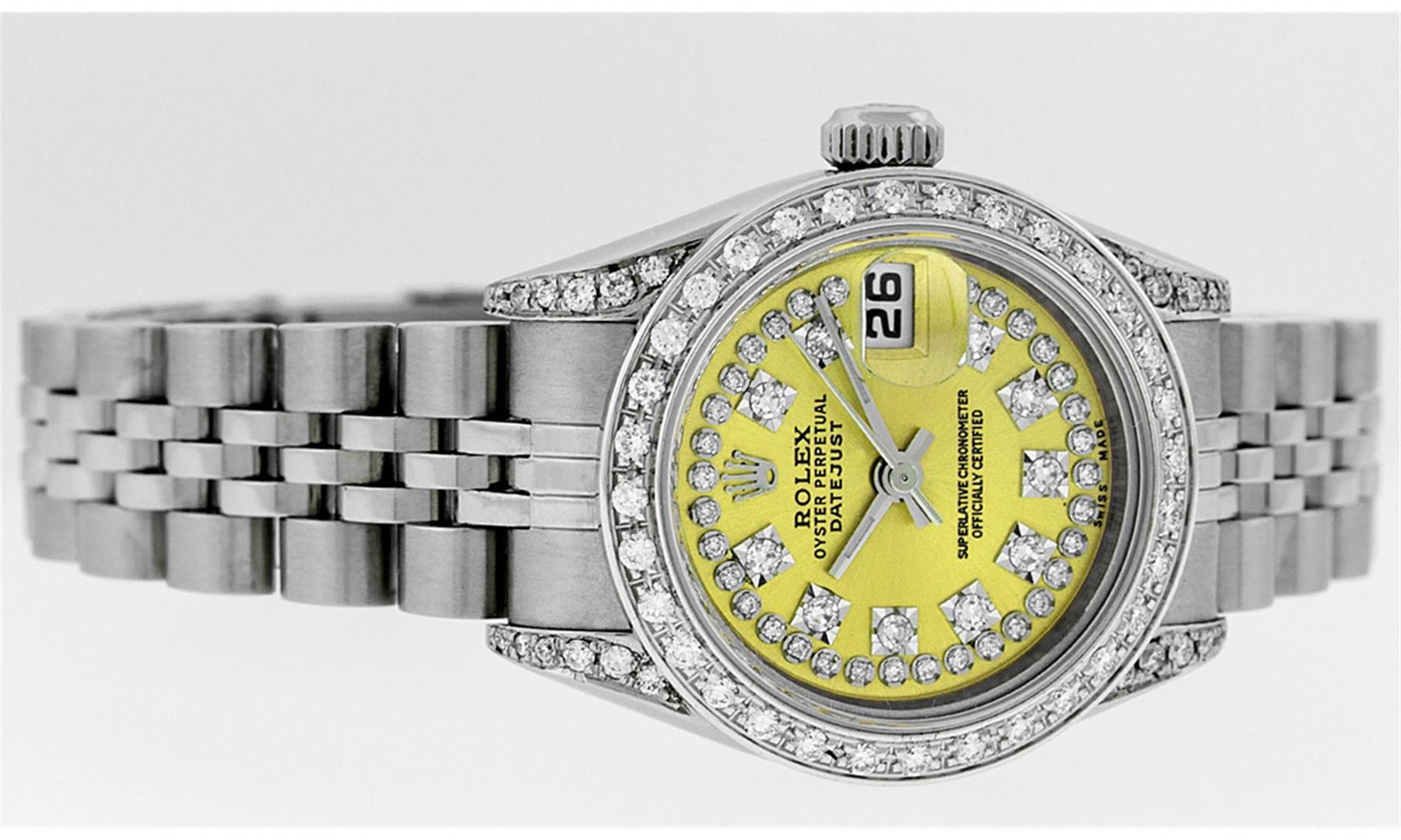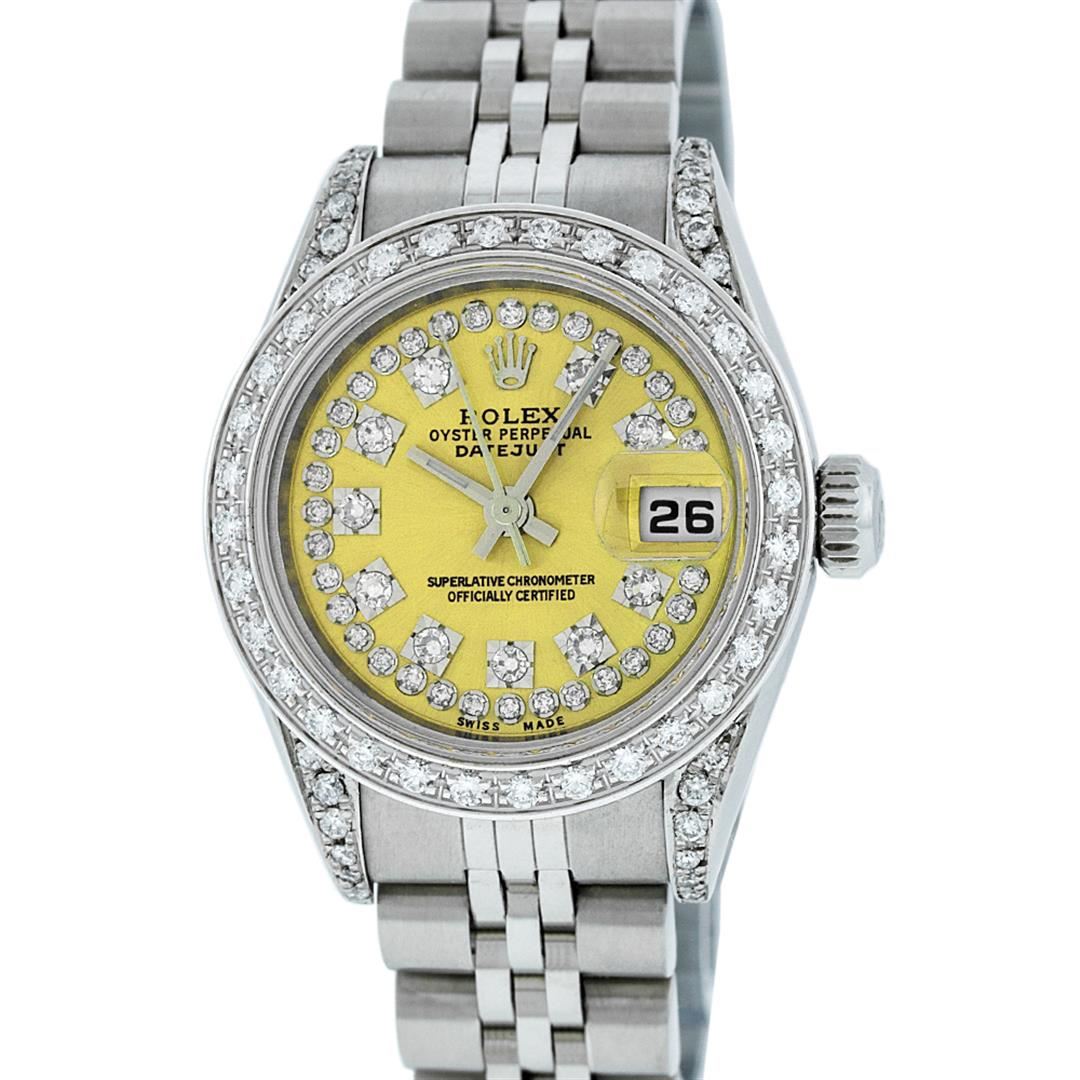 One Quickset Ladies Stainless Steel Rolex Datejust Polished Bright with Satin Finish, Serviced & Electronically Tested, Stainless Steel Case: 26mm, Stainless Steel Crown, Custom Diamond Lugs: 24 Diamonds On Lugs, Clarity: SI-VS, Color: G to H. Custom Bezel: New 18K White Gold Beadset Diamond Bezel, Stone Count: 32 Diamonds On Bezel. Custom Crystal: New Sapphire With Date Window. Custom Hands: New Luminescent Hands. Movement: Automatic Winding Movement. Custom Dial: Refinished To Yellow With Custom Added String Diamonds, 43 Diamonds in Dial G To H In Color, Clarity: VS. Date Window: 3 O'Clock Position Date Display, Model: Quickset Datejust. Condition: G-6 Extra Fine. Rolex Bracelet: Stainless Steel Jubilee Band. Bright Polish & Satin Finish. 6.0 Inch Length, Adjustable. Standard Clasp, With Rolex Logo. This Watch Has Been Serviced Time Tested And Is In Excellent Condition It Is Free Of All Scratches And Dents.