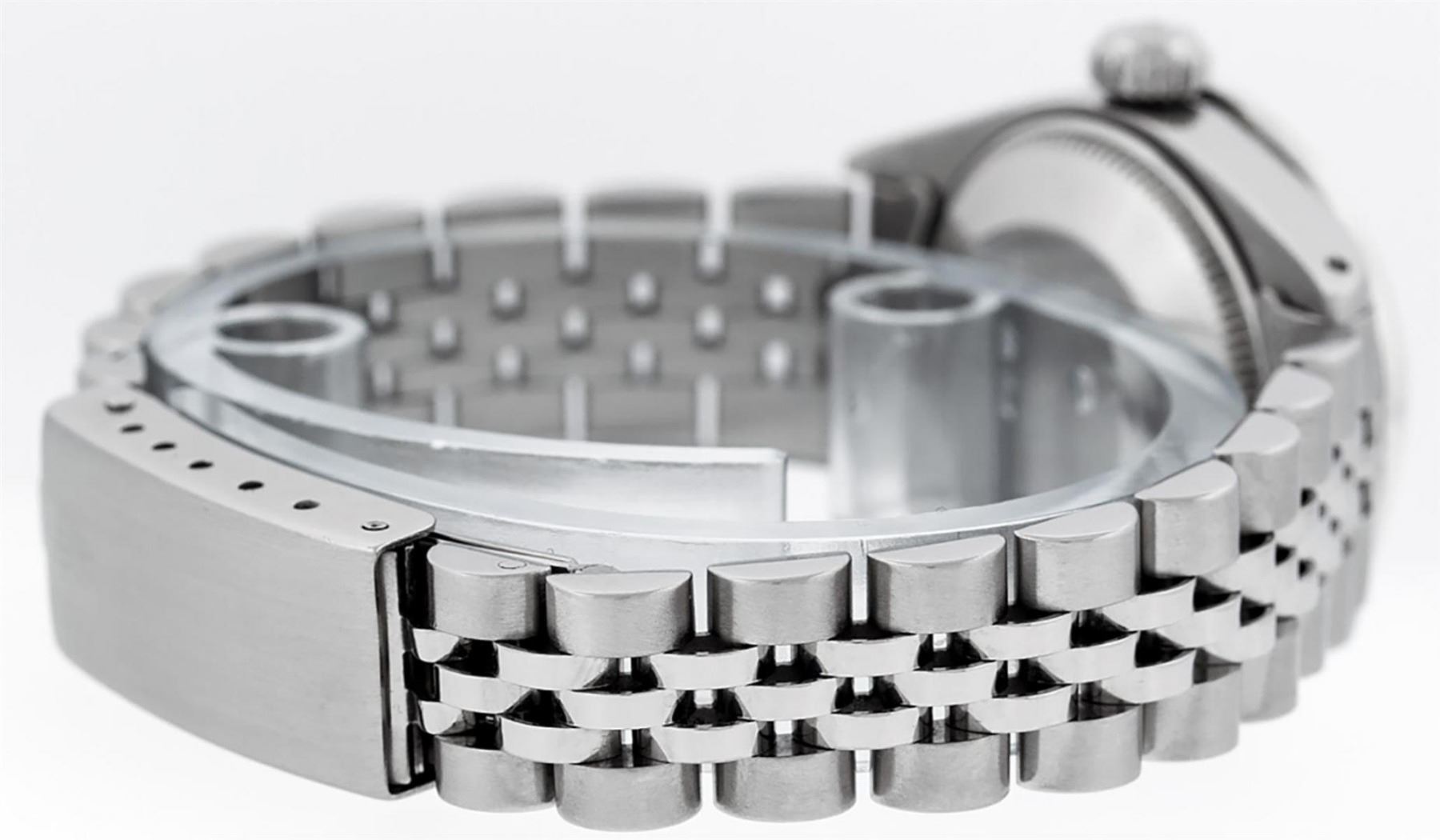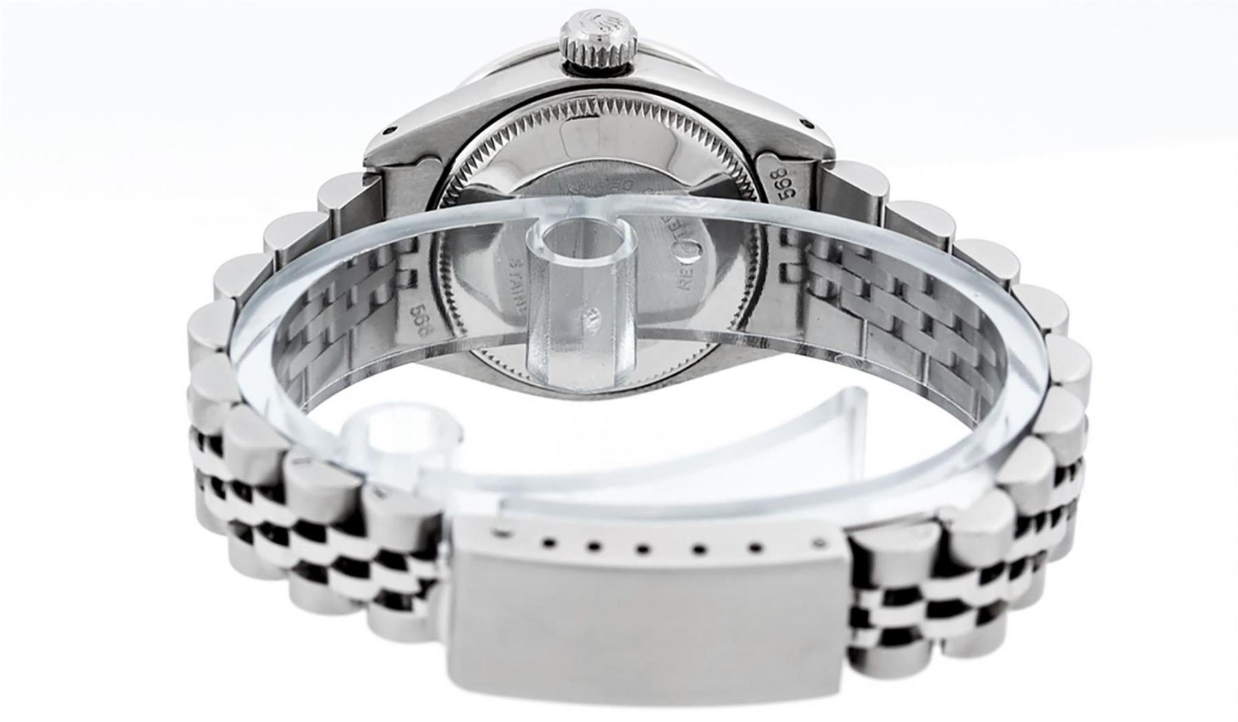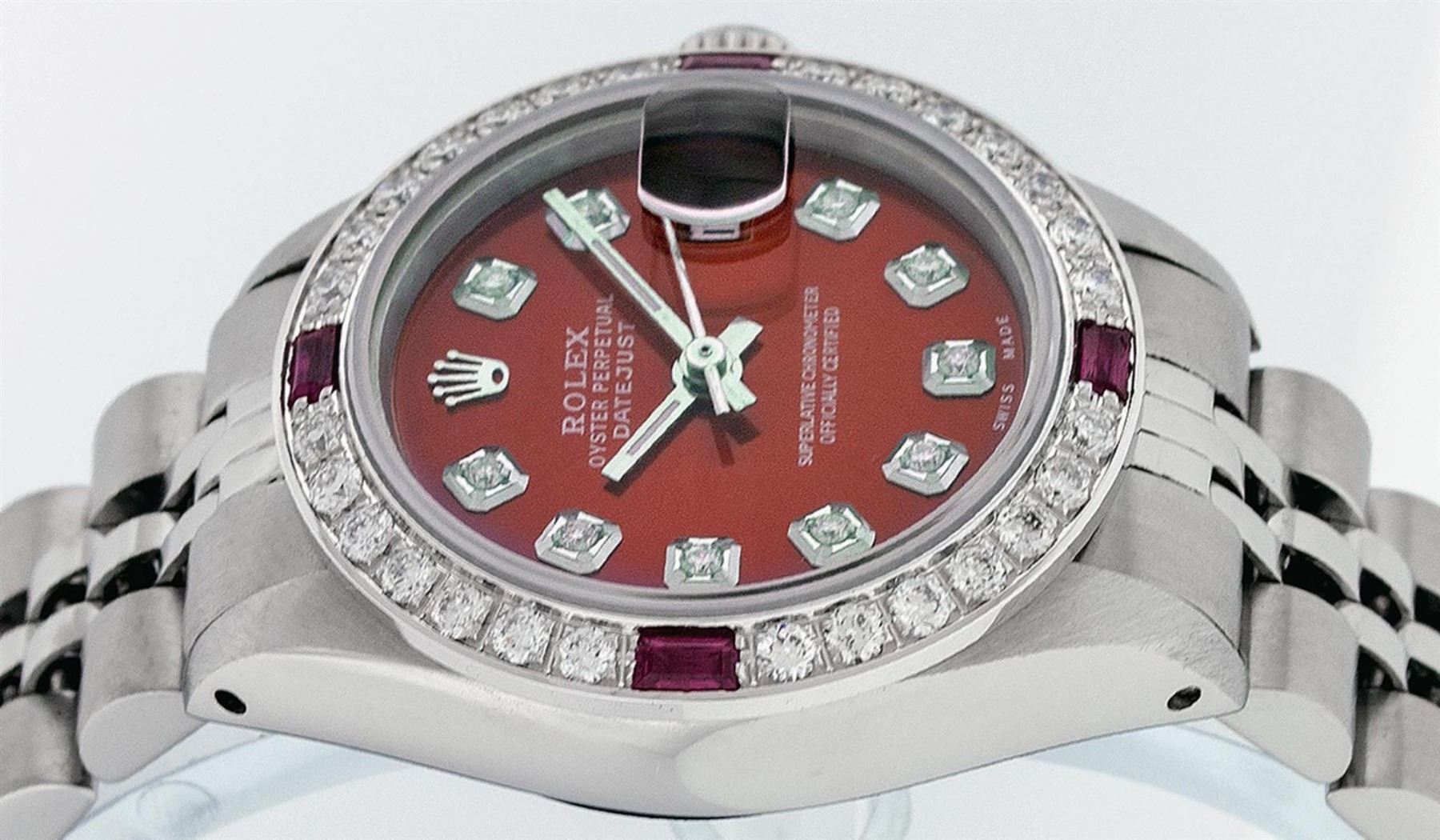 One Ladies Stainless Steel Rolex Datejust Polished Bright with Satin Finish, Serviced & Electronically Tested, Stainless Steel Case: 26mm, Stainless Steel Crown, Custom Bezel: New 18K White Gold Ruby Beadset Diamond Bezel, Diamond + Gem Count: 28 Diamonds + 4 Rubies. Total Weight .70 Carat, Clarity: SI-VS, Color: G to H. Custom Crystal: New Synthetic Sapphire Cyclops Lens. Custom Hands: New Luminescent Hands. Movement: Automatic Winding Movement Caliber 2030. Custom Dial: Refinished Red With Diamond Hour Markers, 10 Diamonds in Dial G To H In Color, Clarity: SI-VS. Date Window: 3 O'Clock Position Date Display, Model: Datejust. Condition: G-6 Extra Fine. Bracelet: Stainless Steel Jubilee. Bright Polish & Satin Finish. 6.0 Inch Length, Adjustable. Standard Clasp, With Rolex Logo. This Watch Has Been Serviced Time Tested And Is In Excellent Condition It Is Free Of All Scratches And Dents.