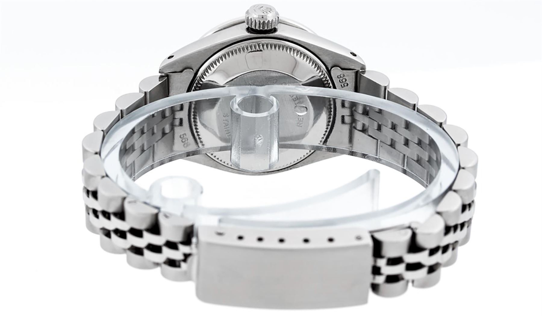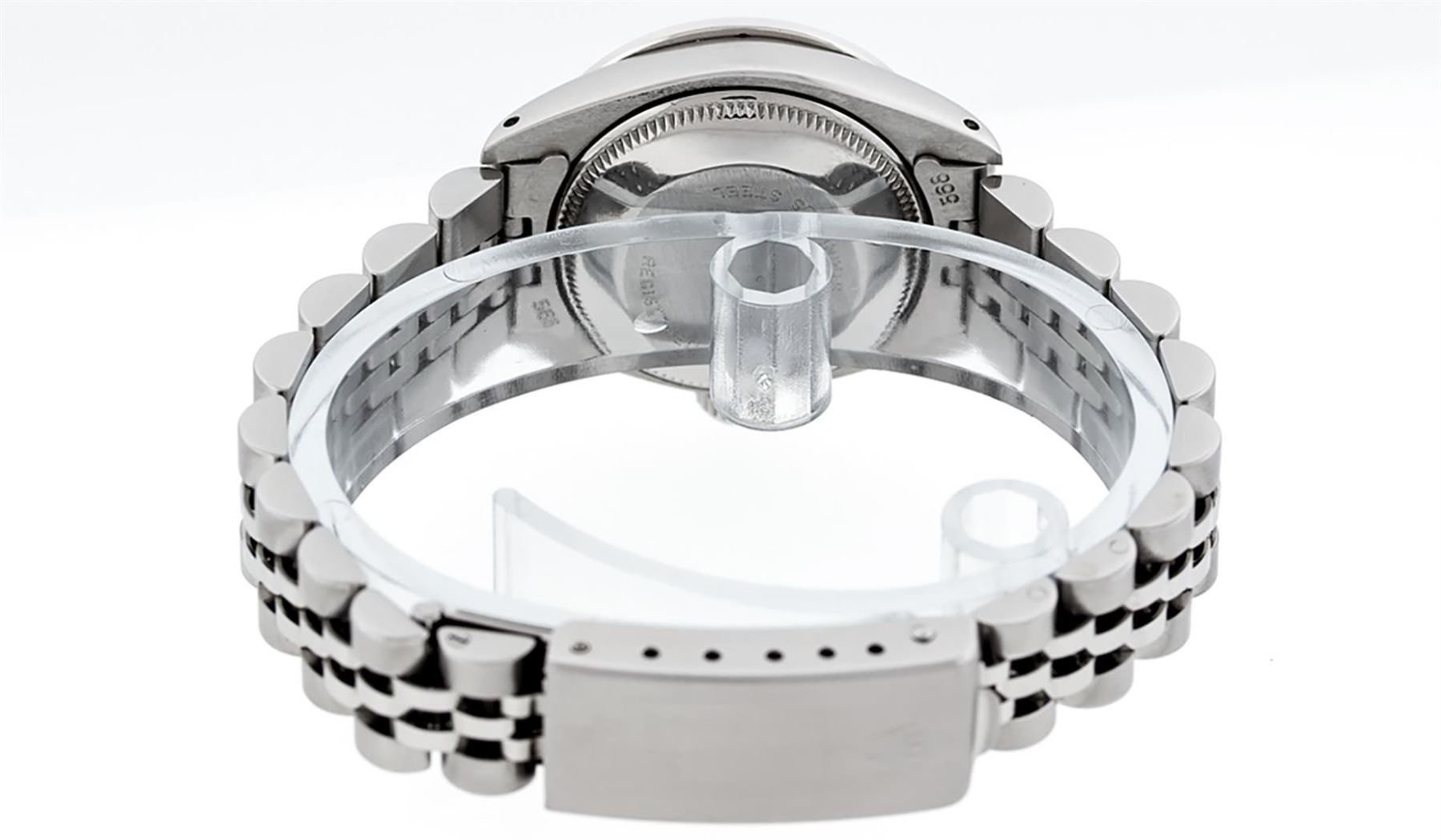 One Ladies Stainless Steel Rolex Datejust Polished Bright with Satin Finish, Serviced & Electronically Tested, Stainless Steel Case: 26mm, Stainless Steel Crown, Custom Bezel: New 18K White Gold Ruby Beadset Diamond Bezel, Diamond + Gem Count: 28 Diamonds + 4 Rubies. Total Weight .70 Carat, Clarity: SI-VS, Color: G to H. Custom Crystal: New Scratch Resistant Synthetic Sapphire Cyclops Lens. Custom Hands: New Luminescent Hands. Movement: Automatic Winding Movement. Custom Dial: Refinished Red With Diamond Hour Markers, 10 Diamonds in Dial G To H In Color, Clarity: SI-VS. Date Window: 3 O'Clock Position Date Display, Model: Datejust. Condition: G-6 Extra Fine. Bracelet: Stainless Steel Jubilee. Polish & Satin Finish. 6.0 Inch Length, Adjustable. Standard Clasp, With Rolex Logo. This Watch Has Been Serviced Time Tested And Is In Excellent Condition It Is Free Of All Scratches And Dents.