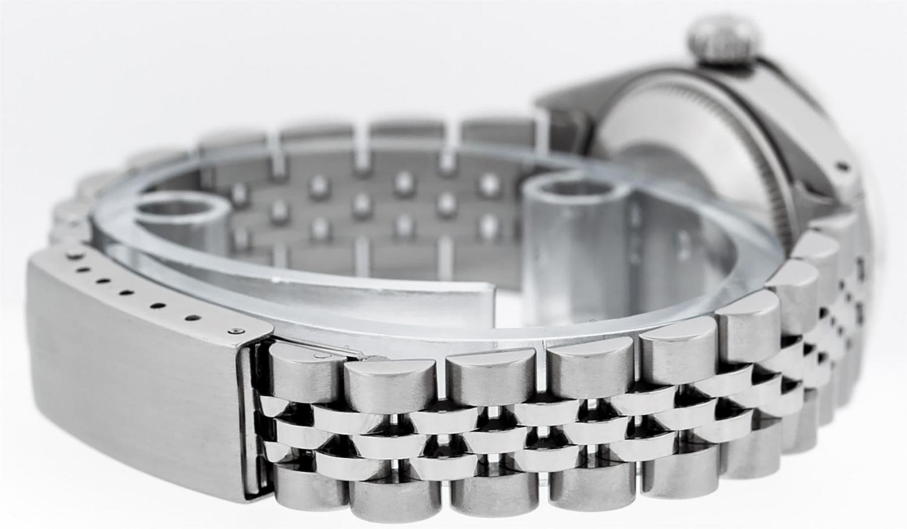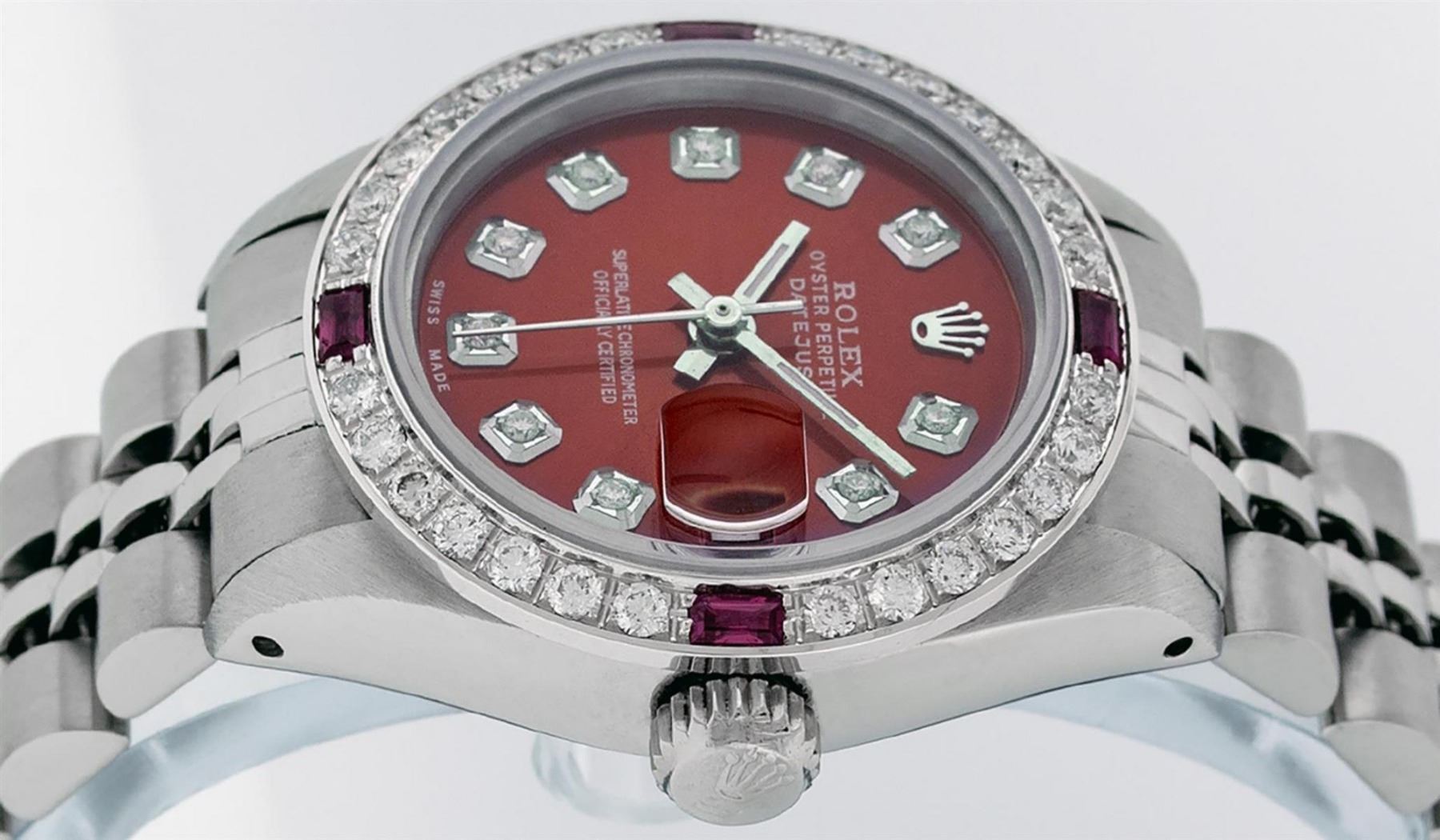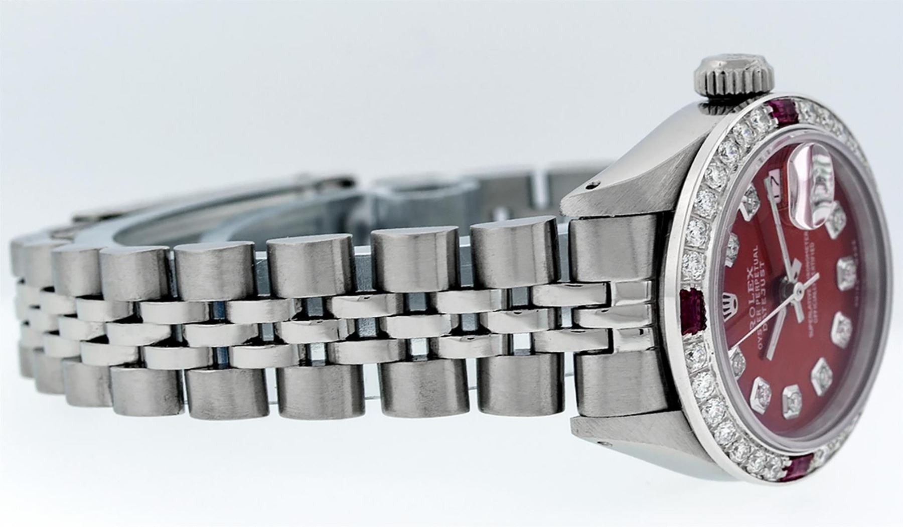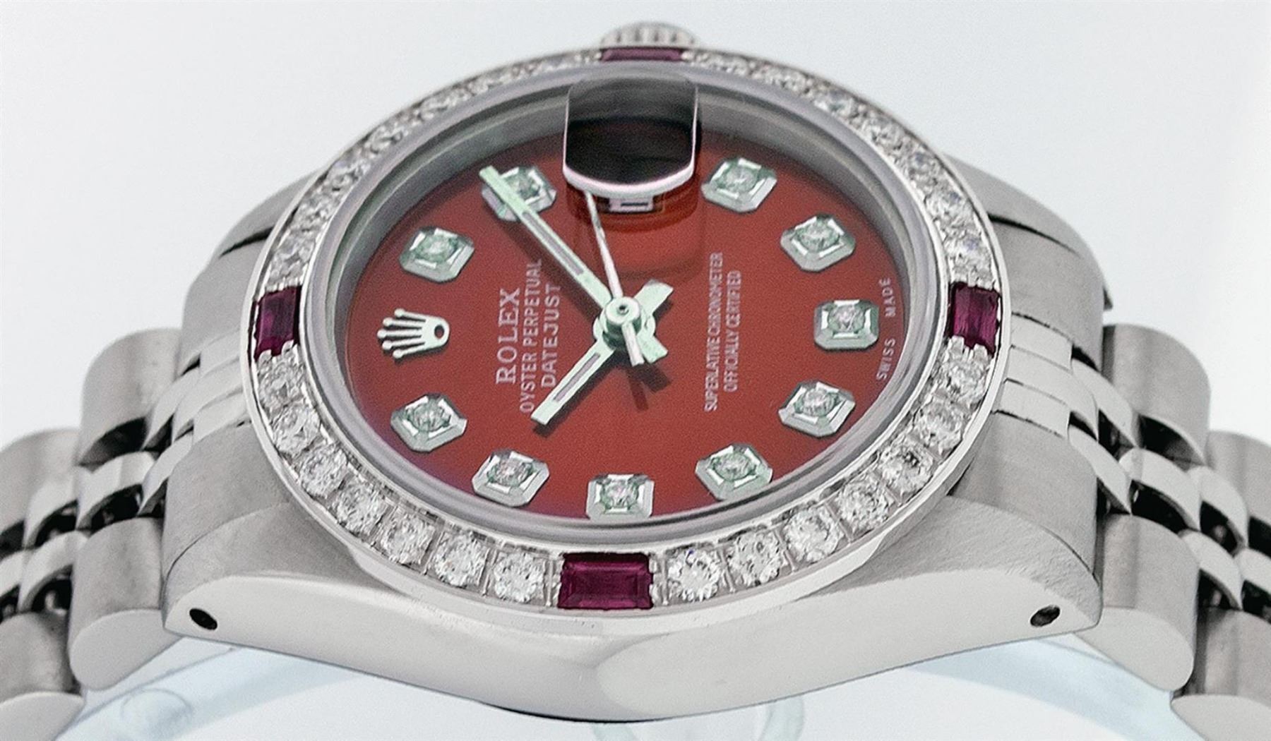 One Ladies Stainless Steel Rolex Datejust Polished Bright with Satin Finish, Serviced & Electronically Tested, Stainless Steel Case: 26mm, Stainless Steel Crown, Custom Bezel: New 18K White Gold Ruby Beadset Diamond Bezel, Diamond + Gem Count: 28 Diamonds + 4 Rubies. Total Weight .70 Carat, Clarity: SI-VS, Color: G to H. Custom Crystal: New Scratch Resistant Synthetic Sapphire Cyclops Lens. Custom Hands: New Luminescent Hands. Movement: Automatic Winding Movement. Custom Dial: Refinished Red With Diamond Hour Markers, 10 Diamonds in Dial G To H In Color, Clarity: SI-VS. Date Window: 3 O'Clock Position Date Display, Model: Datejust. Condition: G-6 Extra Fine. Bracelet: Stainless Steel Jubilee. Polish & Satin Finish. 6.0 Inch Length, Adjustable. Standard Clasp, With Rolex Logo. This Watch Has Been Serviced Time Tested And Is In Excellent Condition It Is Free Of All Scratches And Dents.